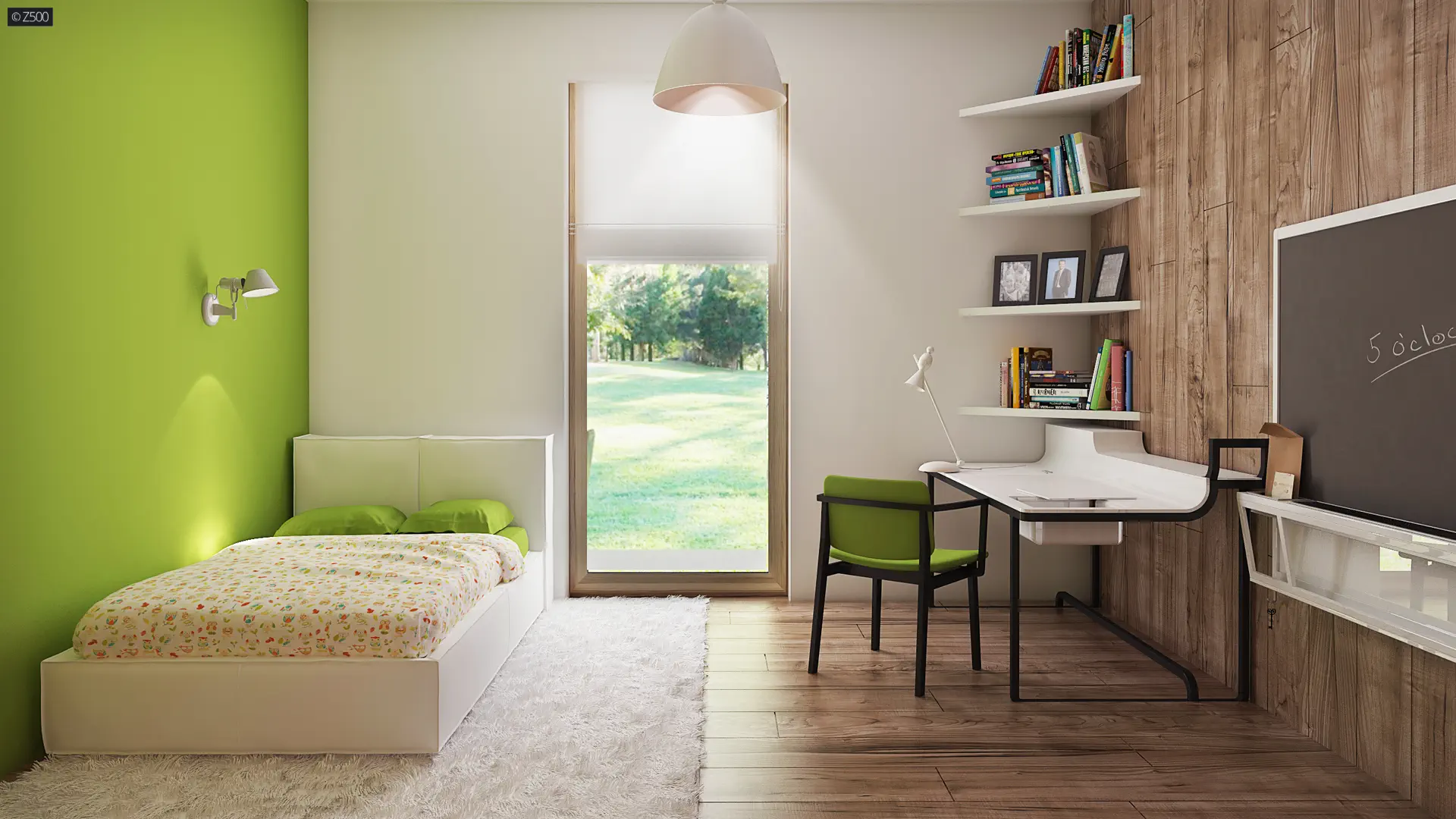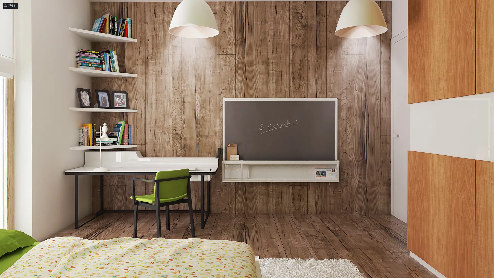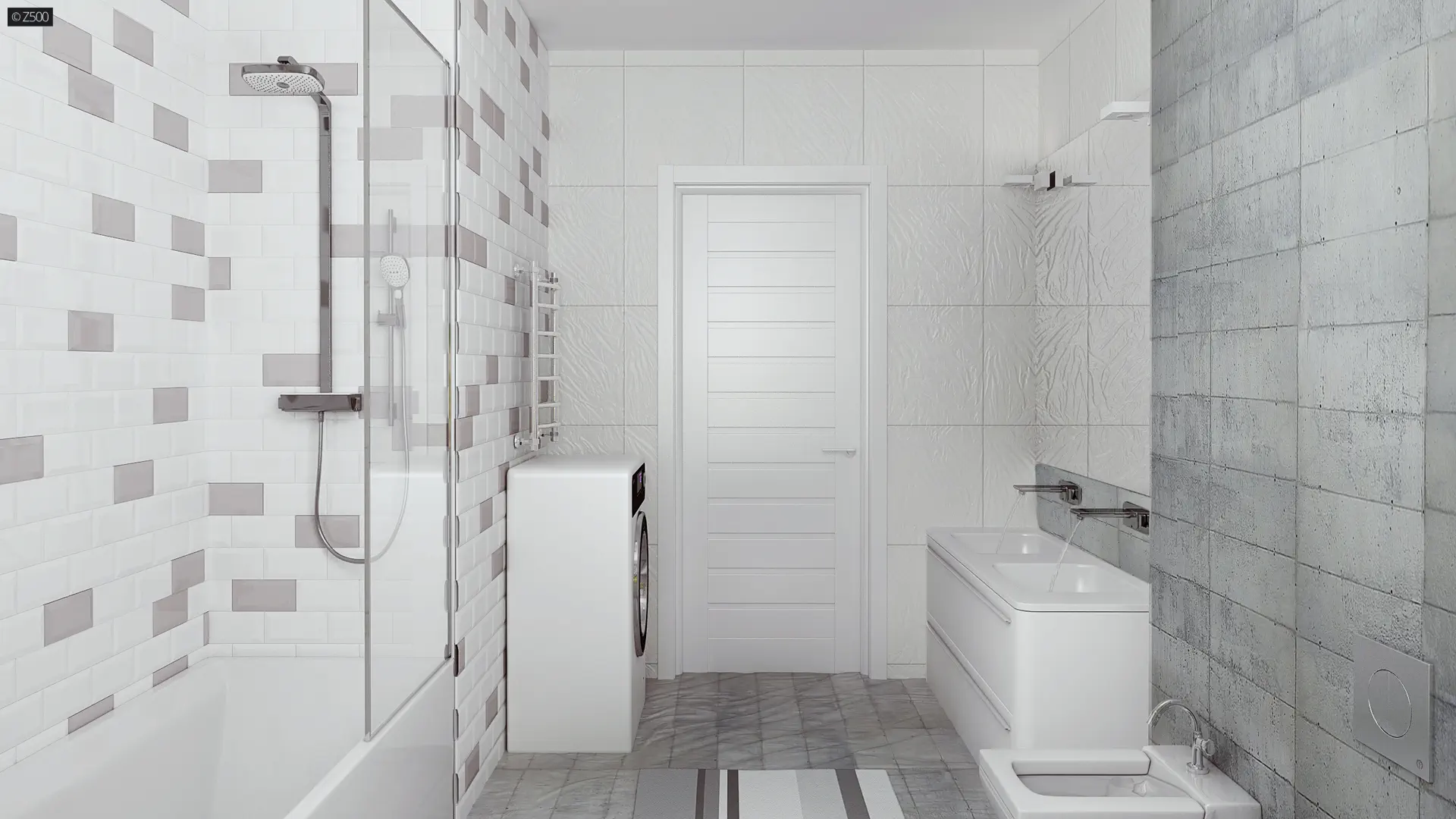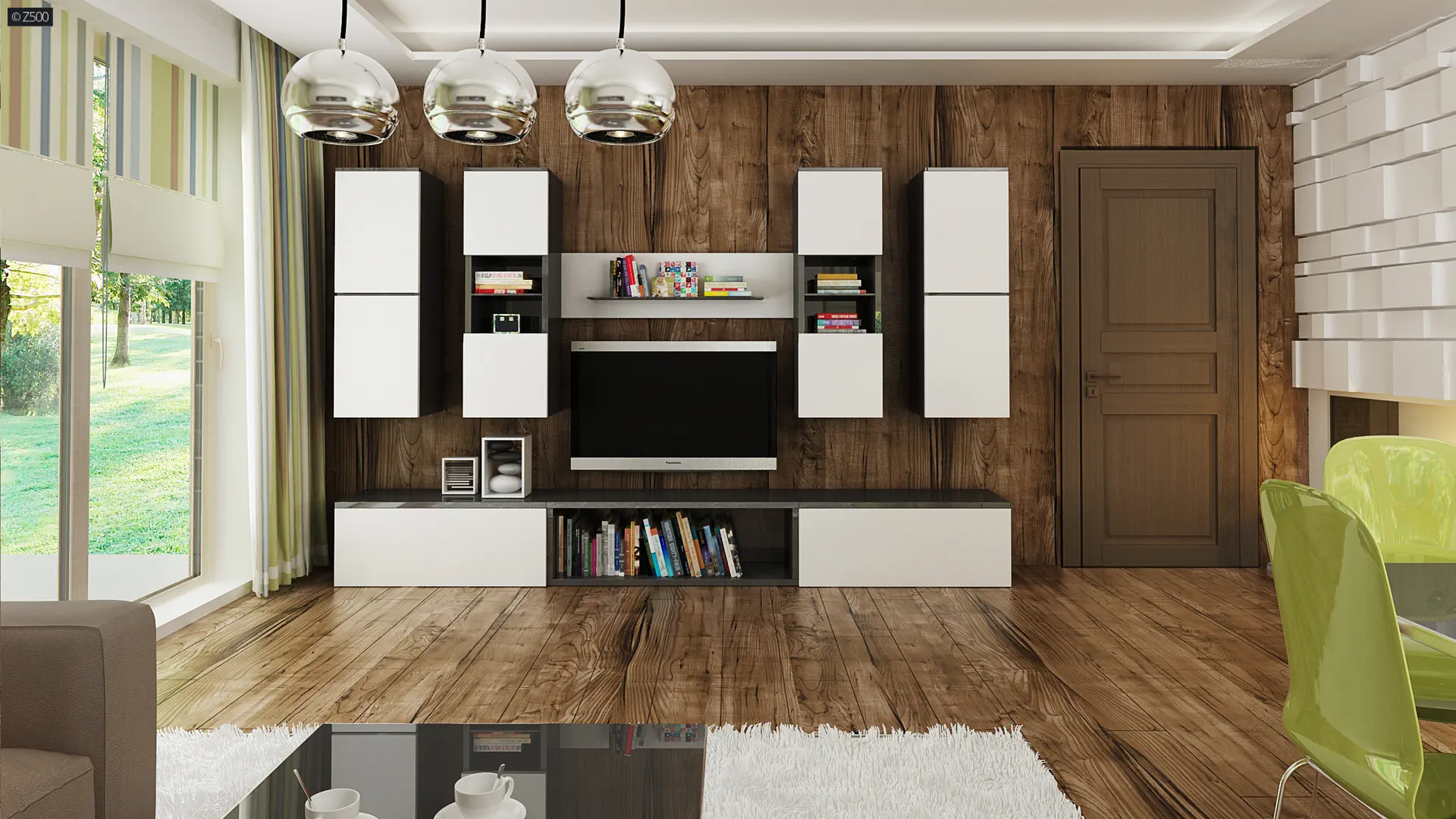 Propozycja parterowego domu z dachem dwuspadowym od Z500. Elewację wykończono prostymi elementami w postaci żaluzji, drewnianych paneli połączonych z elegancką bielą i szarością tynku.