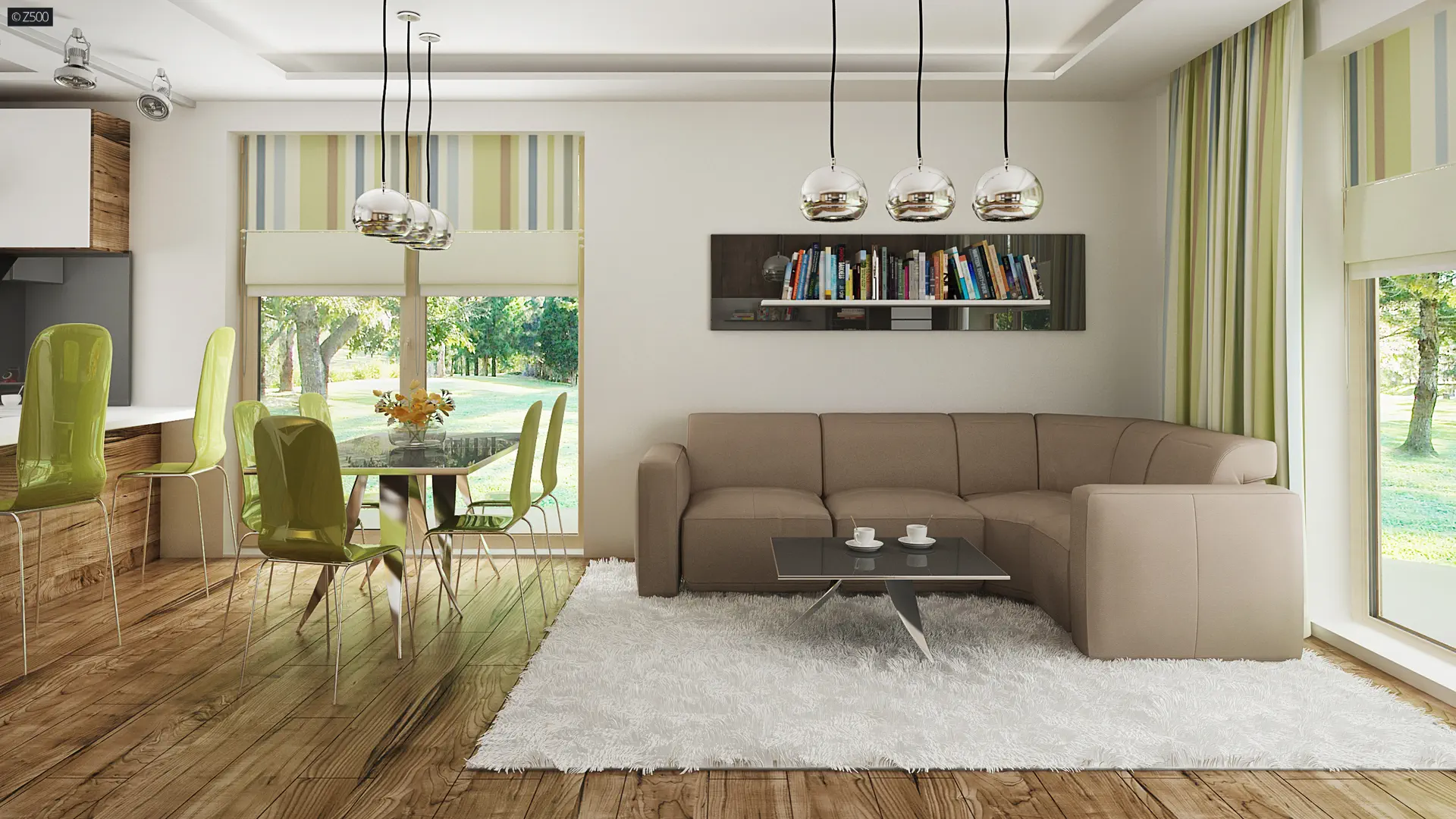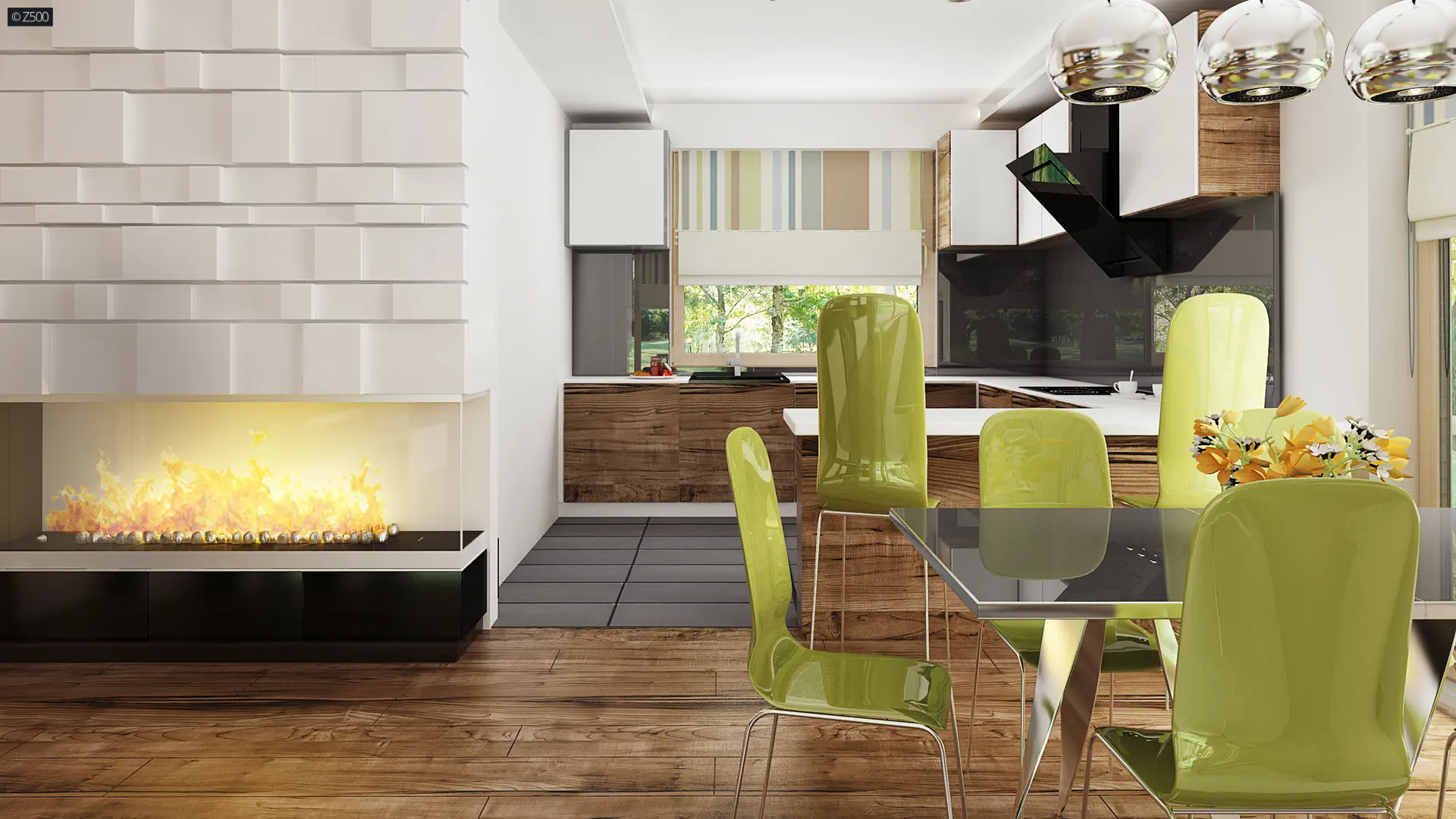 Z lewej strony zaprojektowano reprezentacyjny salon z jadalnią. Rozświetla go przeszklona ściana przesuwna i wyjście na taras, które latem stanowią przedłużenie salonu. Grillowanie i spotkania z przyjaciółmi będą prawdziwą przyjemnością. Otwarty aneks kuchenny optycznie powiększa przestrzeń a wysunięty blat kuchenny pełni funkcję podobną do funkcjonalnej wyspy kuchennej.