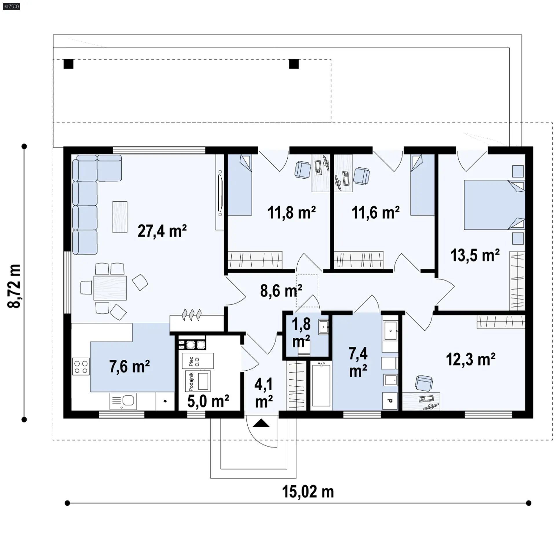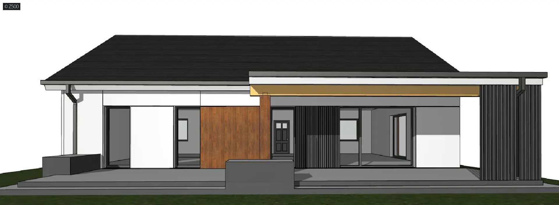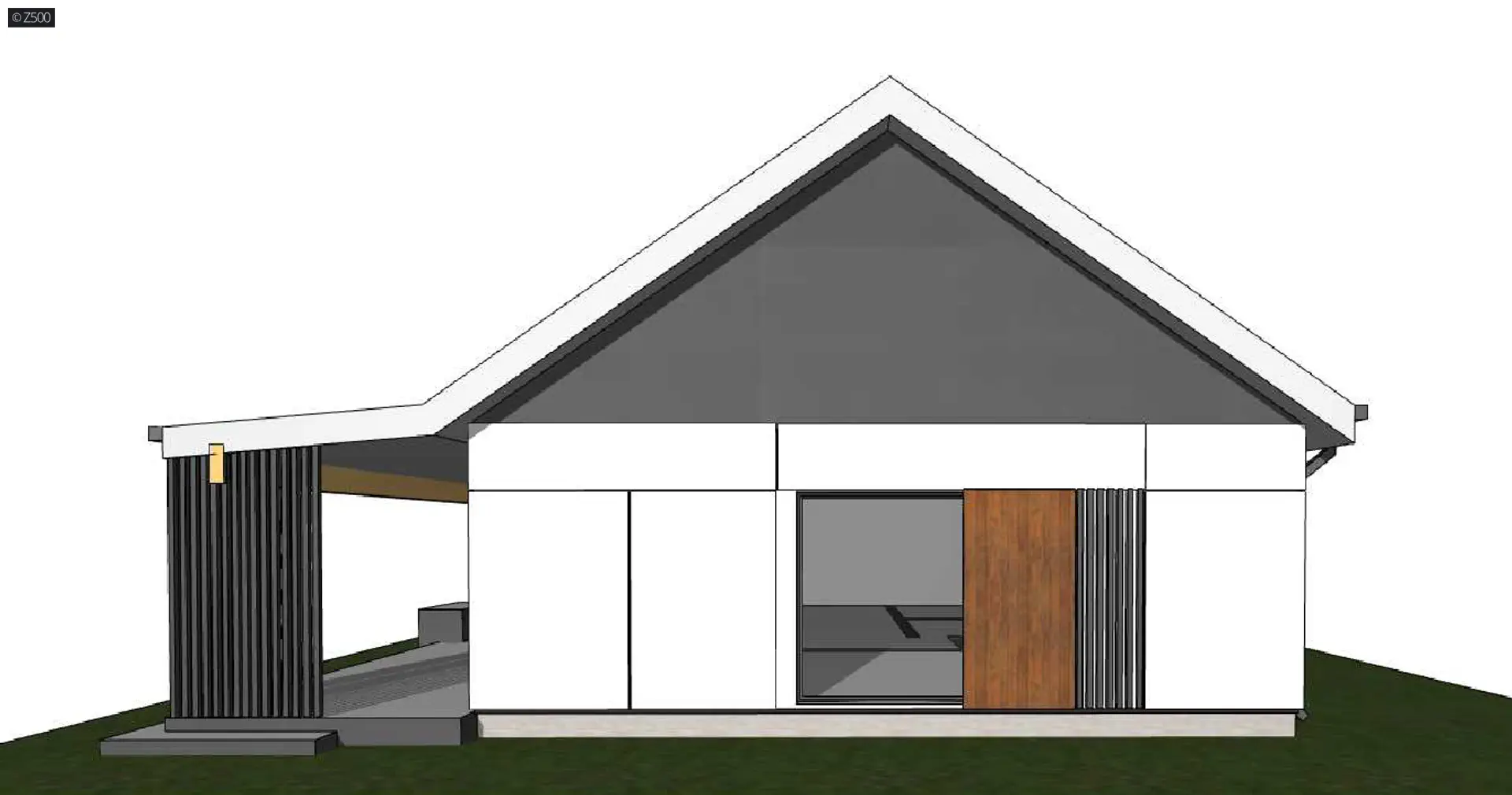 Z500 proponuje państwu parterowy dom z dachem dwuspadowym. Elewację wykończono prostymi elementami w postaci żaluzji, drewnianych paneli połączonych z elegancką bielą i szarością tynku. Z376 D 35 jest projektem szkieletowym, drewnianym.