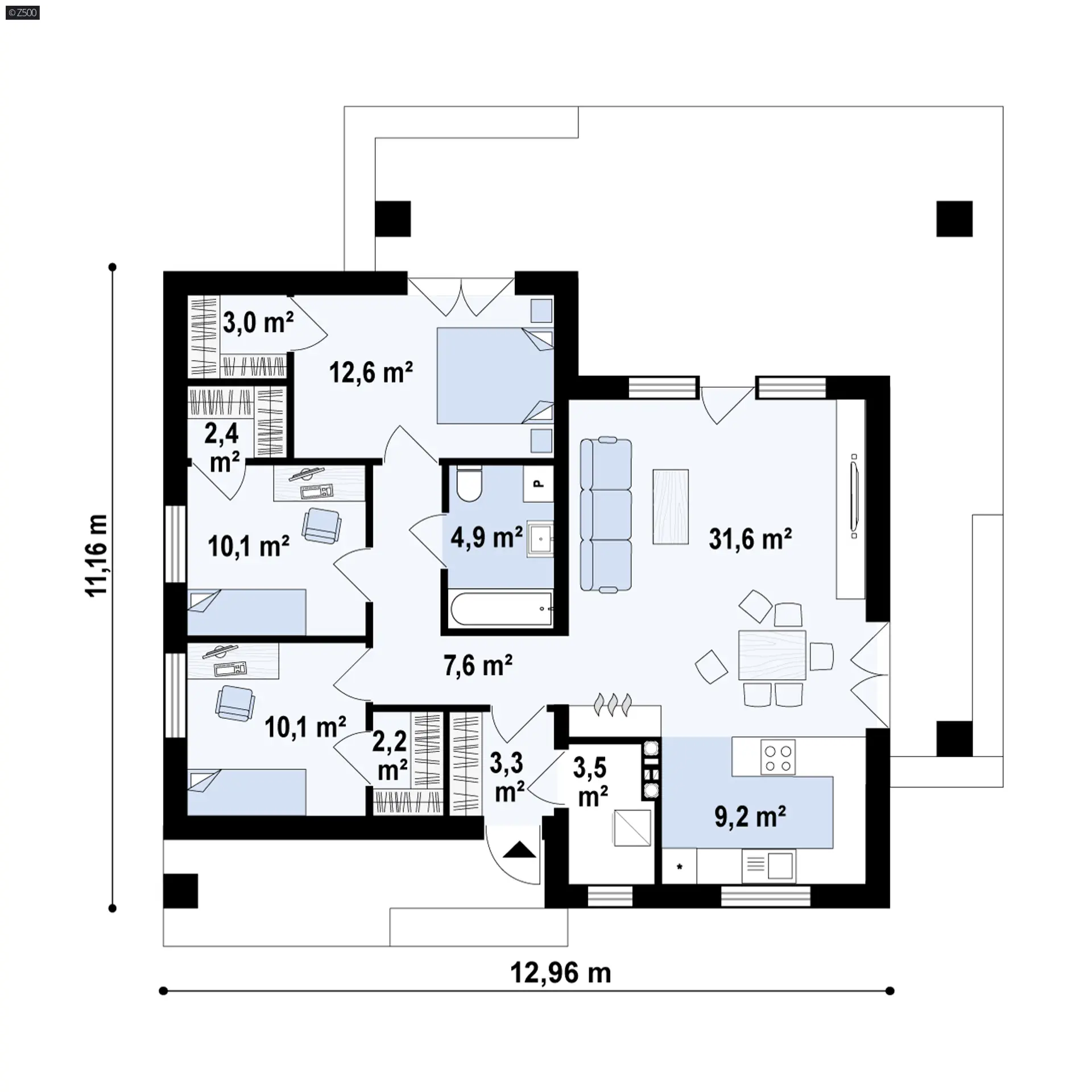 Dom parterowy z prywatnymi garderobami przy sypialniach i dachem kopertowym