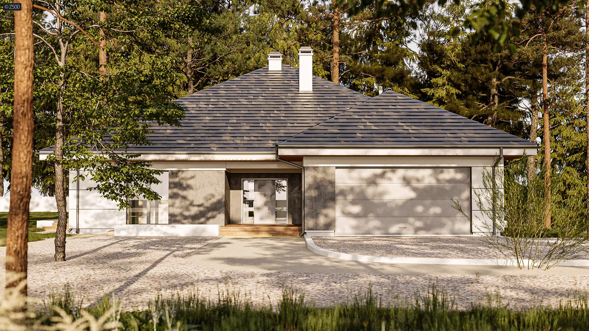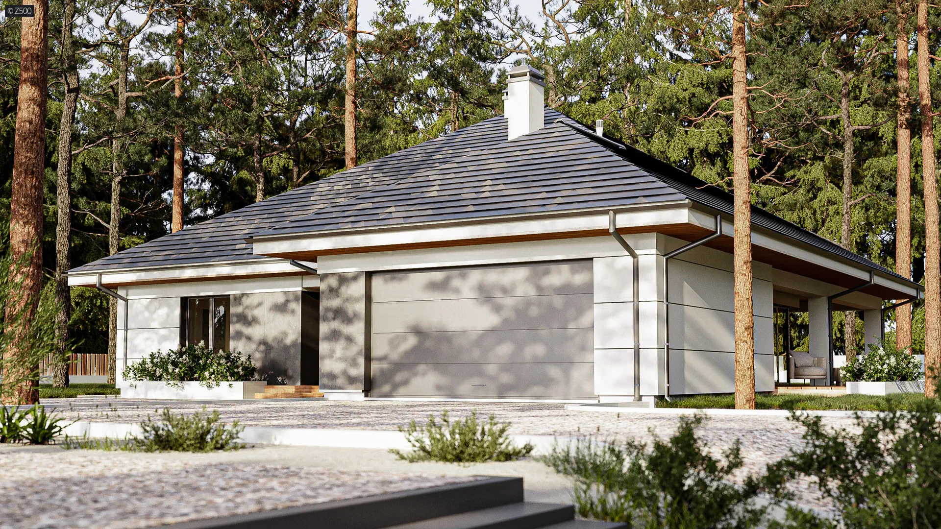 Z378 30 to propozycja współczesnego domu parterowego z dachem wielospadowym o nachyleniu 30 stopni i garażem dwustanowiskowym. Wykończony białym tynkiem z dodatkiem boniowania, delikatnym gzymsem oraz czarnym betonem architektonicznym. Dodatkowo podcień wejściowy nadaje uroku całości bryły.