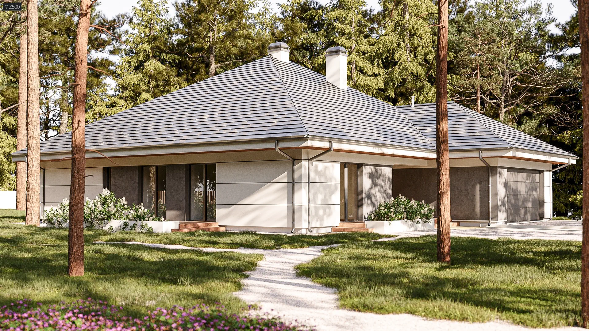Reprezentacyjny dom parterowy z dachem wielospadowym i garażem dwustanowiskowym