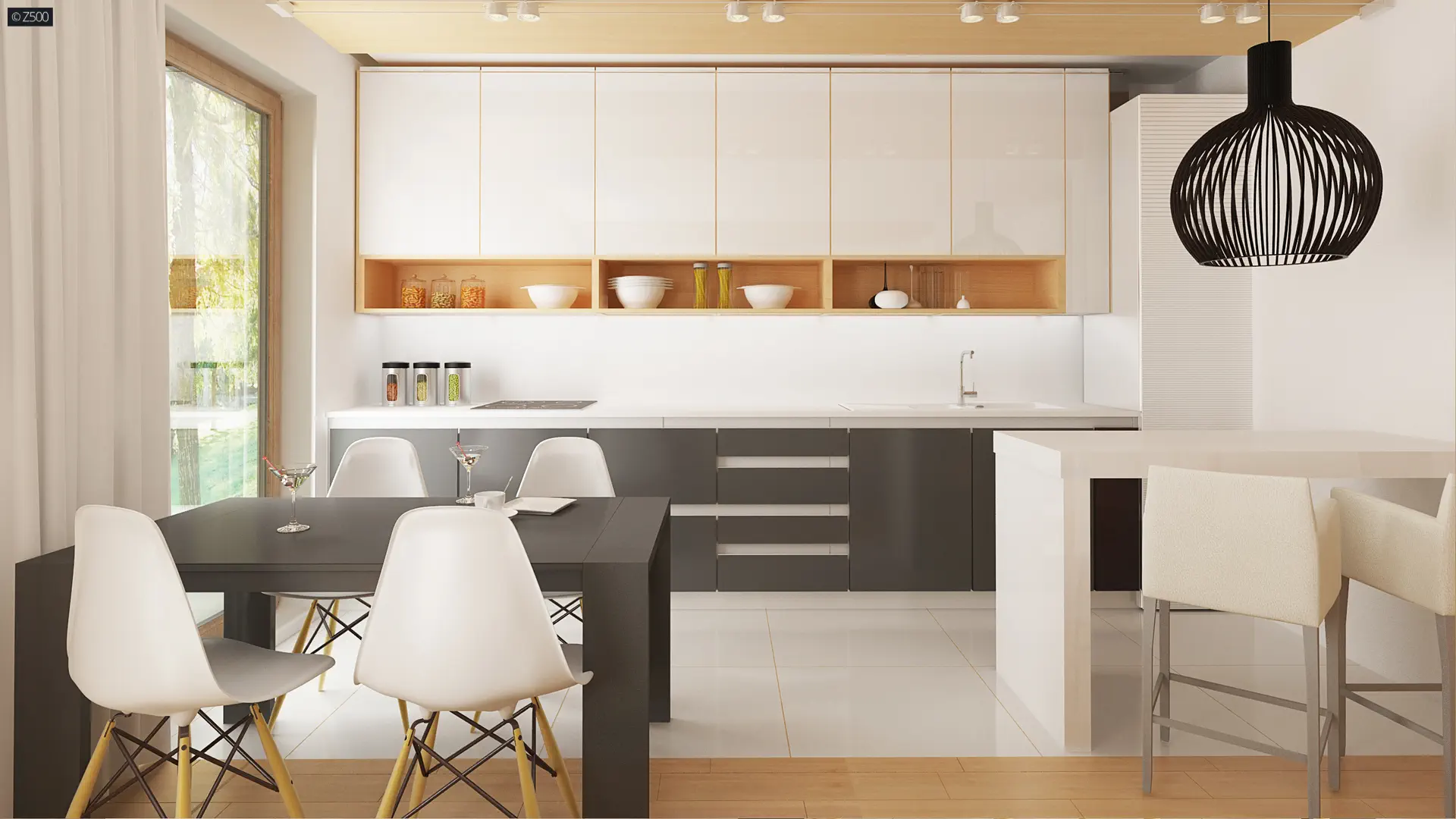 Na parterze znajduje się przestronny salon połączony z kuchnią i jadalnią, tworzący otwartą strefę dzienną z dostępem do tarasu. Duże przeszklenia zapewniają doskonałe doświetlenie wnętrza, a kominek dodaje przytulności i stanowi centralny punkt salonu. Kuchnia została ergonomicznie zaprojektowana i sąsiaduje bezpośrednio z częścią jadalnianą, gdzie znajduje się wygodny stół rodzinny. Dodatkowy pokój na parterze świetnie sprawdzi się jako gabinet, pokój gościnny lub sypialnia seniora. Znajdziemy tu również łazienkę oraz praktyczne pomieszczenie gospodarcze, które pomieści np. pralkę czy piec C.O.