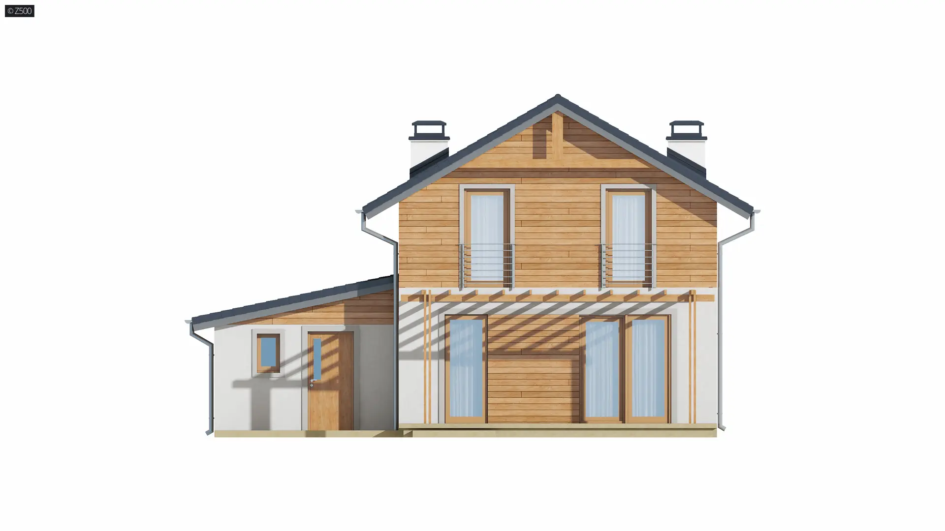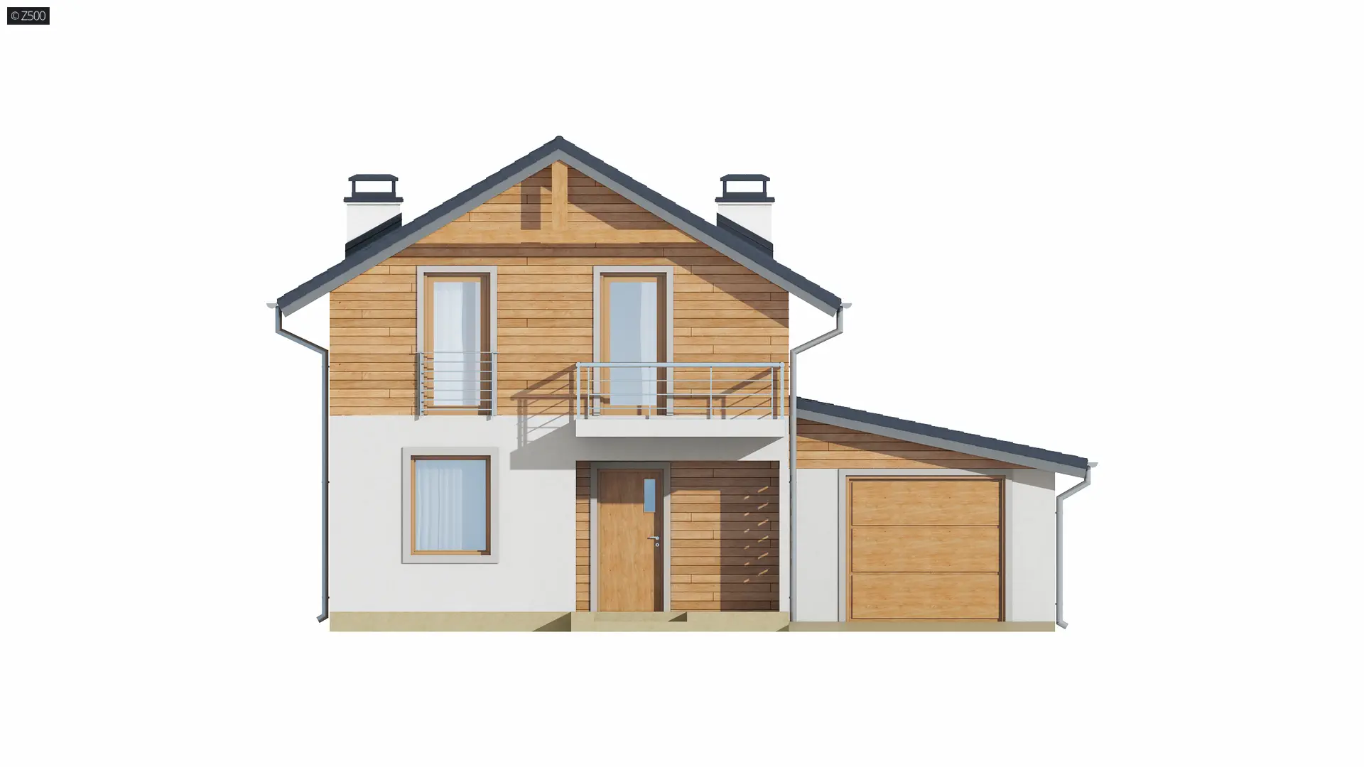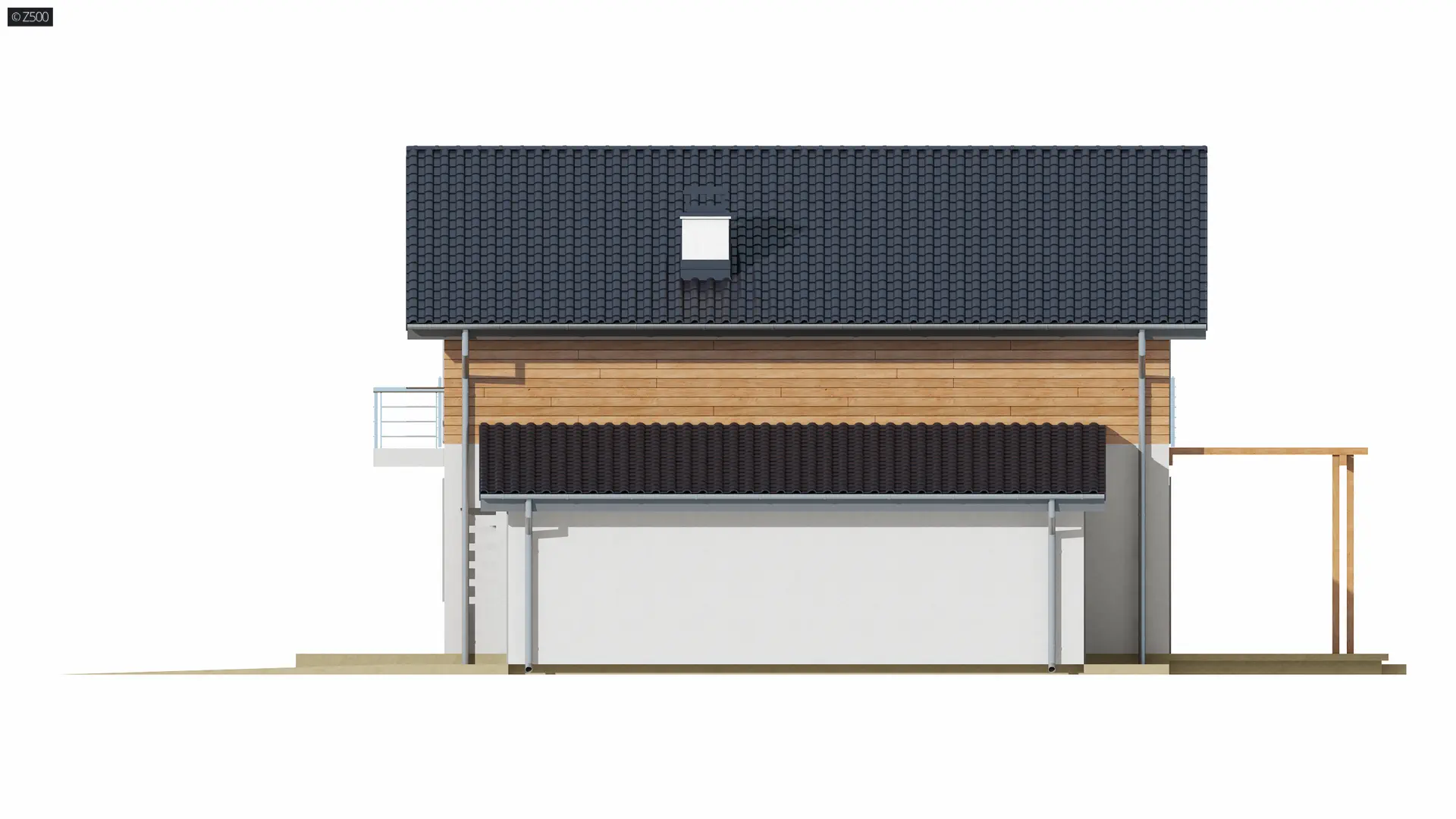 Wersja w technologii szkieletowej z dostawionym garażem po prawej stronie z dachem pulpitowym.