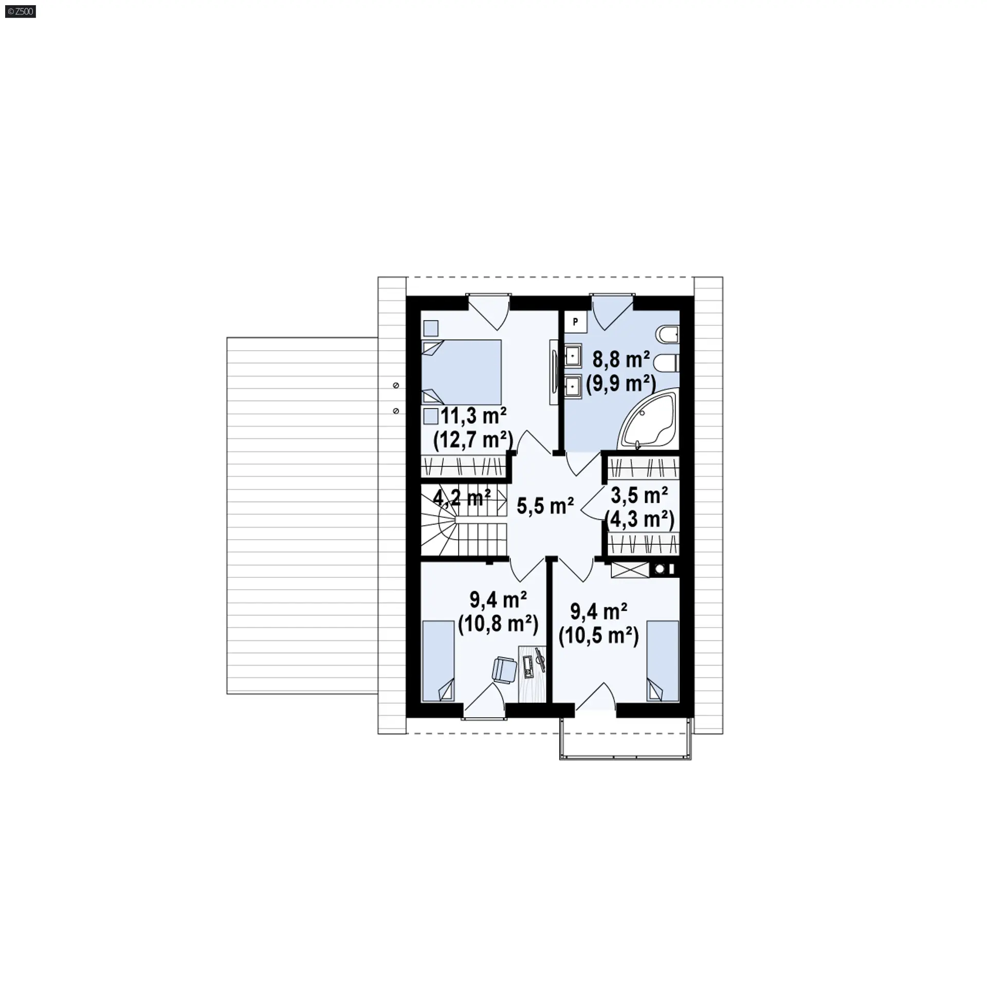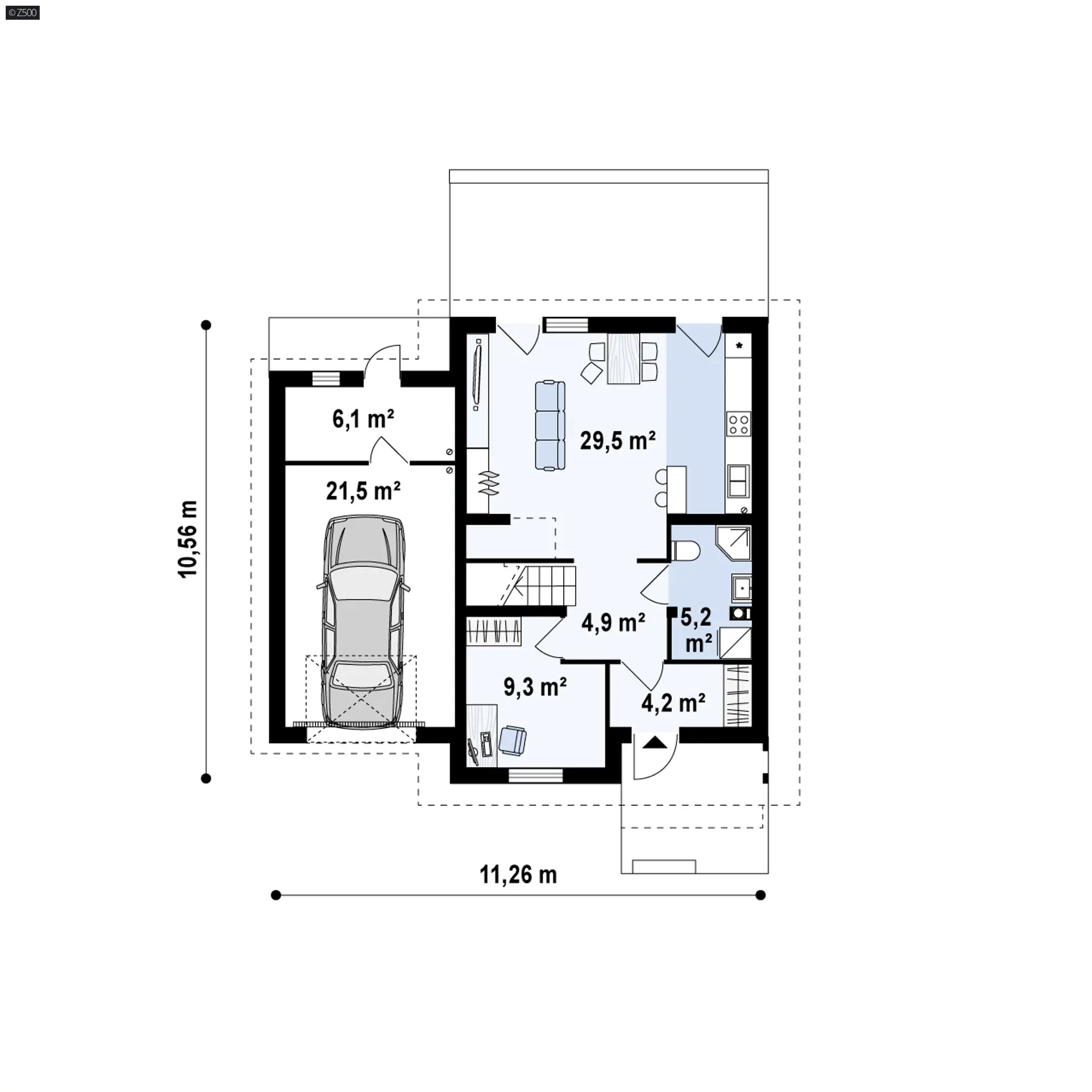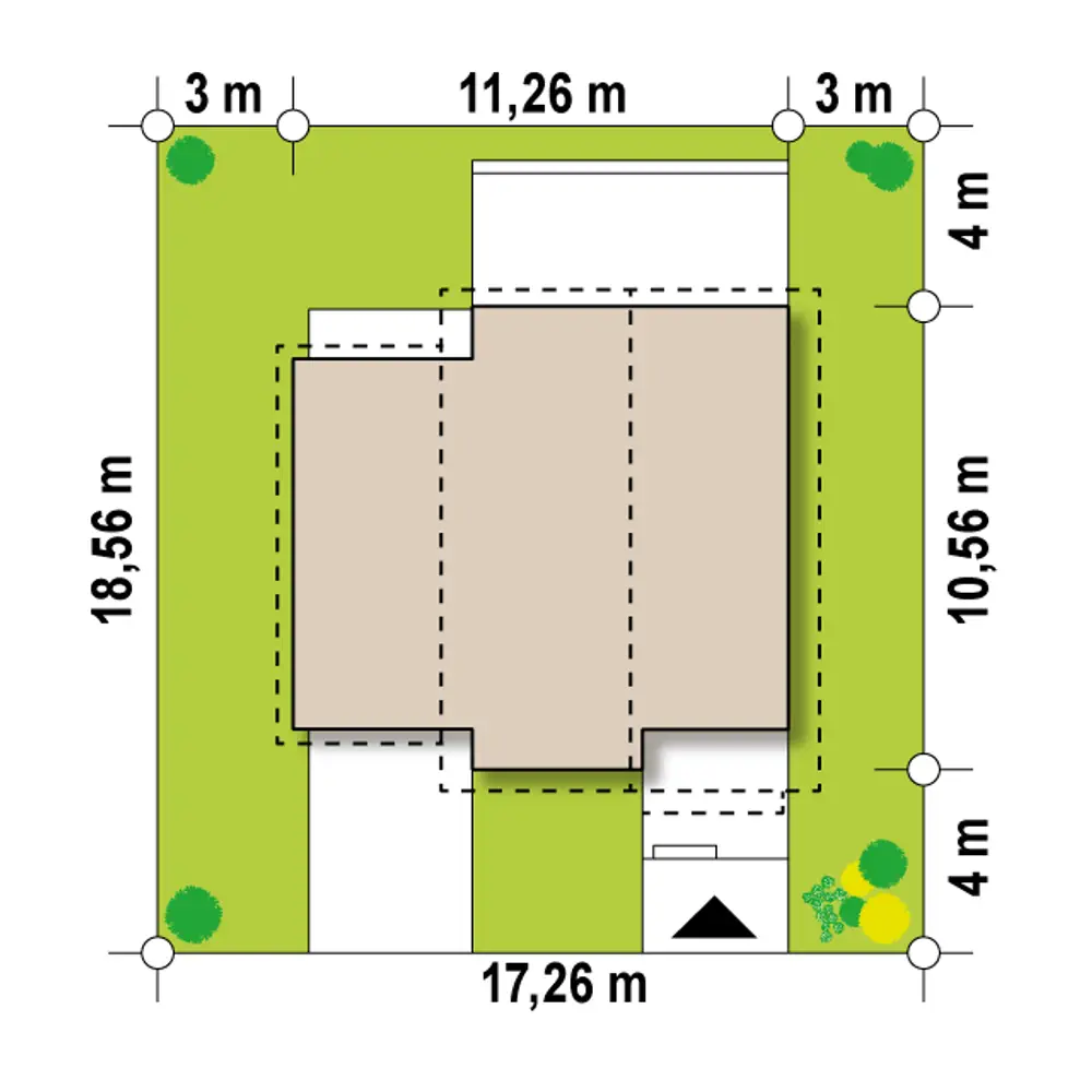 Wariant Z38 stu GL zaprojektowany został całkowicie w technologii murowanej ze stropem TERIVA. Po lewej stronie budynku znajduje się garaż jednostanowiskowy.