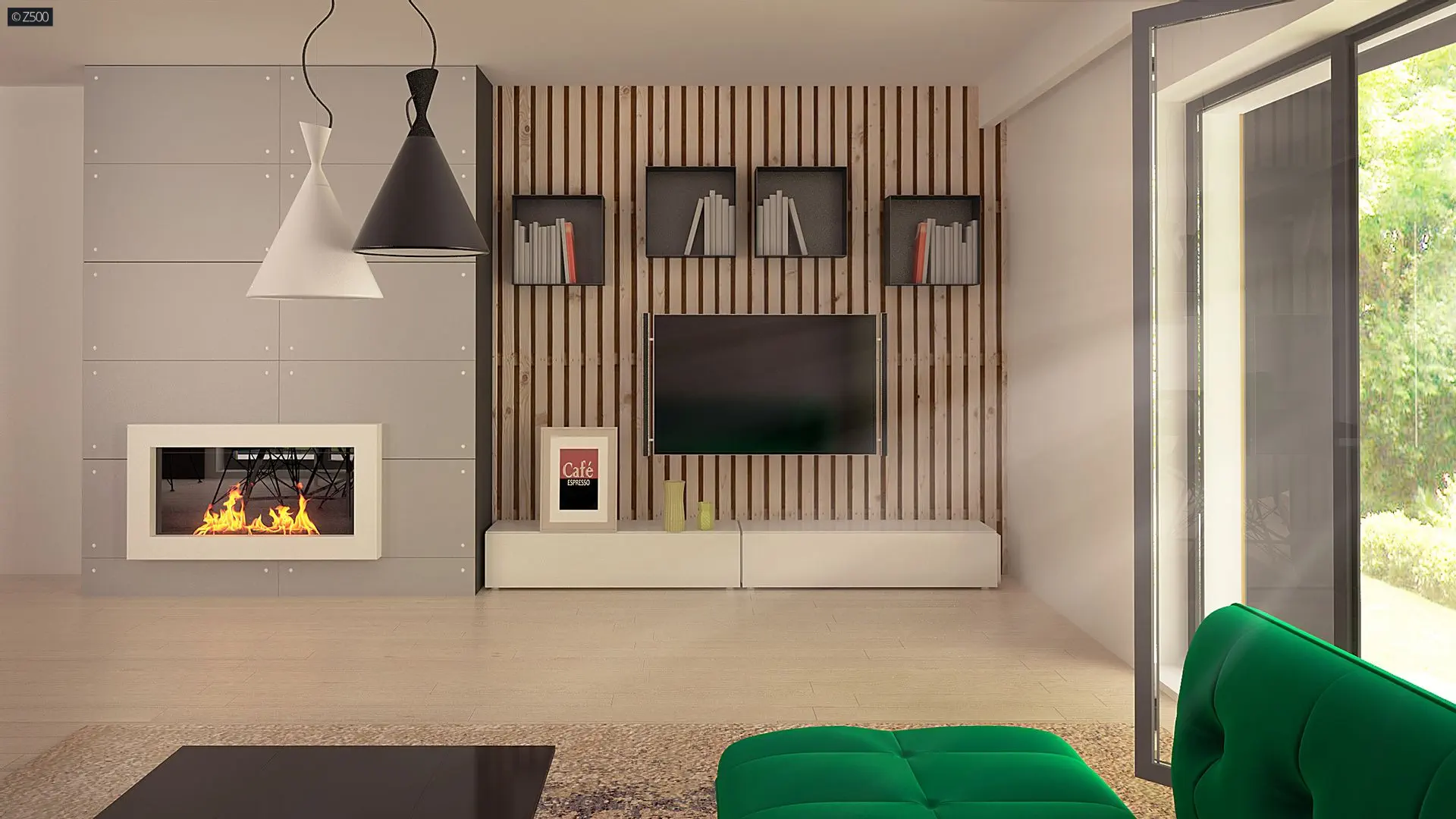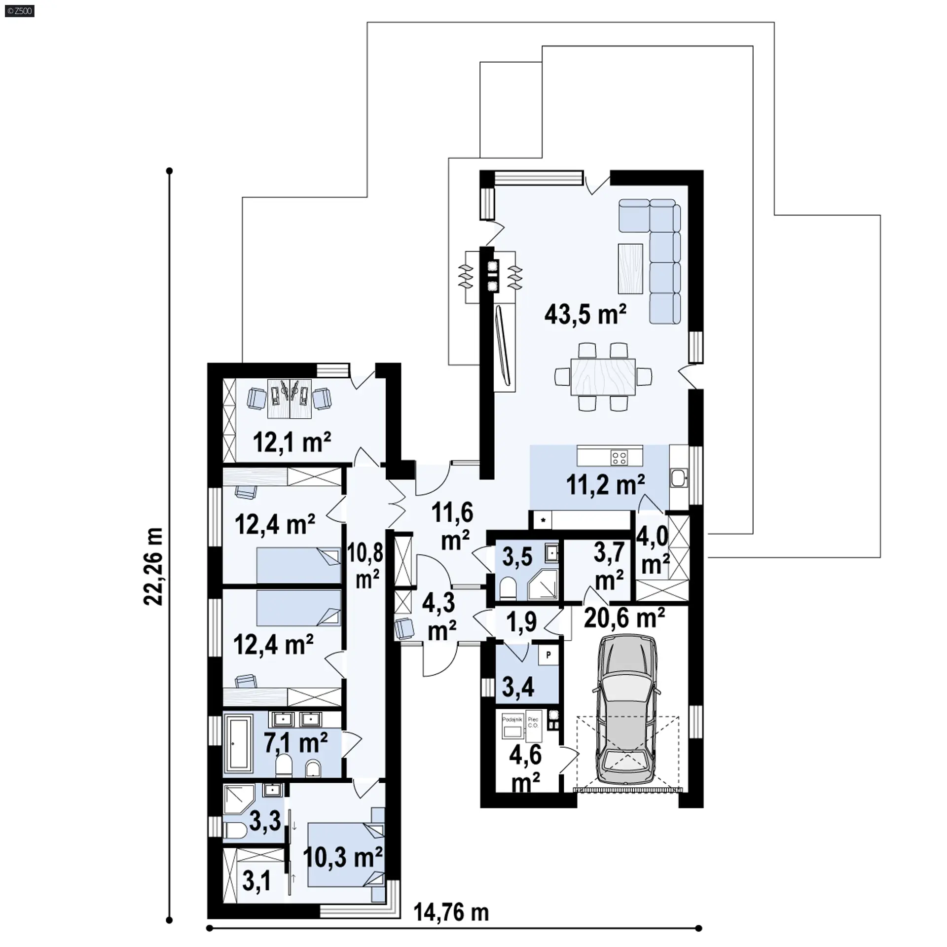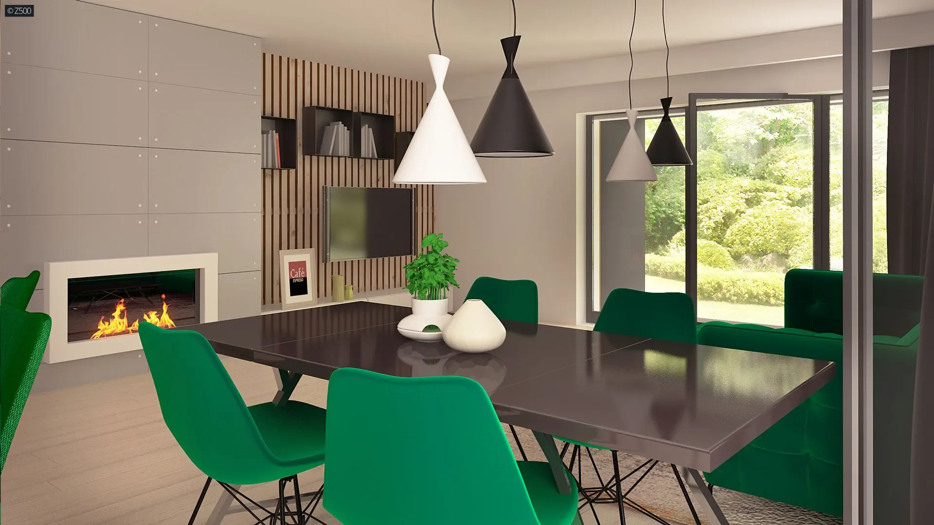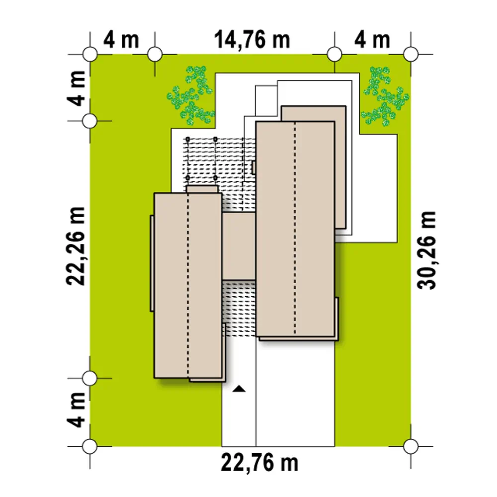 Strefa dzienna została umieszczona w prawym budynku i otwarta na ogród. Garaż od frontu na dwa samochody z którego bezpośrednio możemy udać się zarówno do sieni lub spiżarni, gdy akurat wróciliśmy z zakupów będzie niewątpliwie dużym atutem.