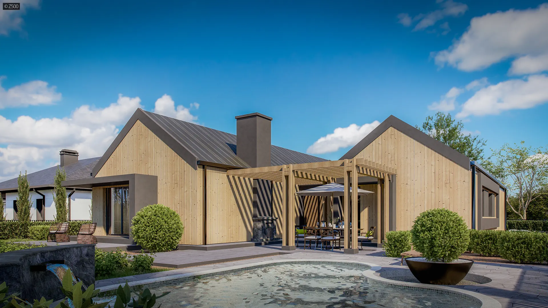 Z388 B to powiększony wariant projektu z przeprojektowanym układem funkcjonalnym. Garaż zmniejszono do jednego stanowiska oraz doprojektowano pomieszczenie gospodarcze, pralnie oraz schowek. Wariant został powiększony o jeden pokój oraz powiększony został salon z jadalną.