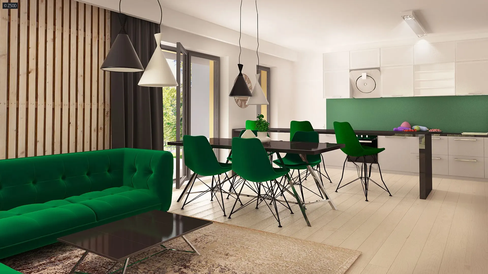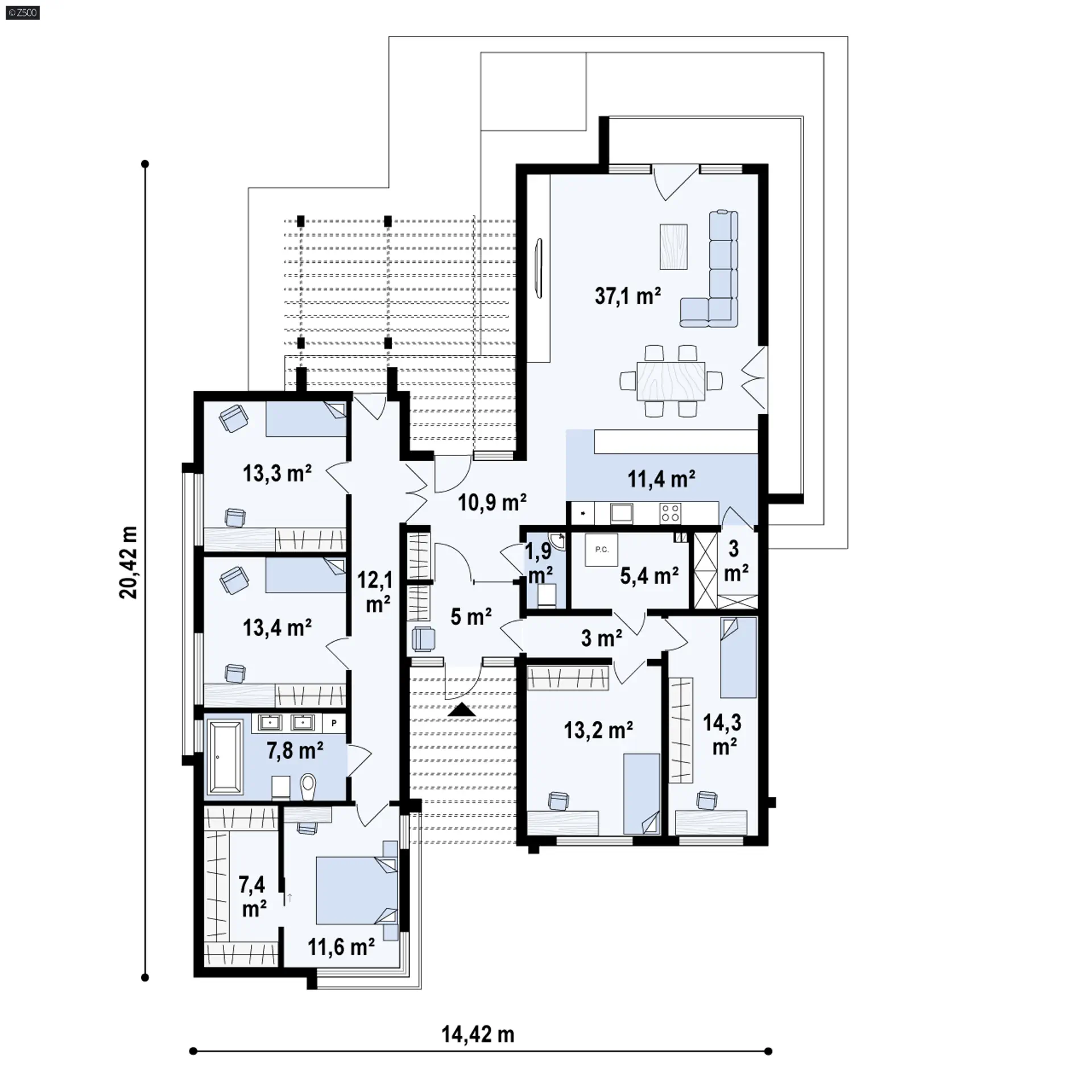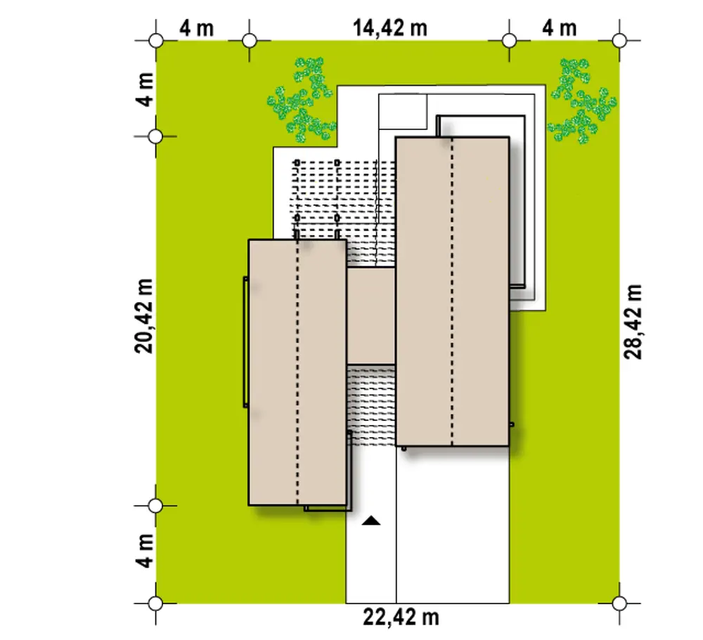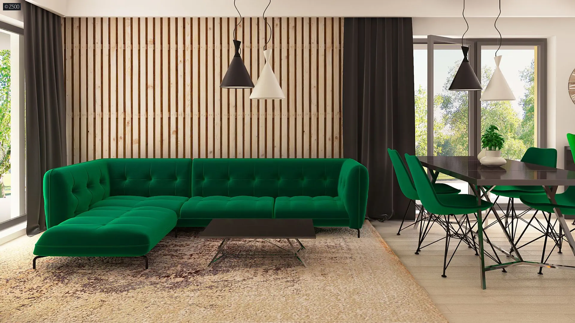 Wariant projektu Z388 D ze zmienionym układem wnętrza i garażem zaadaptowanym na dodatkowe pokoje. Propozycja wyraźnego podziału domu na dwie części. Budynek jest oryginalny i wyrazisty. Na elewacji ułożono pionowe drewniane deski, natomiast dach wykończono blacho-dachówką na zakładkę.