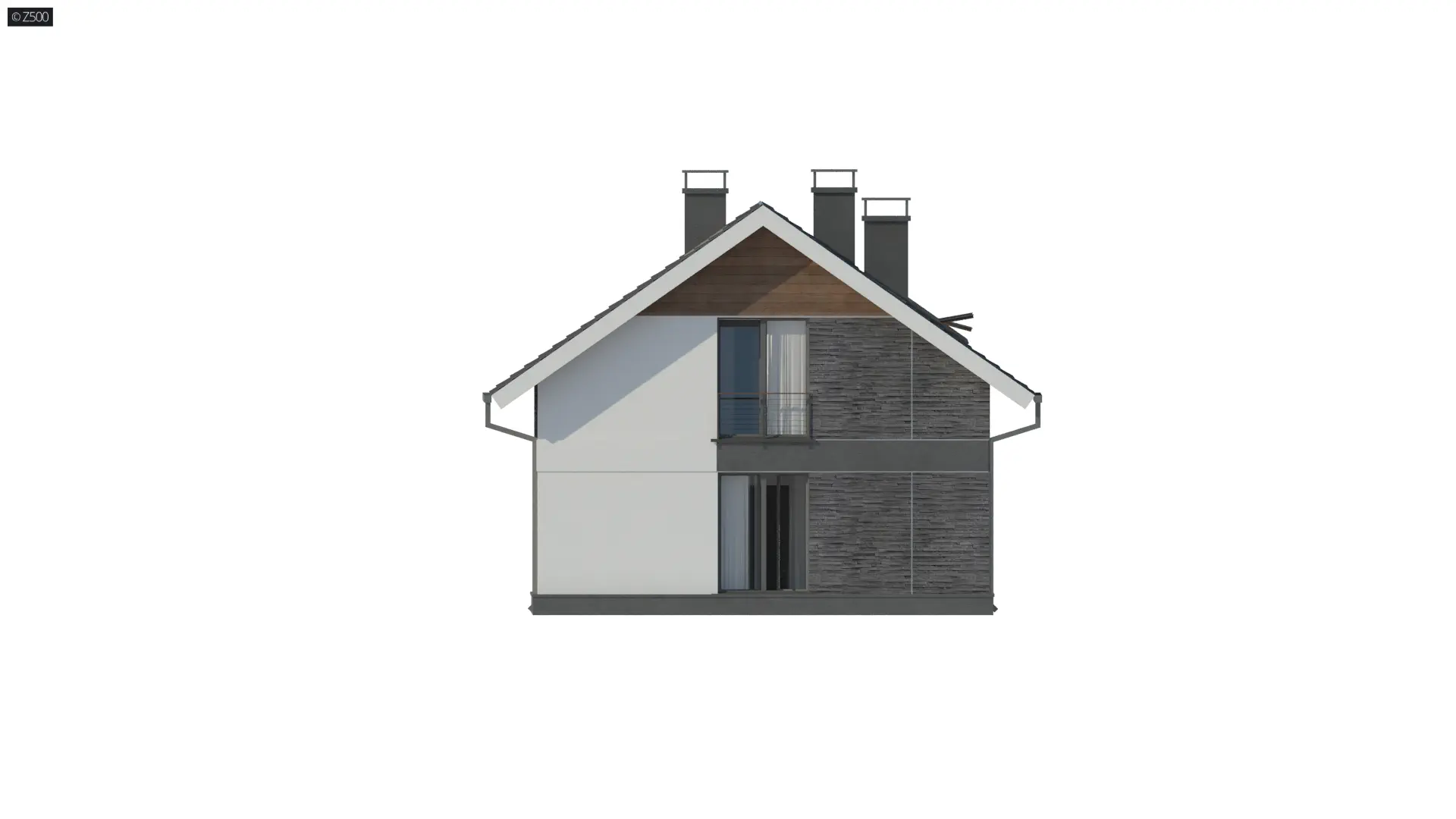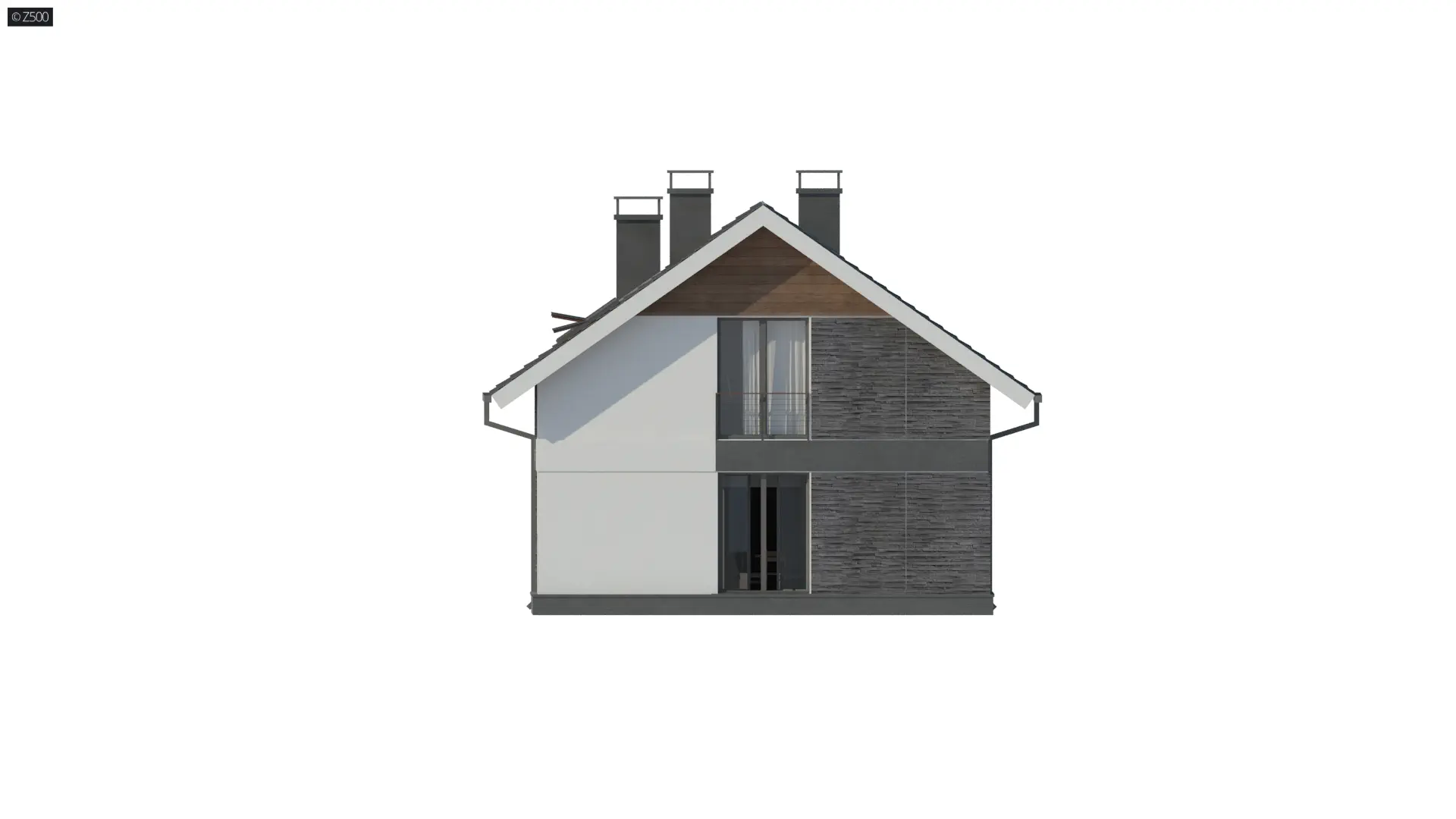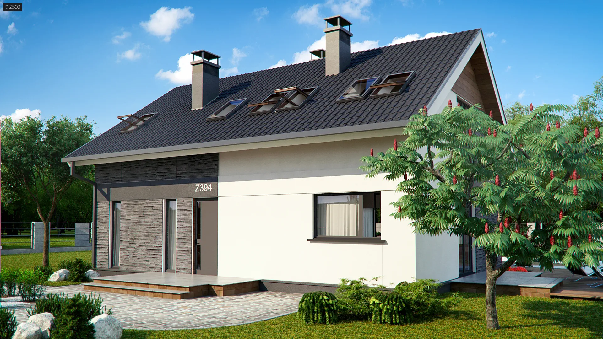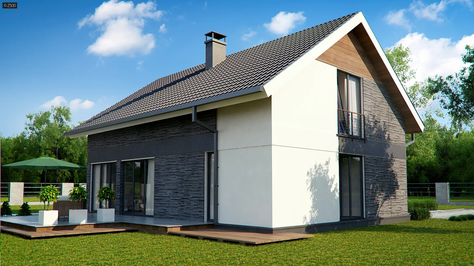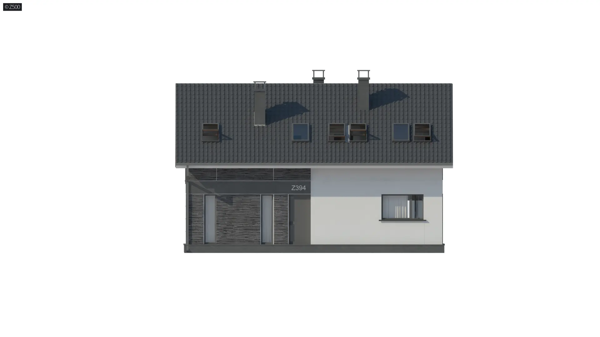 Z394 jest propozycją niedużego, domu jednorodzinnego z dachem dwuspadowym. Elewację skomponowano z trzech rodzajów materiałów. Składają się na nią: biały tynk, okładzina kamienna, którą pokryto dwa z czterech narożników domu, oraz okładzina drewniana pod okapem w górnej części elewacji.