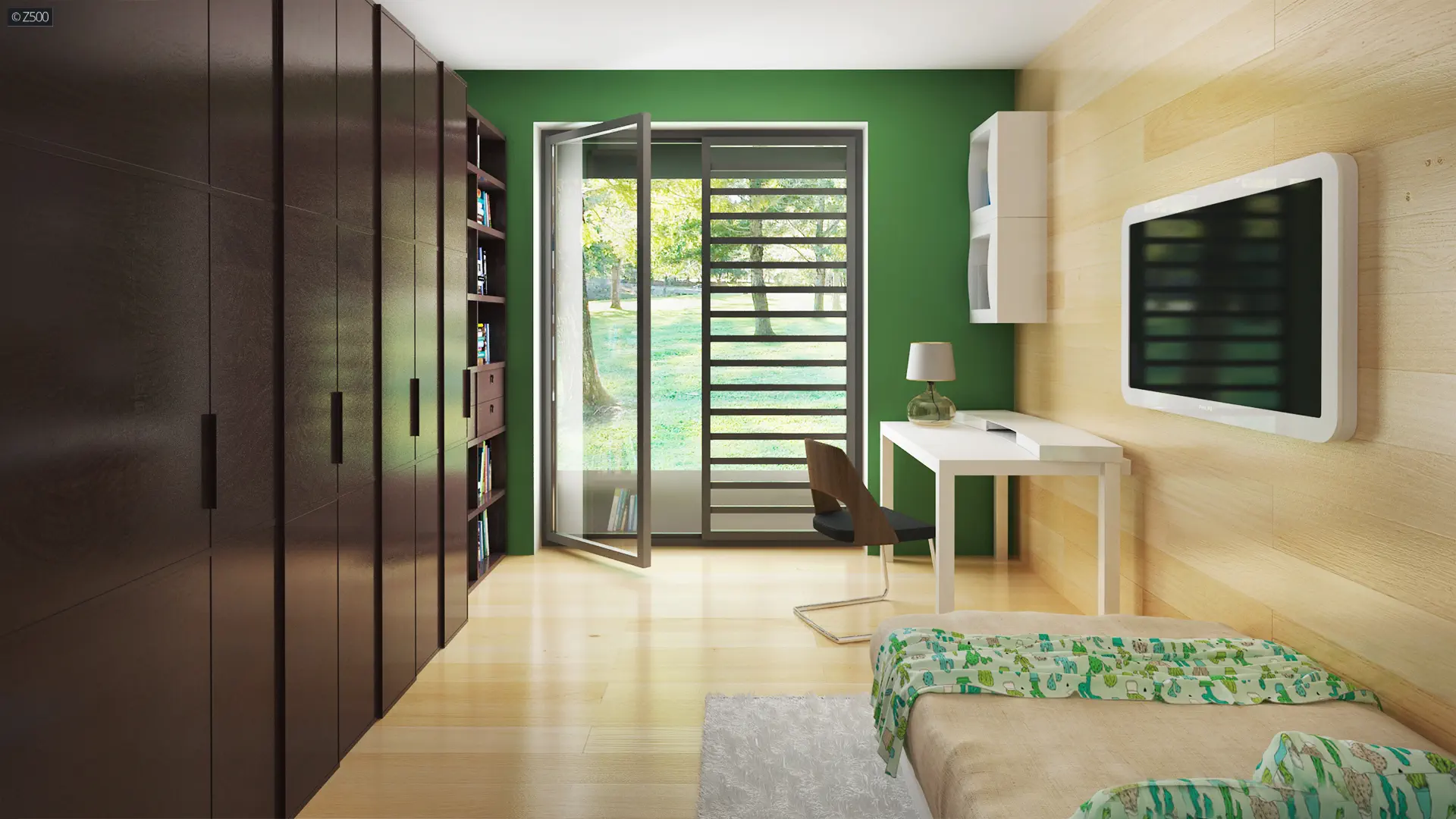 W strefie nocnej zaprojektowano 4 pokoje – 3 dla dzieci oraz 1 master bedroom dla rodziców z prywatną łazienką i garderobą.