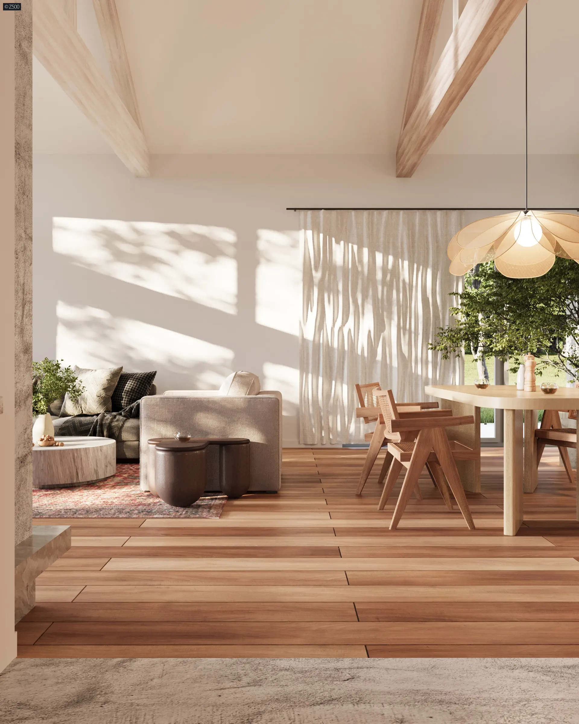 Zarówno od strony salonu, jak i jadalni, wstawiono przeszklone ściany przesuwne, dające szklany efekt wejścia w ogród. Dostarczają one ogromną ilość światła dziennego. Stanowią również otwierana na oścież barierę, powiększającą strefę dzienną o przestrzeń tarasową. Rozłożystość tarasu frontowego lub frontowo-bocznego można dobrać, w zależności od przestrzeni działki i jej warunków, szerokości i odległości oddalenia od działki sąsiada.
