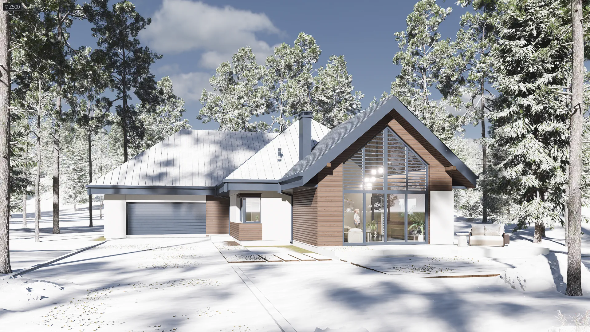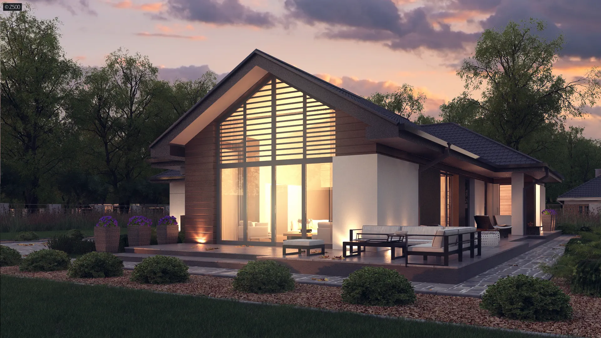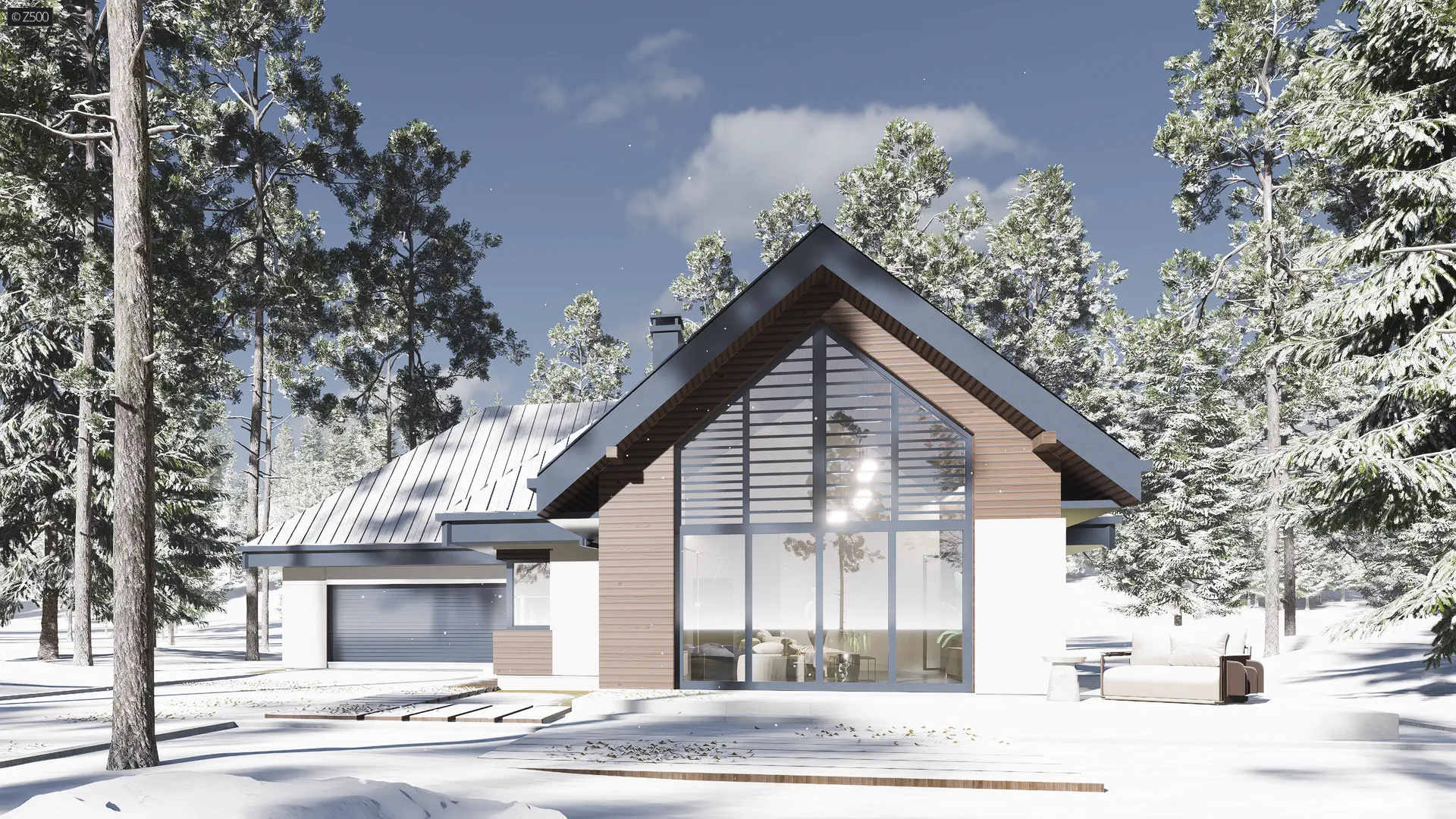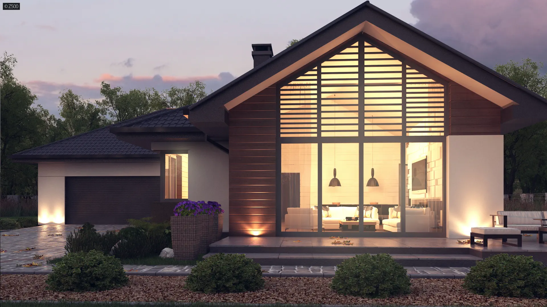 Usytuowanie salonu od frontu stanowi unikalność projektu, ponieważ w zależności od typu działki, bywają sytuacje, gdy roztropniej jest umieścić salon w prezentowany przez Z500 sposób.