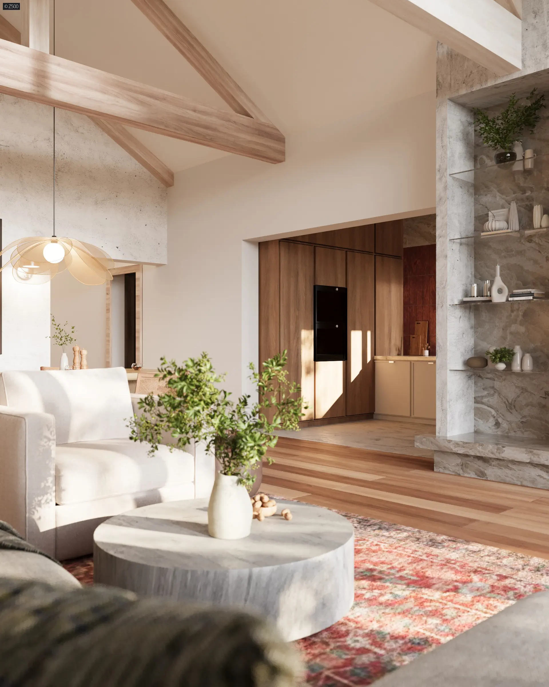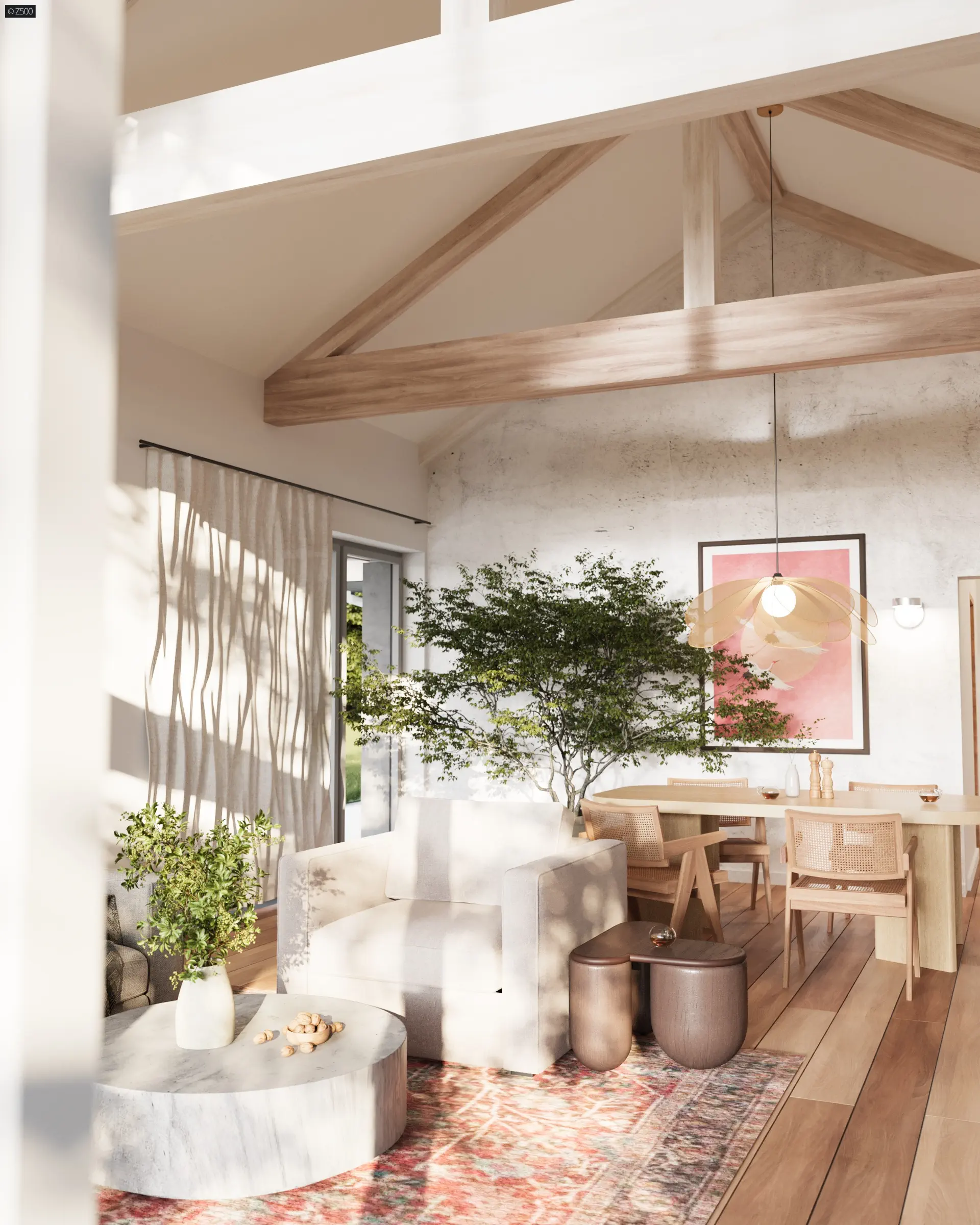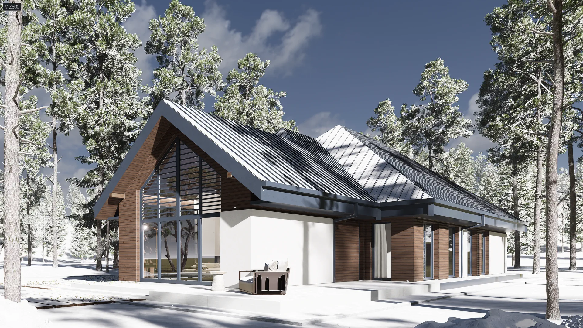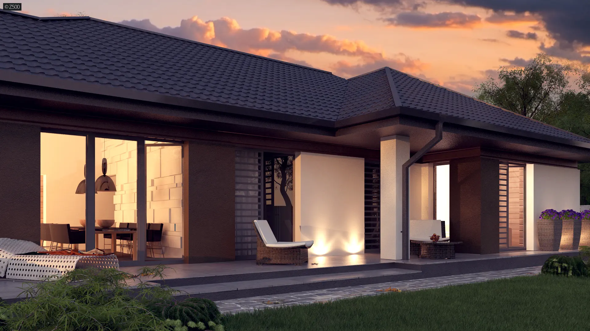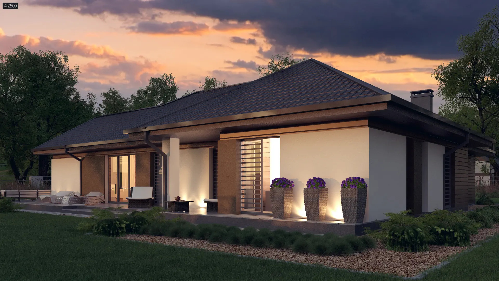 Usytuowanie salonu od frontu stanowi unikalność projektu, ponieważ w zależności od typu działki, bywają sytuacje, gdy roztropniej jest umieścić salon w prezentowany przez Z500 sposób.
