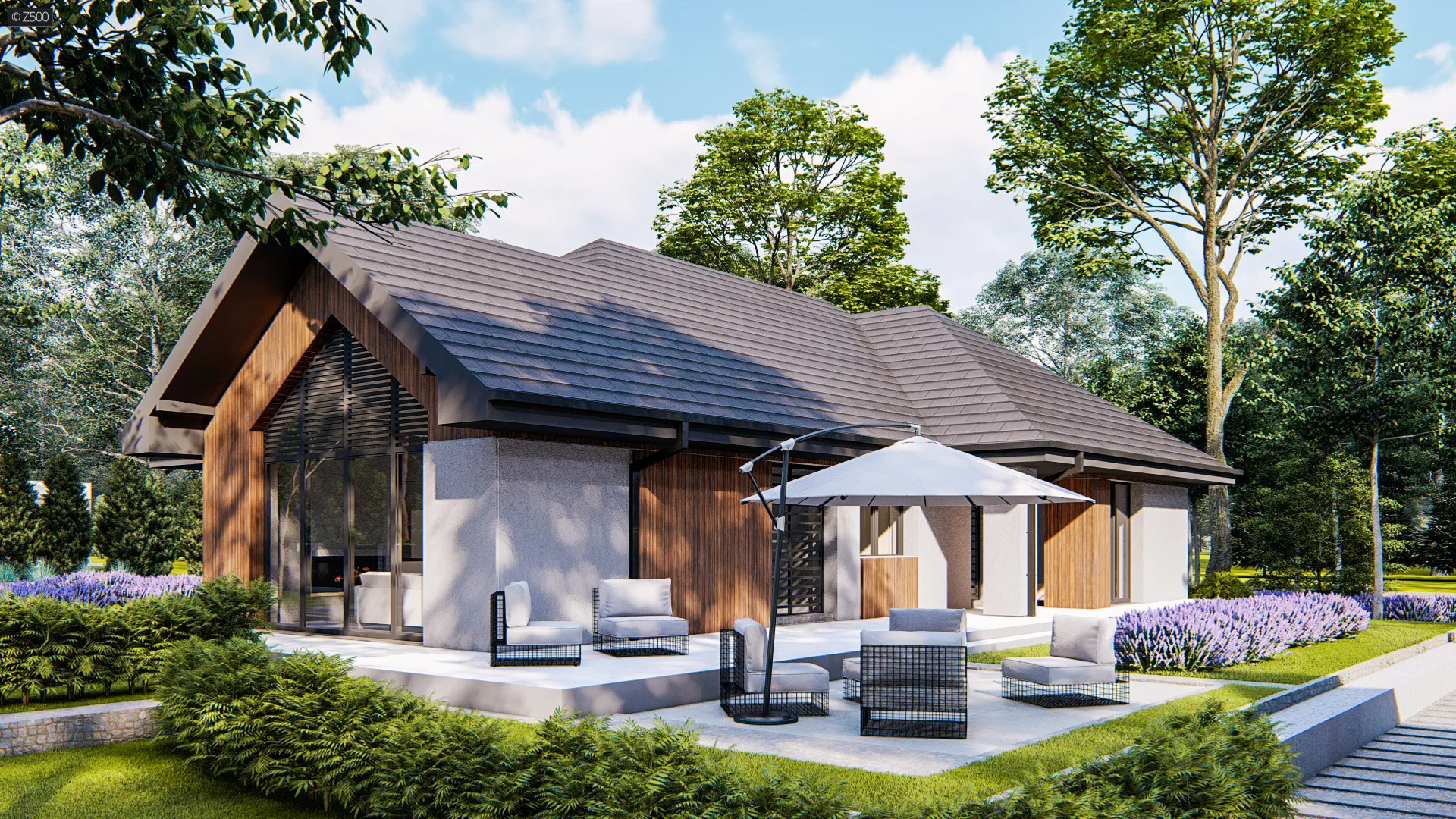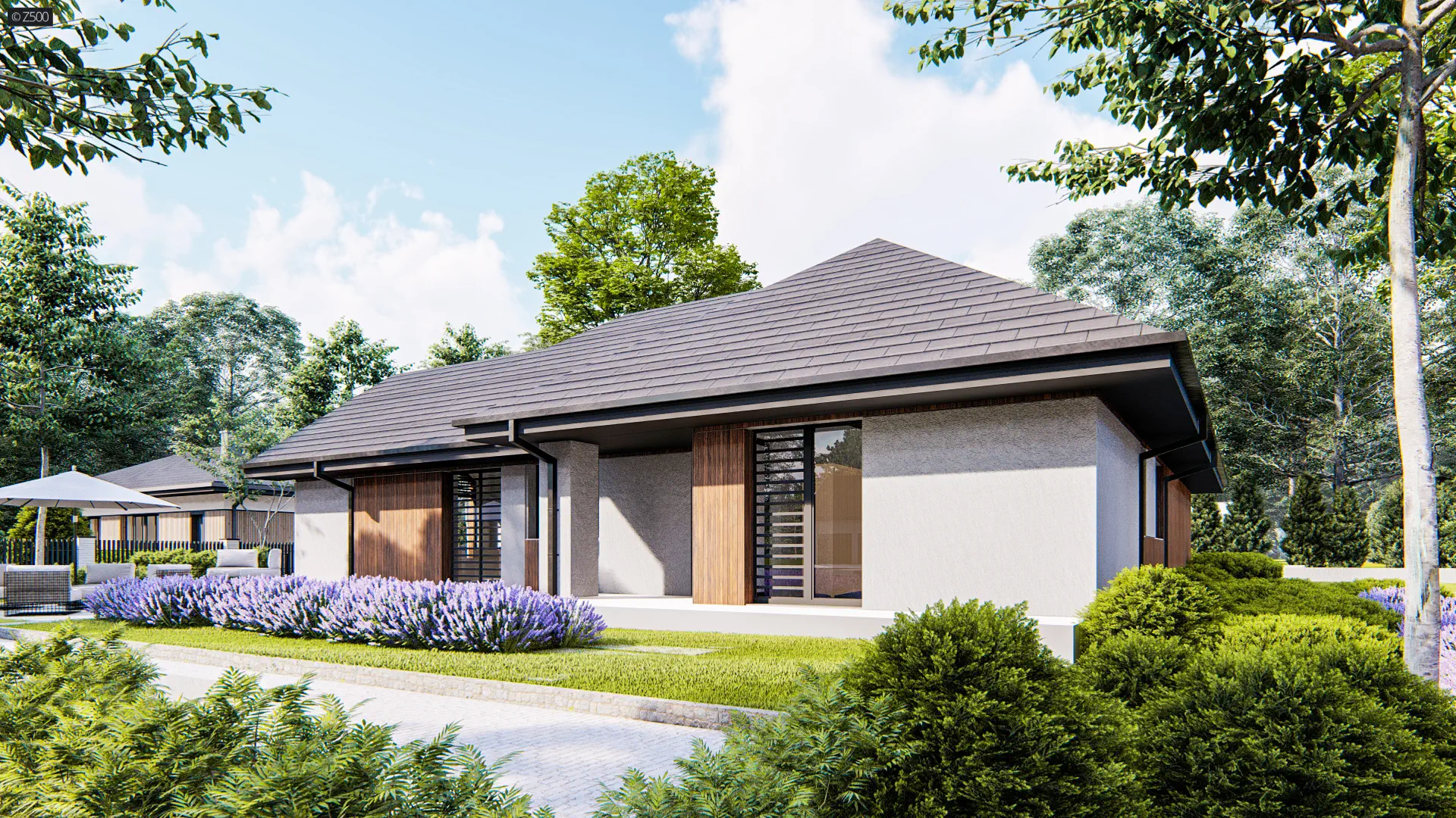 Projekt domu Z402 35 - to funkcjonalny i energooszczędny dom parterowy z pompą ciepła i garażem na 2 auta. W układzie przewidziano 4 sypialnie, 2 łazienki, salon 36,11 m², garaż na 2 auta. Minimalna działka: 25,66 m × 25,36 m.