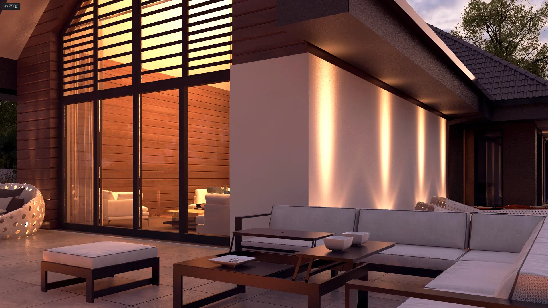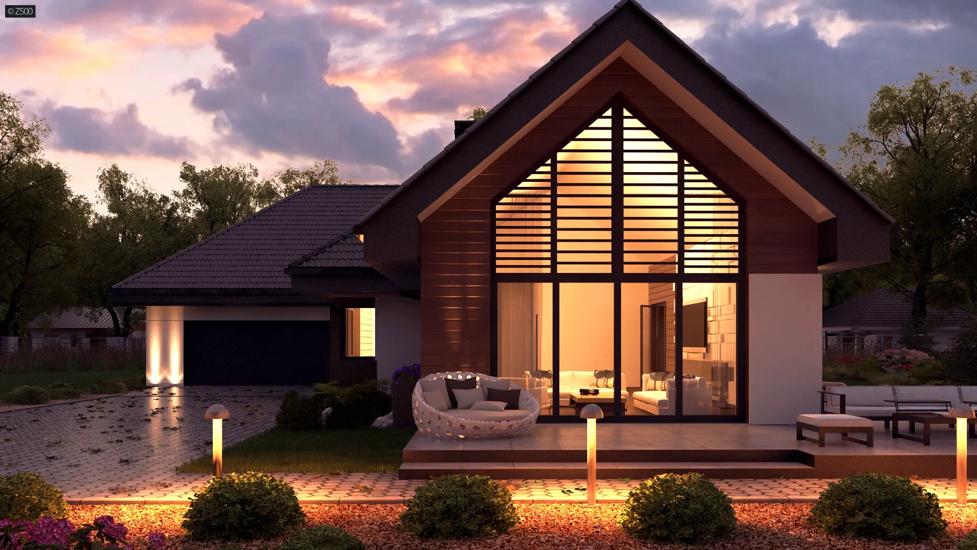 Parterowy dom w stylu współczesnym, z dachem wielospadowym i dwustanowiskowym garażem. Wersja powiększona, jeszcze większy salon.