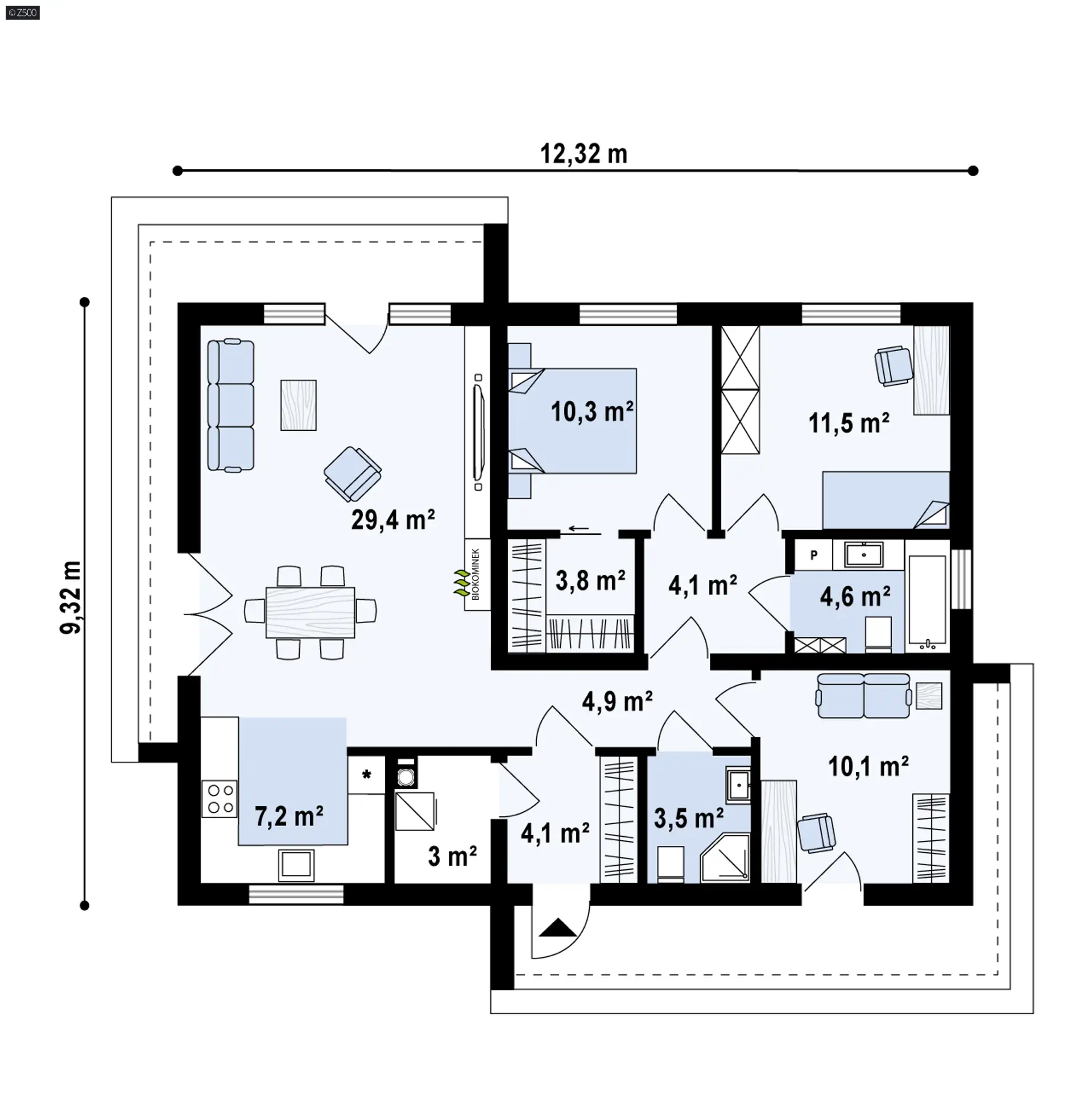 Z413 to projekt tradycyjnego domu parterowego na planie prostokąta z dachem dwuspadowym. Poddasze pełni funkcję strychu, do przechowania np. sezonowych rzeczy typu ozdoby świąteczne. Elewację wykończono ciemną płytką włókno-cementową schodzącą z dachu na elewację frontową oraz ogrodową. Boki ocieplono poziomymi deskami drewnianymi, natomiast proste zadaszenia nad wejściem jak i tarasem wykończono białym kamieniem lub tynkiem. Przeszklenia do samej podłogi stanowią domenę części dziennej domu.
