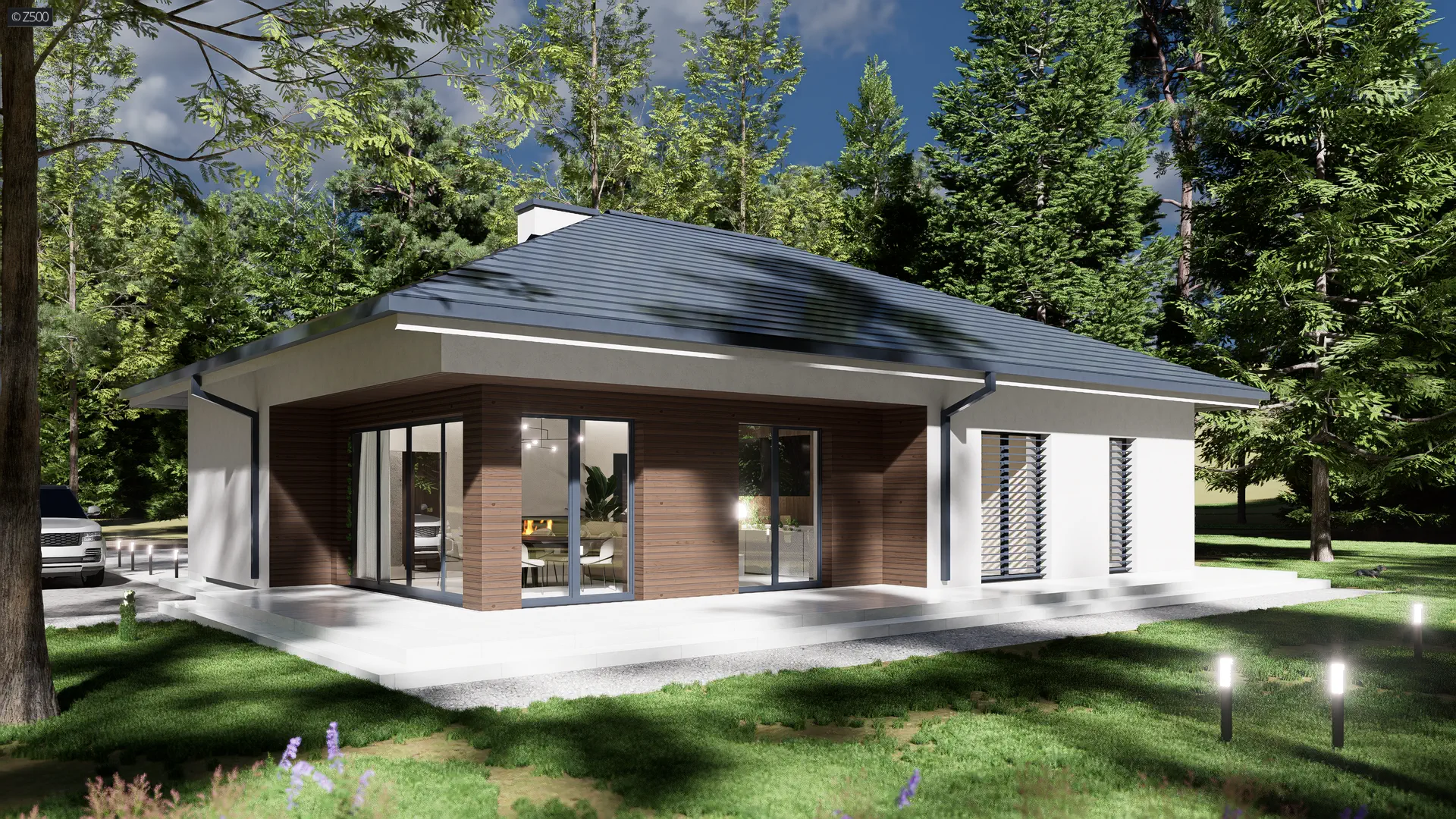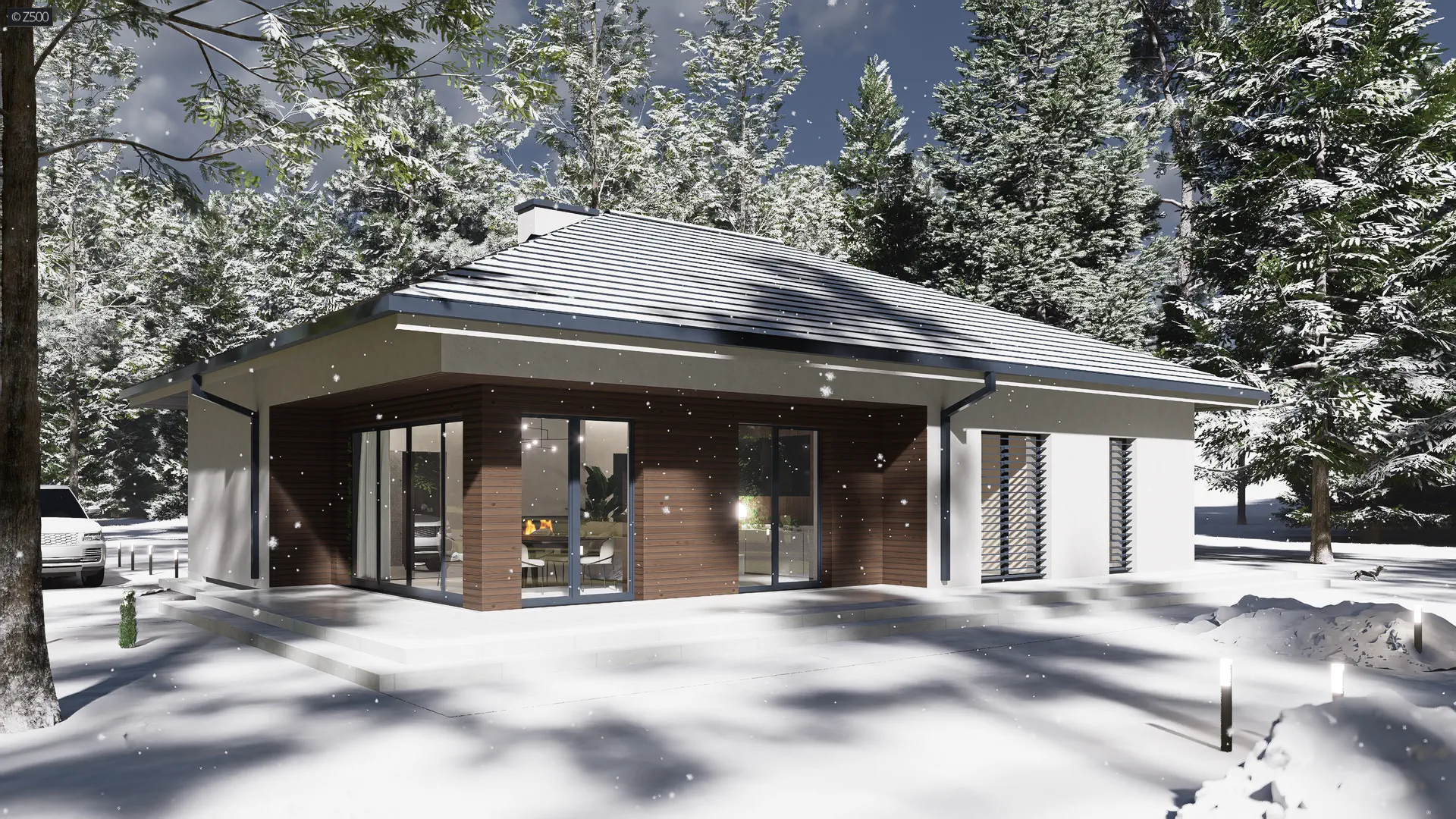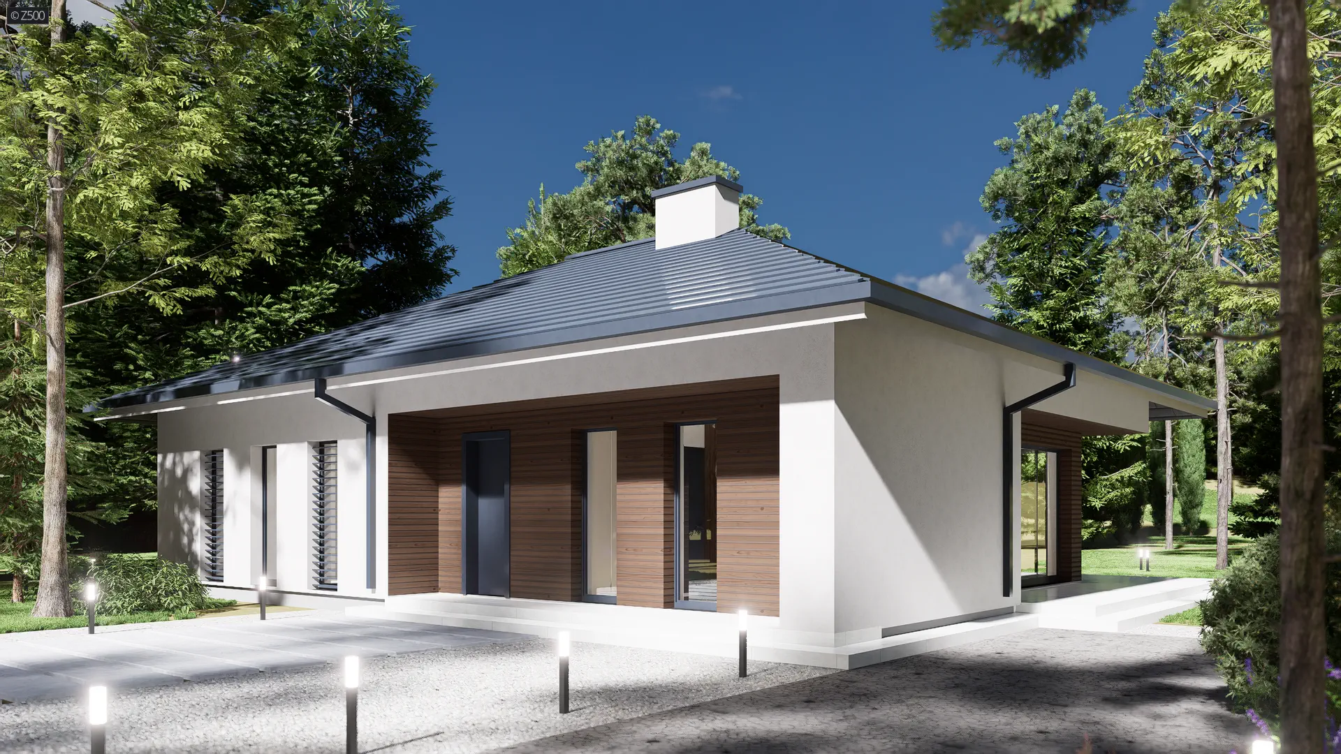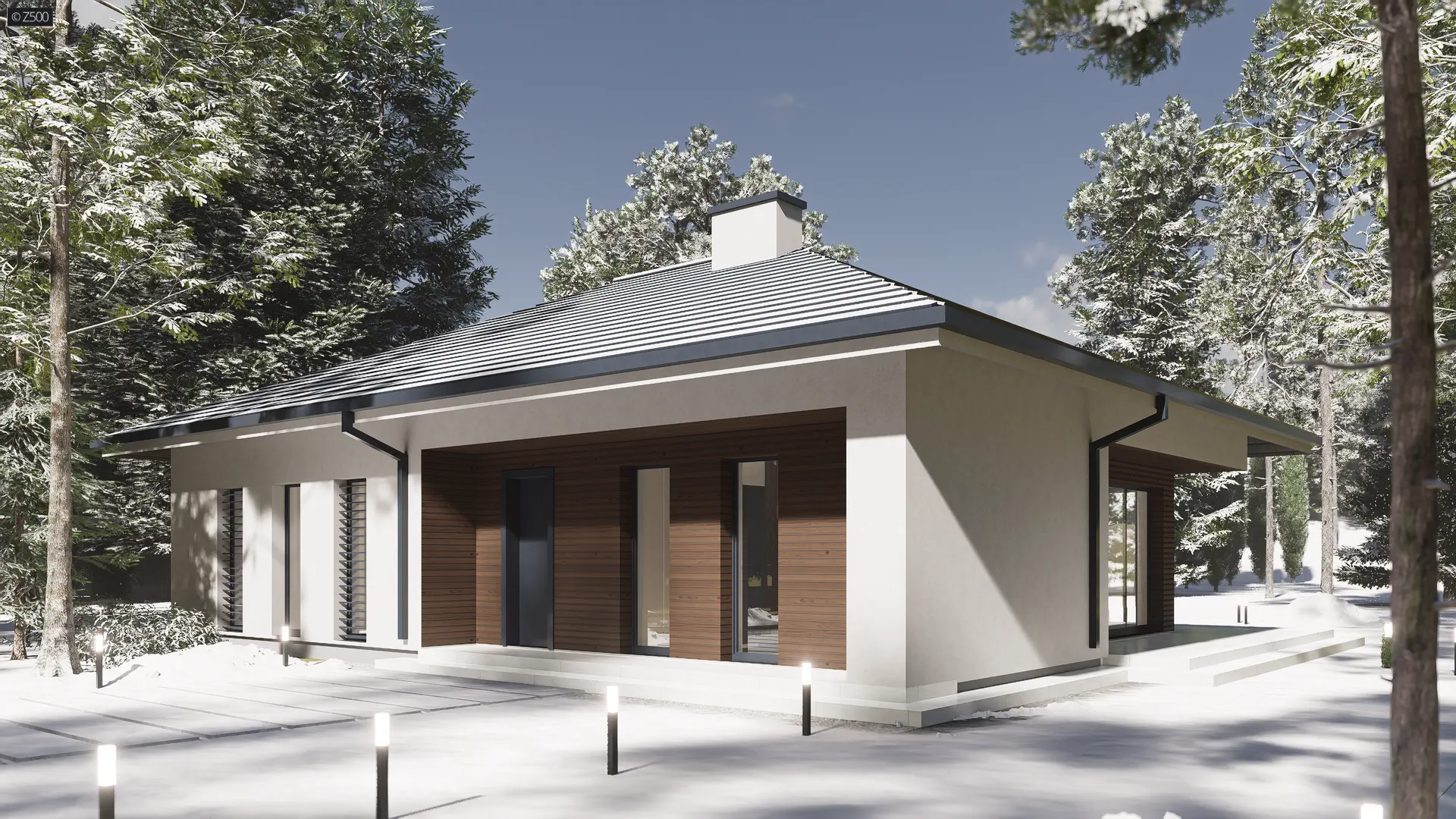 Z415 to dom parterowy z dachem czterospadowym. Nowatorski charakter zawdzięcza prostej bryle oraz dużym przeszkleniom w salonie. Biała otynkowana elewacja oraz drewniane okładziny są świetnym dopełnieniem.