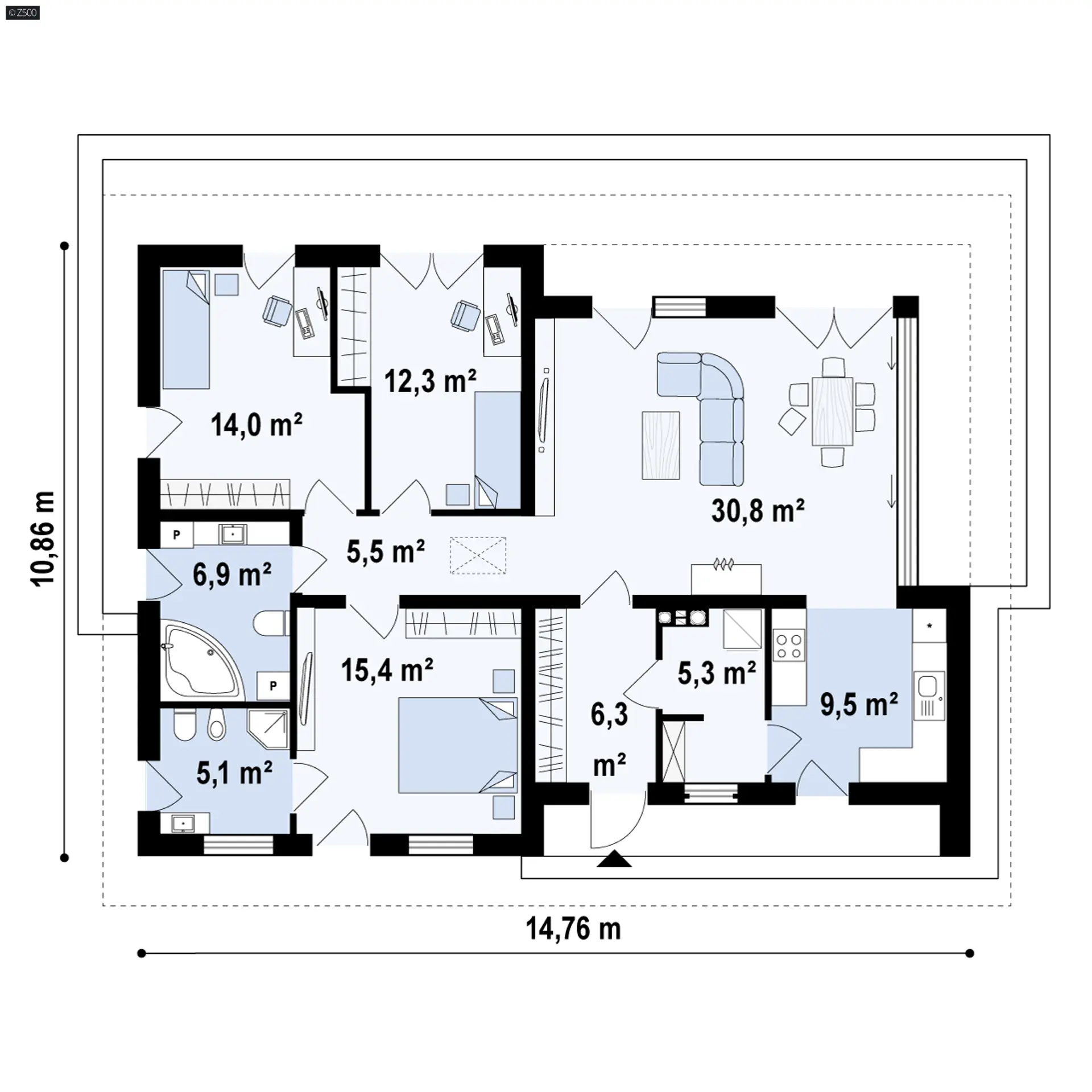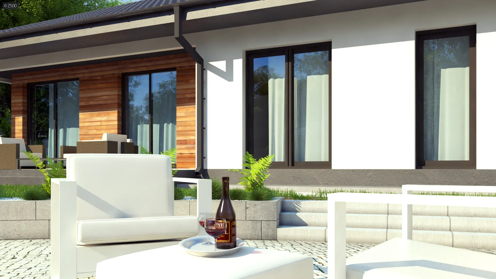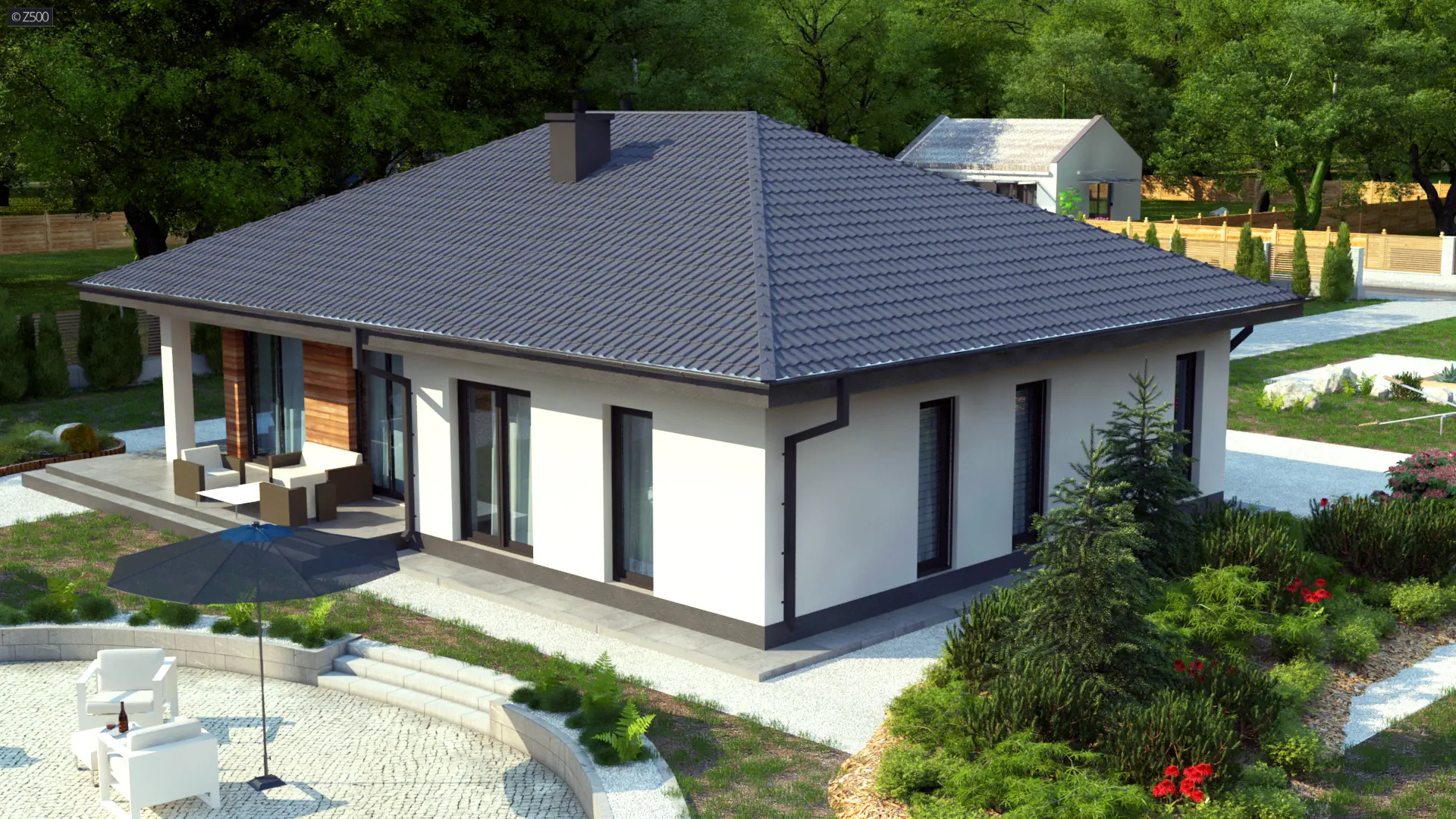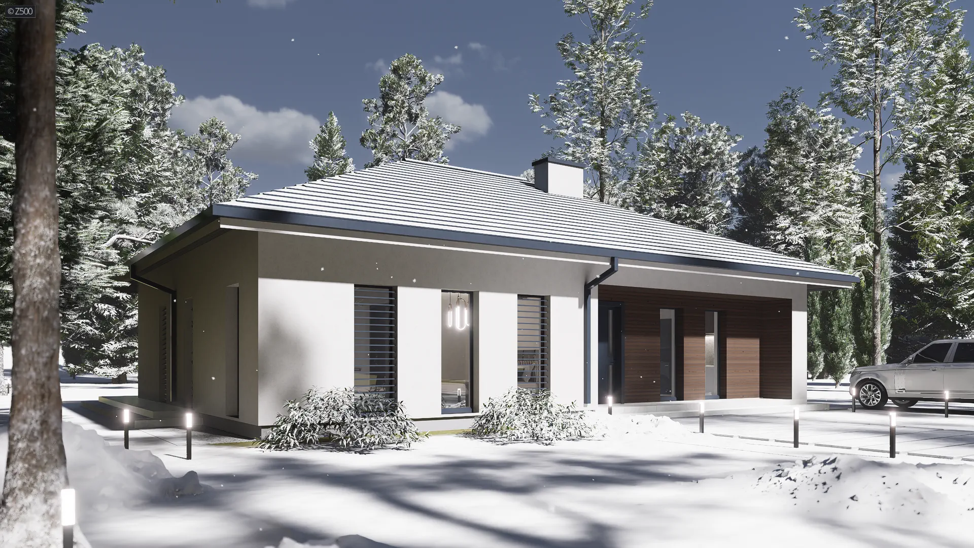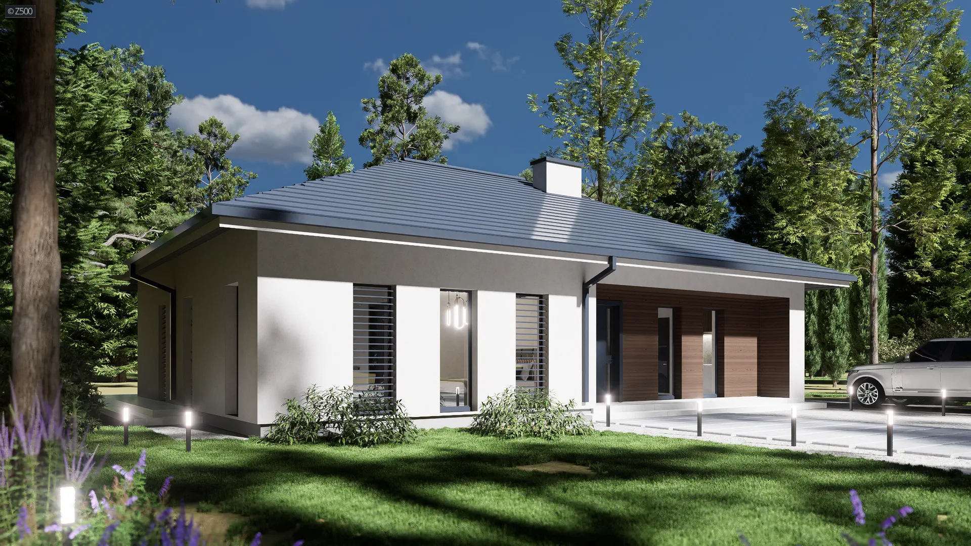 Z415 to dom parterowy z dachem czterospadowym. Nowatorski charakter zawdzięcza prostej bryle oraz dużym przeszkleniom w salonie. Biała otynkowana elewacja oraz drewniane okładziny są świetnym dopełnieniem.