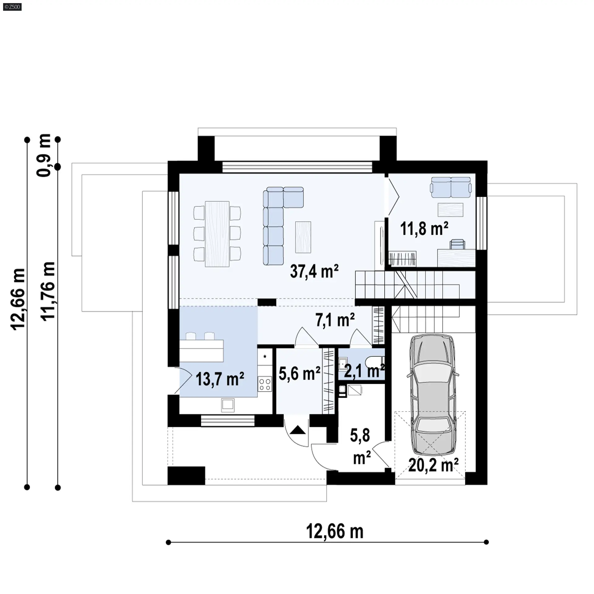 Wejście do domu umieszczono pośrodku budynku w podcieniu, który da zadaszenie w deszczowy dzień. Z podcienia dostaniemy się również bezpośrednio do PG i dalej do garażu. Parter to część dzienna domu. Znajduje się tu duża kuchnia z wyspą oraz oknem od frontu. Jadalnia oraz salon umieszczono od strony ogrodu i użyto dużych przeszkleń do podłogi aby dom łączył się z ogrodem a jednocześnie aby wpadało do środka dużo światła. W głębi, za schodami prowadzącymi na poddasze znalazło się jeszcze miejsce na niewielki gabinet, który może spełniać również rolę Pokoju gościnnego.
