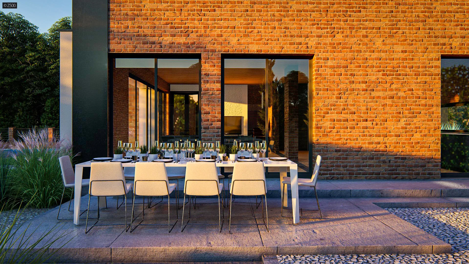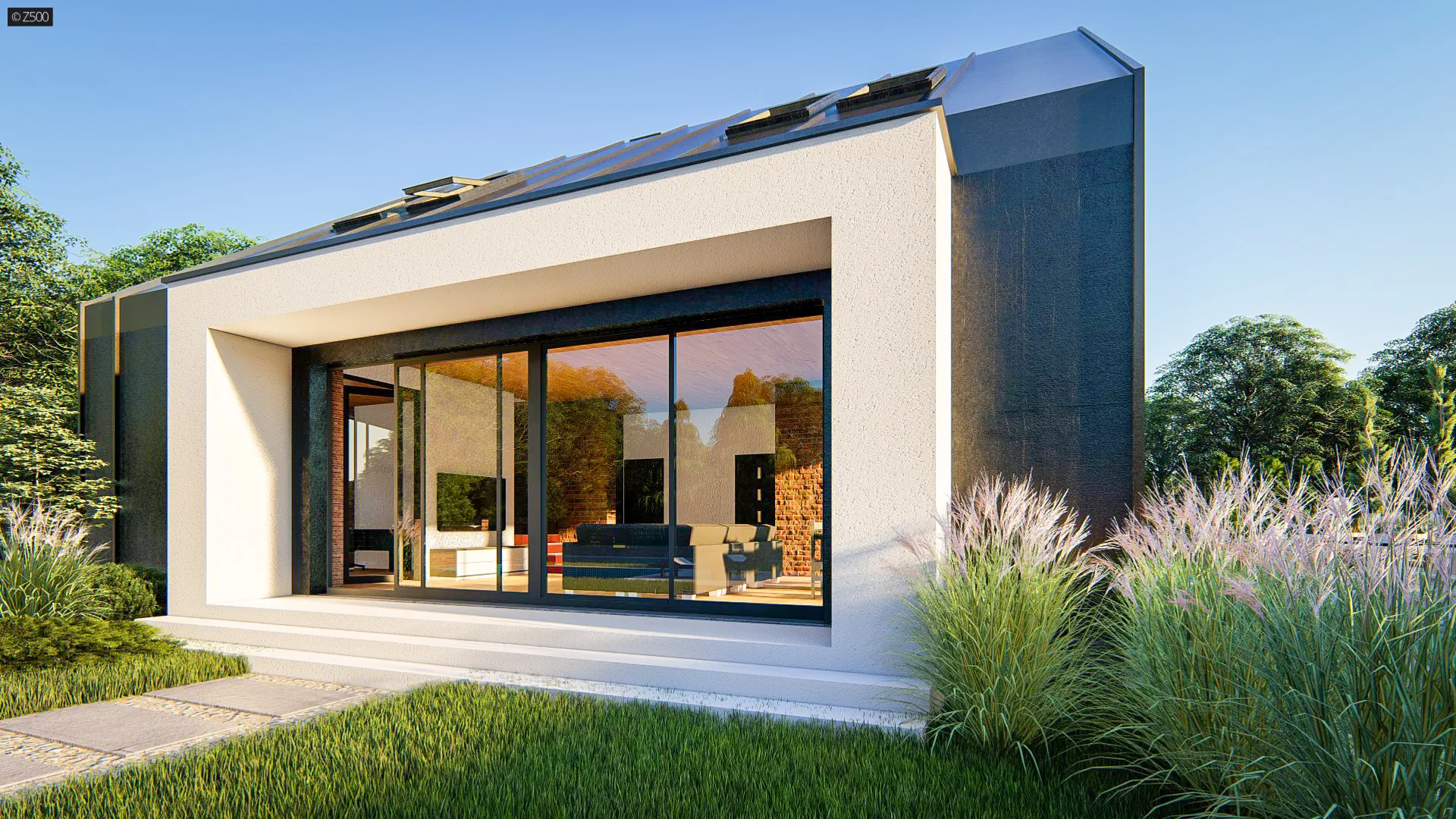 Z416 jest propozycją domu współczesnego z nowoczesną, stonowaną elewacją. Front oraz tył został połączony z dachem blachą w kolorze grafitowym na rąbek. Natomiast boki budynku jak i podcień wyłożono czerwoną cegłą. Brak okapów, nowoczesne materiały elewacyjne oraz prosty biały element stanowiący zadaszenie tarasu sprawiają, że dom z dachem dwuspadowym nabiera nowoczesnego wyglądu.