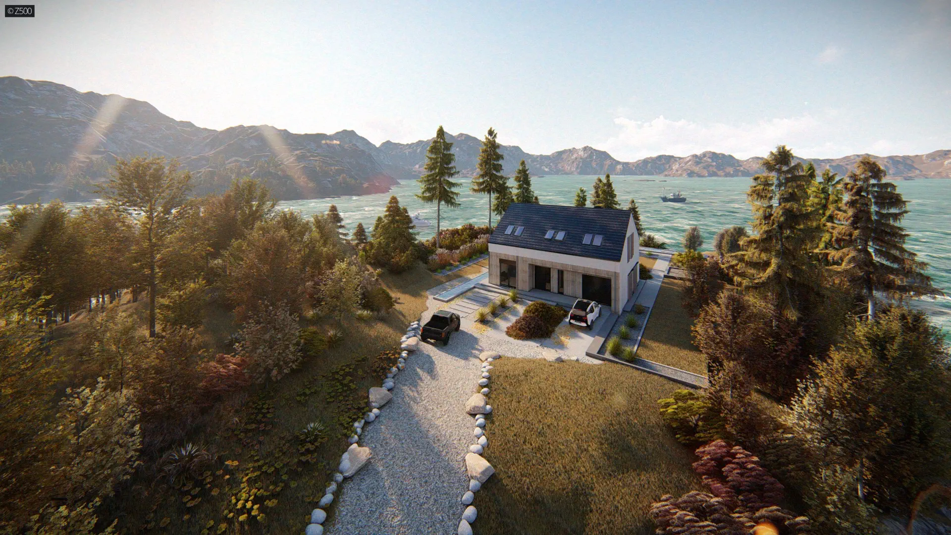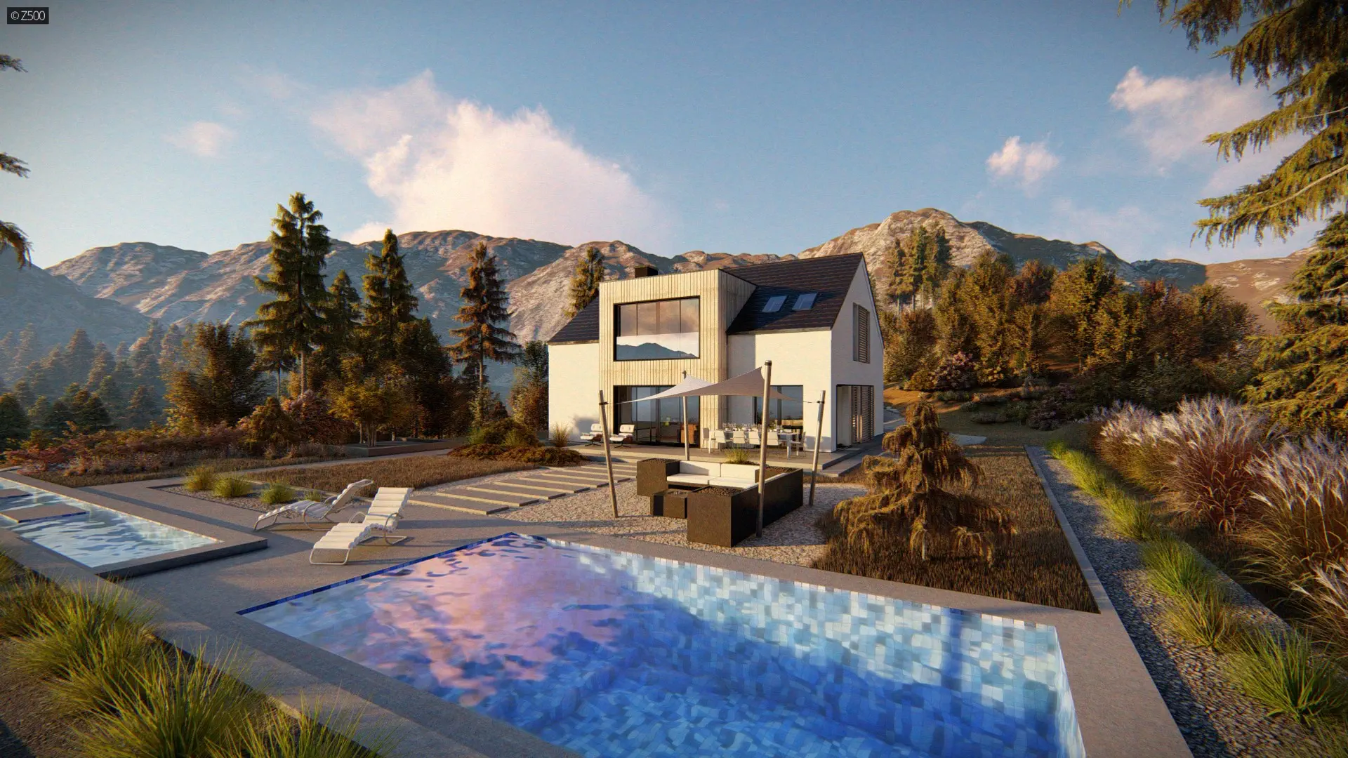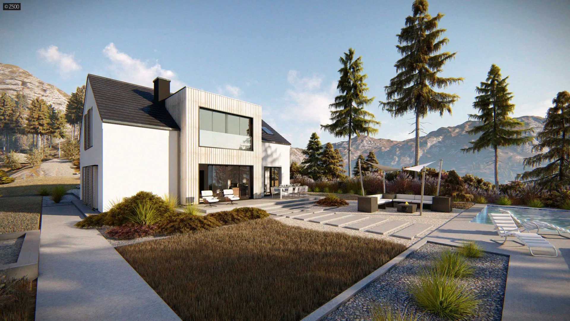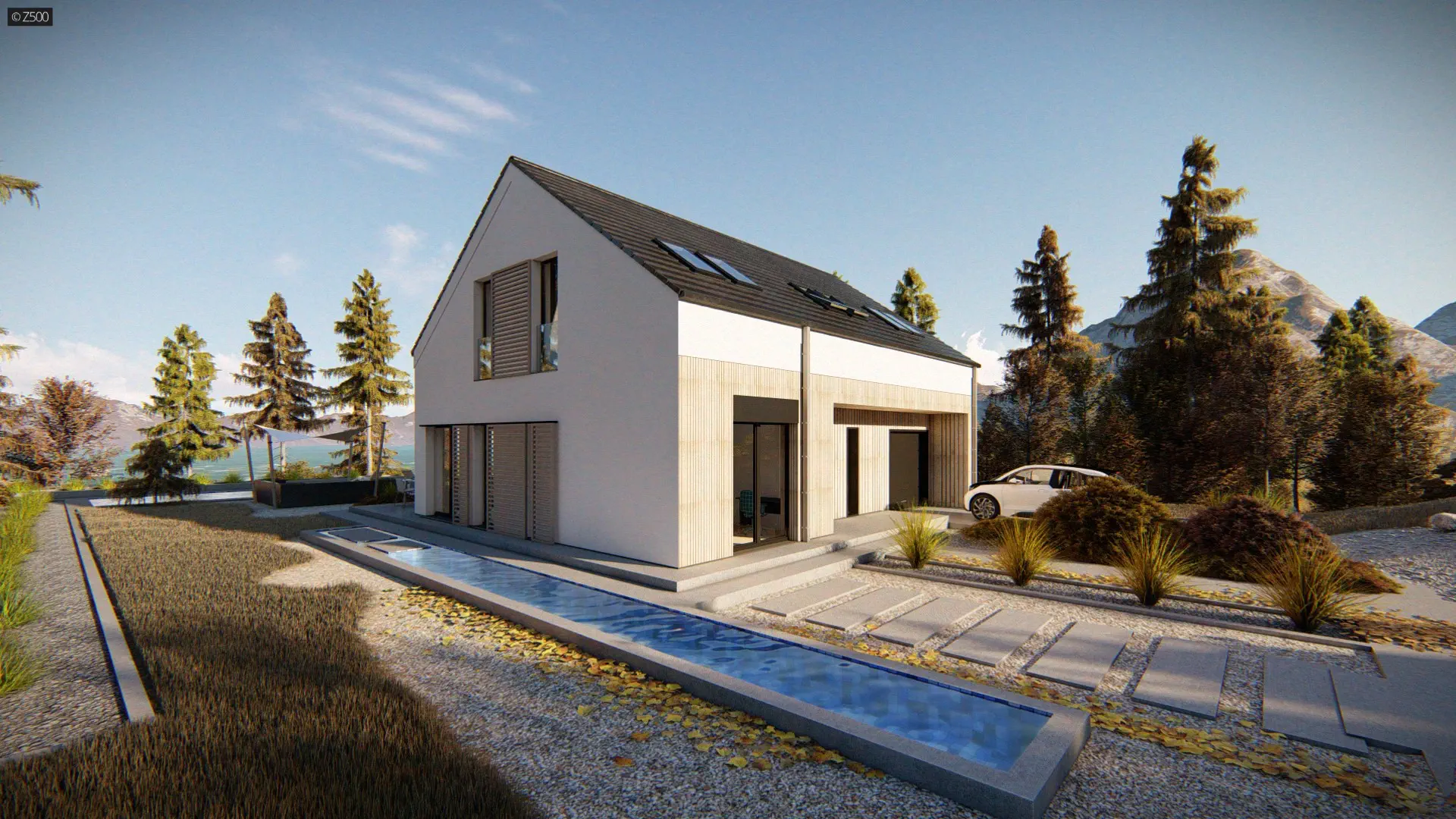 Z419 to propozycja nowoczesnego domu z dachem dwuspadowym, oraz prostą, dużą lukarną od strony ogrodu. Elewacja utrzymano w jasnej kolorystyce. Połączono biały tynk z jasnymi drewnianymi deskami. Jako element dekoracyjny, dodano przesuwane panele osłaniające przed dużym słońcem w odcieniu drewna.