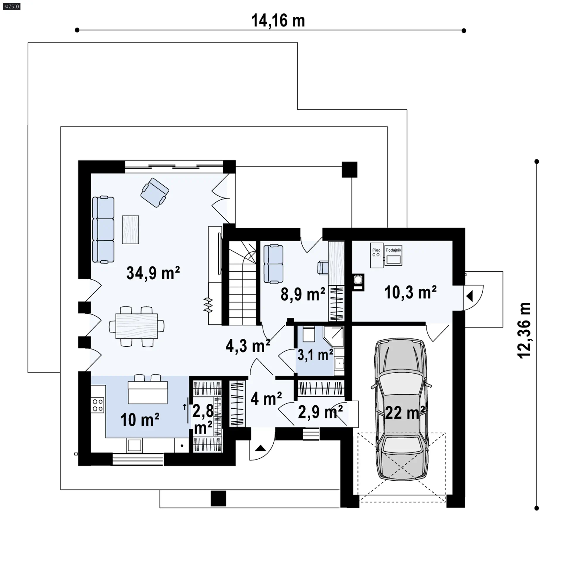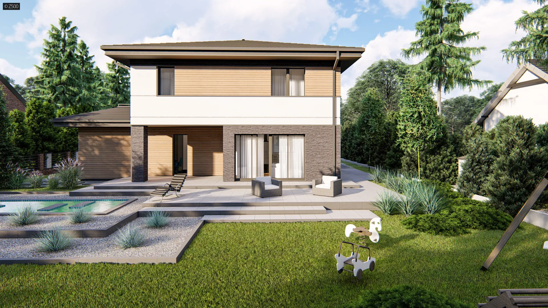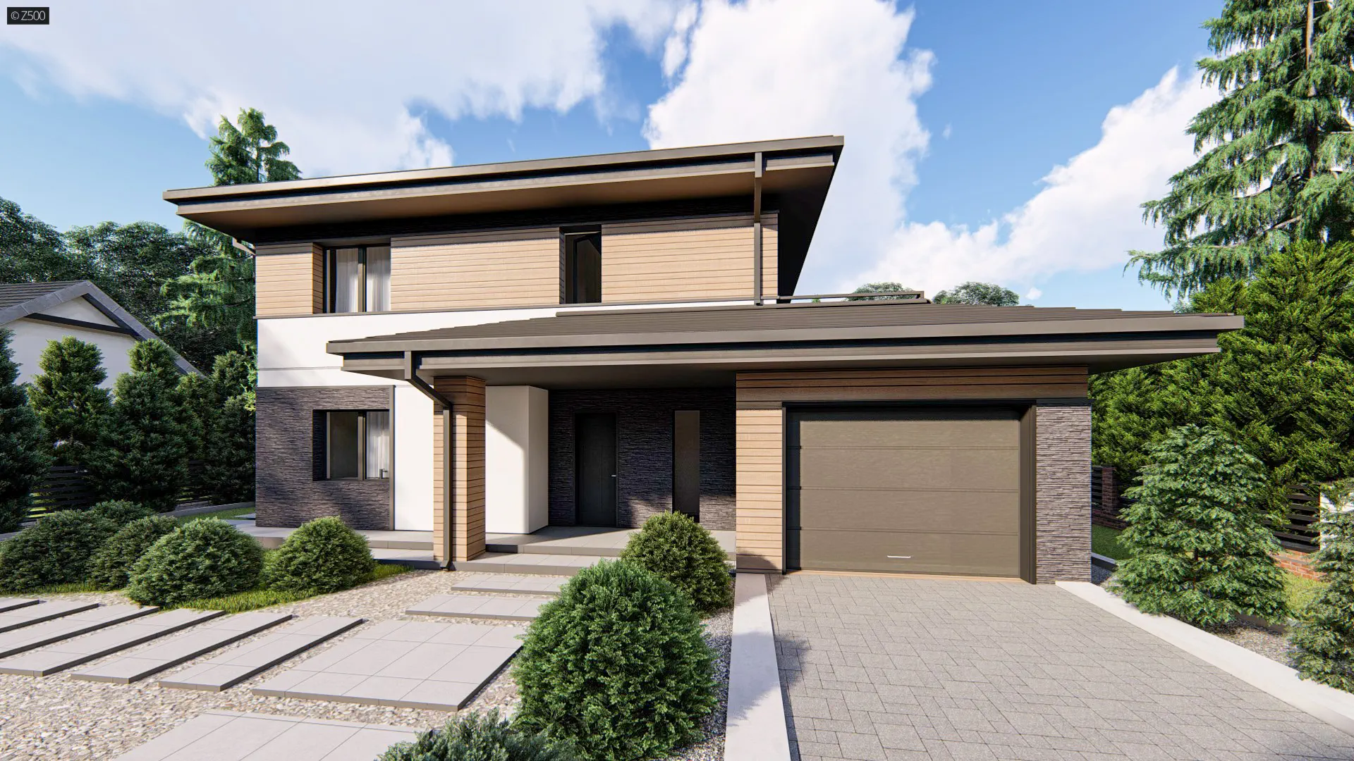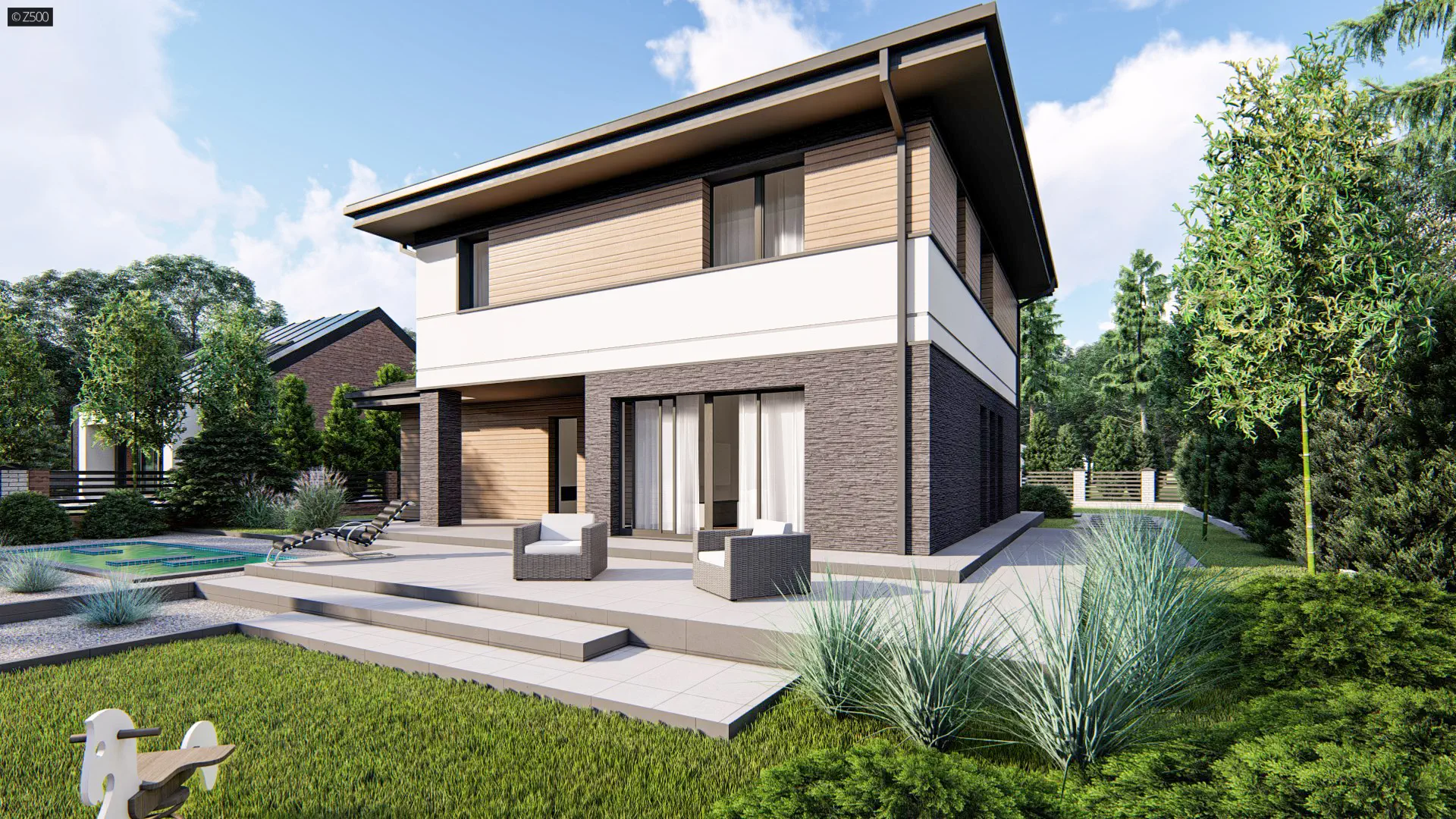 Z421 to piętrowy dom o prostej bryle z garażem bocznym i dużym pomieszczeniem gospodarczym. Cegła na elewacjach nadaje budynkowi wyjątkowego charakteru, natomiast drewno dodaje wszystkiemu ciepła. Zadaszone wejście jak i taras zostało zaakcentowane masywnym słupem. W sieni jak i garderobie łączącej garaż z domem znalazło się miejsce na dużą szafę.Cześć dzienną stanowi przestronny salon z jadalnią oraz kuchnia ze spiżarnią. Okna i drzwi balkonowe salonu wychodzą na ogród. Na parterze wygospodarowano także miejsce na dodatkowy pokój i łazienkę.