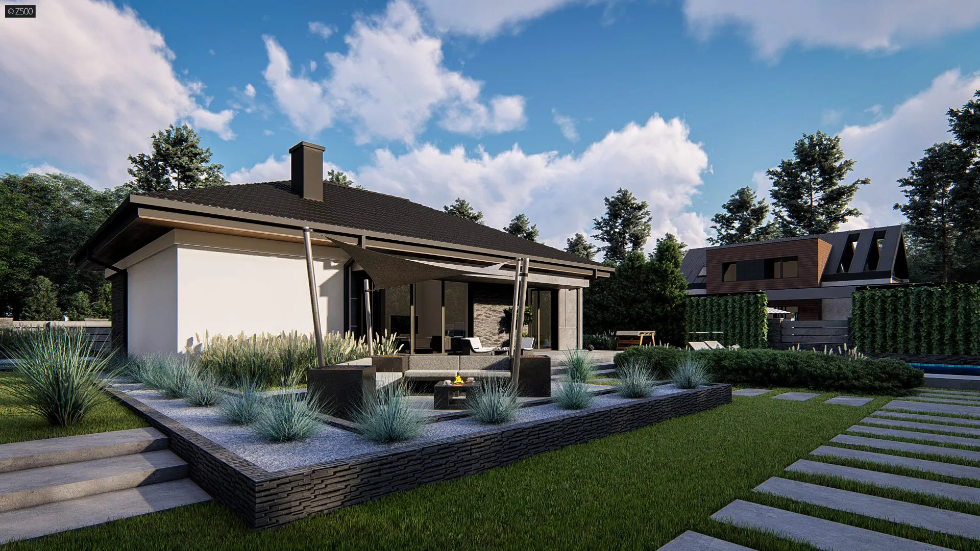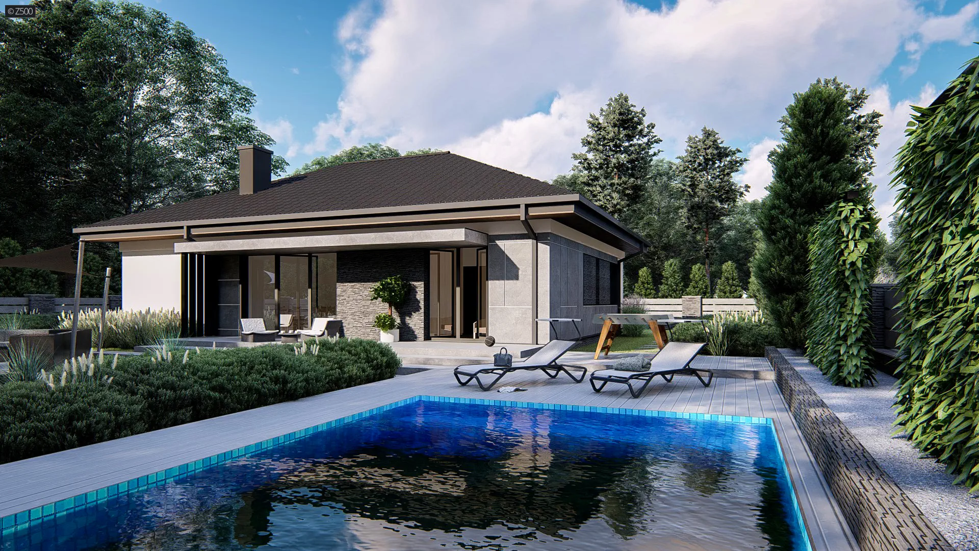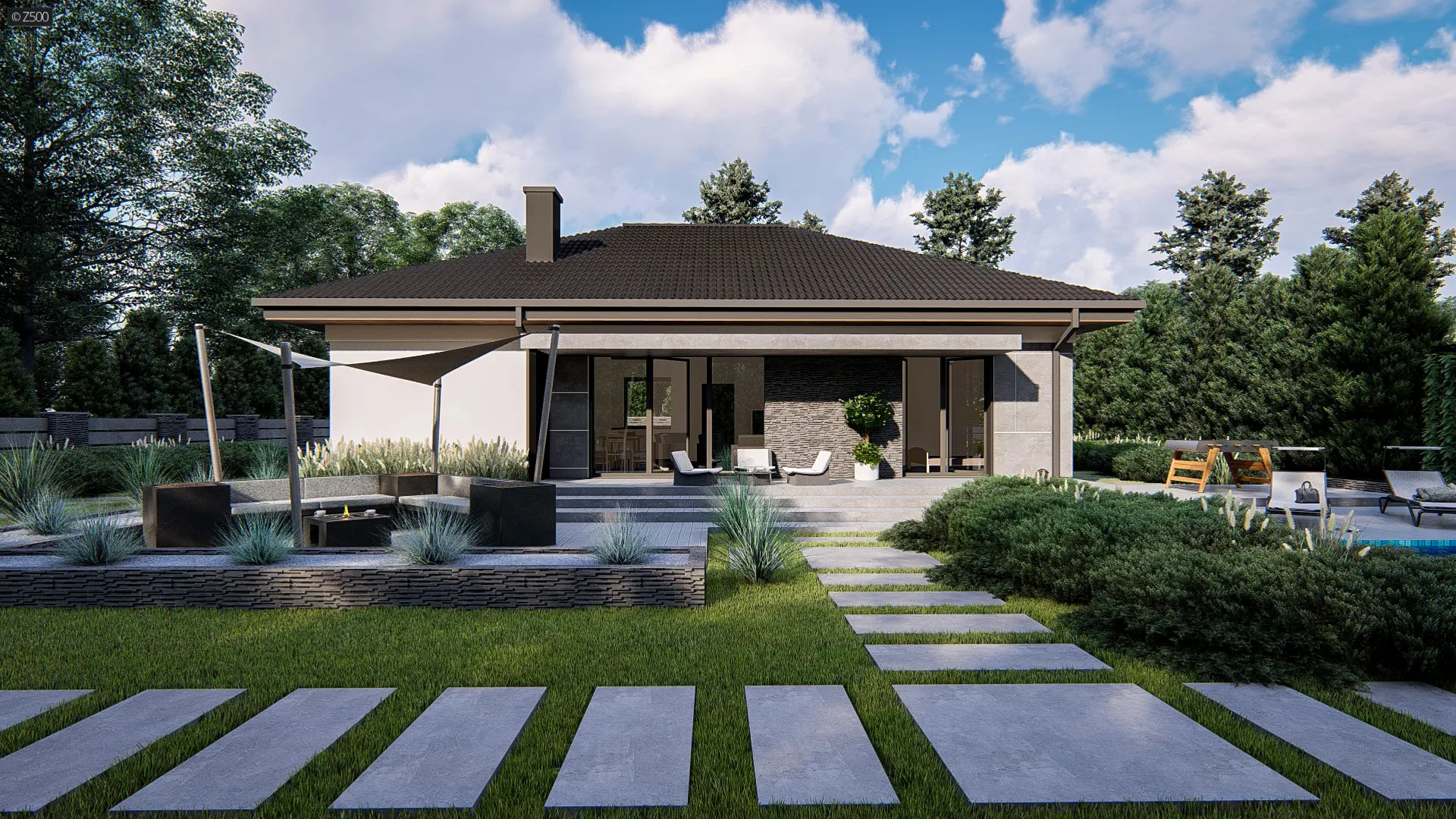 Z427 to kompaktowy dom parterowy o prostej bryle przekrytej dachem kopertowym. Elewacja wykończona została białym tynkiem, czarnym kamieniem elewacyjnym oraz płytami imitującymi beton. Dobór kolorystyki oraz materiałów sprawia, że prosty, niewielki dom wygląda nowocześnie.