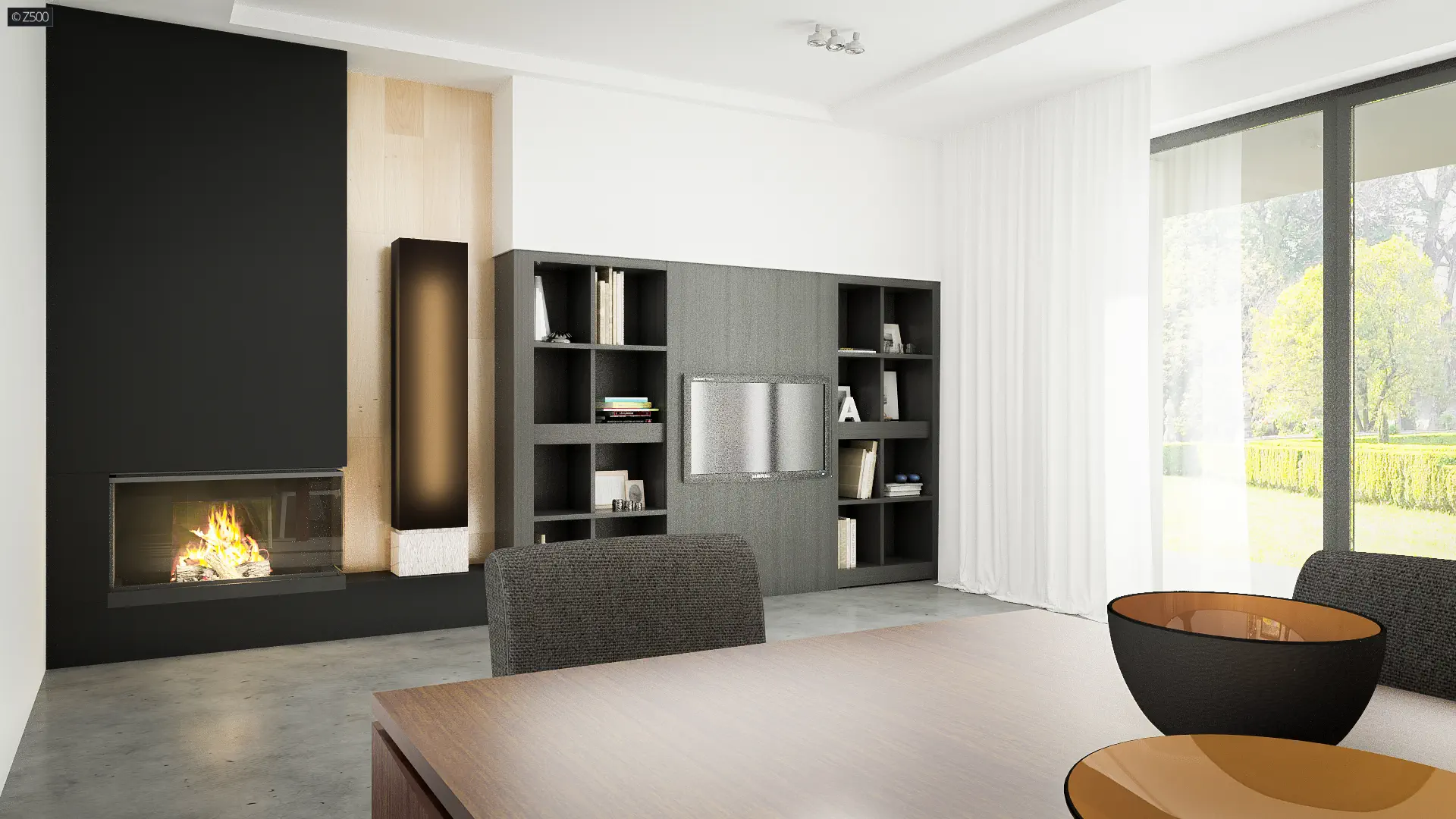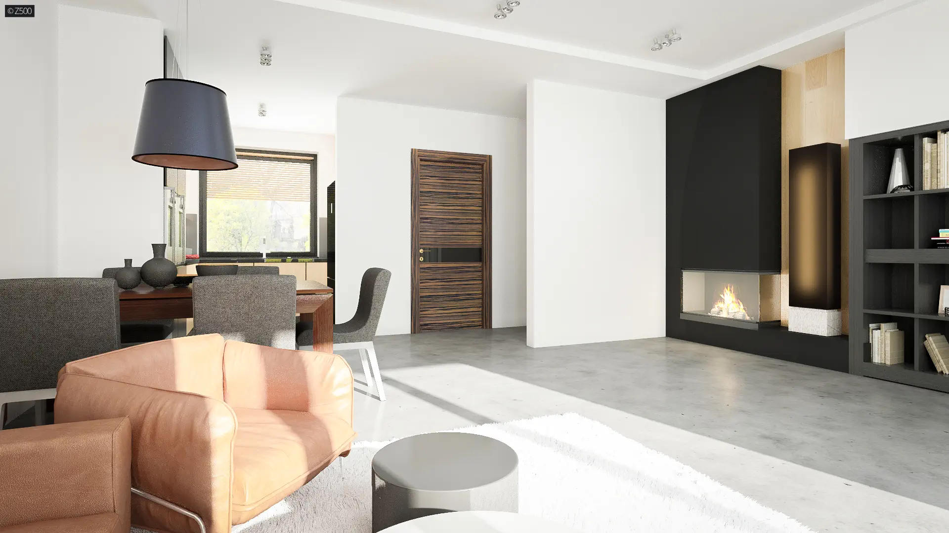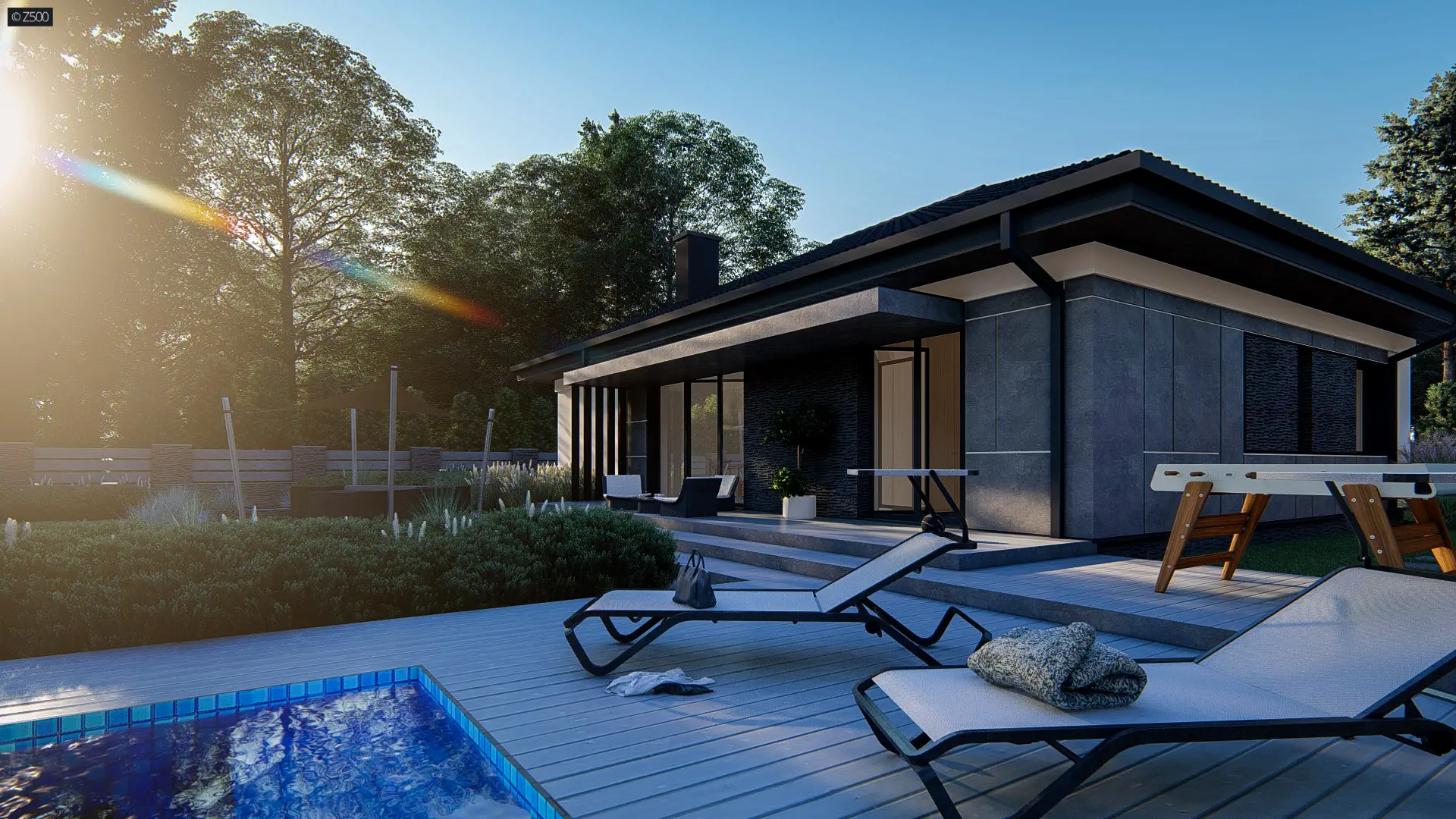 Z427 to kompaktowy dom parterowy o prostej bryle przekrytej dachem kopertowym. Elewacja wykończona została białym tynkiem, czarnym kamieniem elewacyjnym oraz płytami imitującymi beton. Dobór kolorystyki oraz materiałów sprawia, że prosty, niewielki dom wygląda nowocześnie.