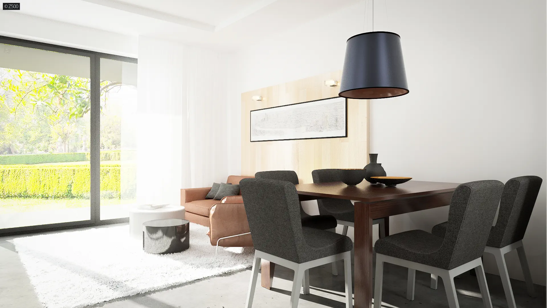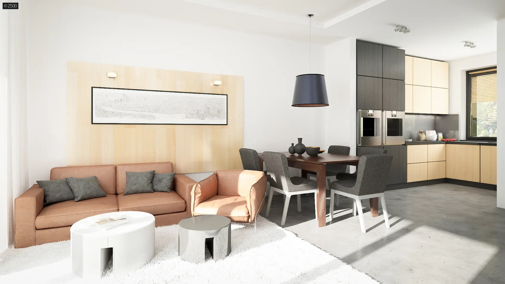 Do domu wchodzimy z podcienia wejściowego. W sieni zaplanowano miejsce na pojemną szafę. Dalej wchodzimy do części reprezentacyjnej. Jest to otwarta część dzienna. Przestronny salon z jadalnia oraz dużym przeszkleniem z wyjściem na zadaszony taras oraz ustawna kuchnia. Znalazło się tu również miejsce na WC dla gości.