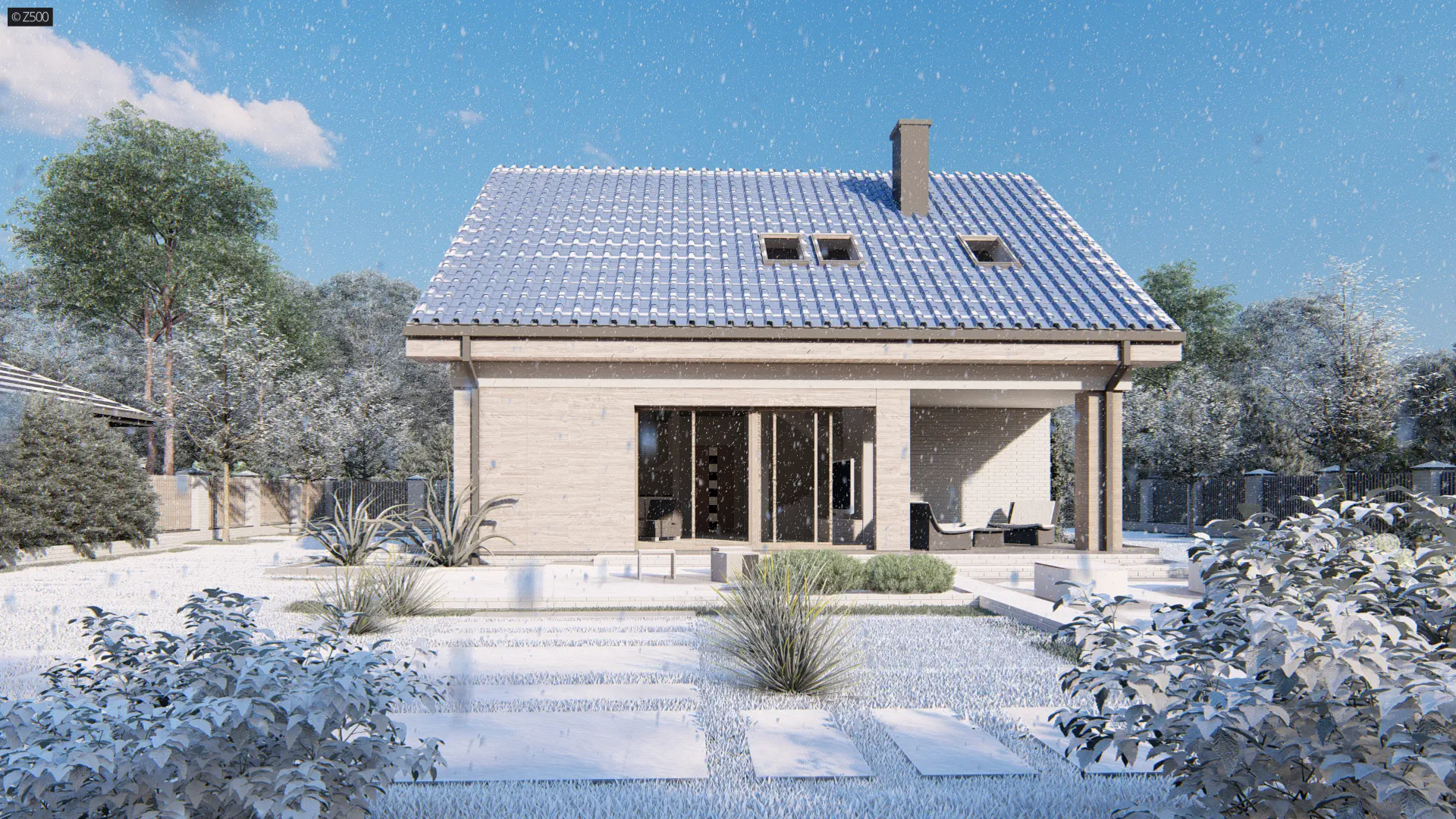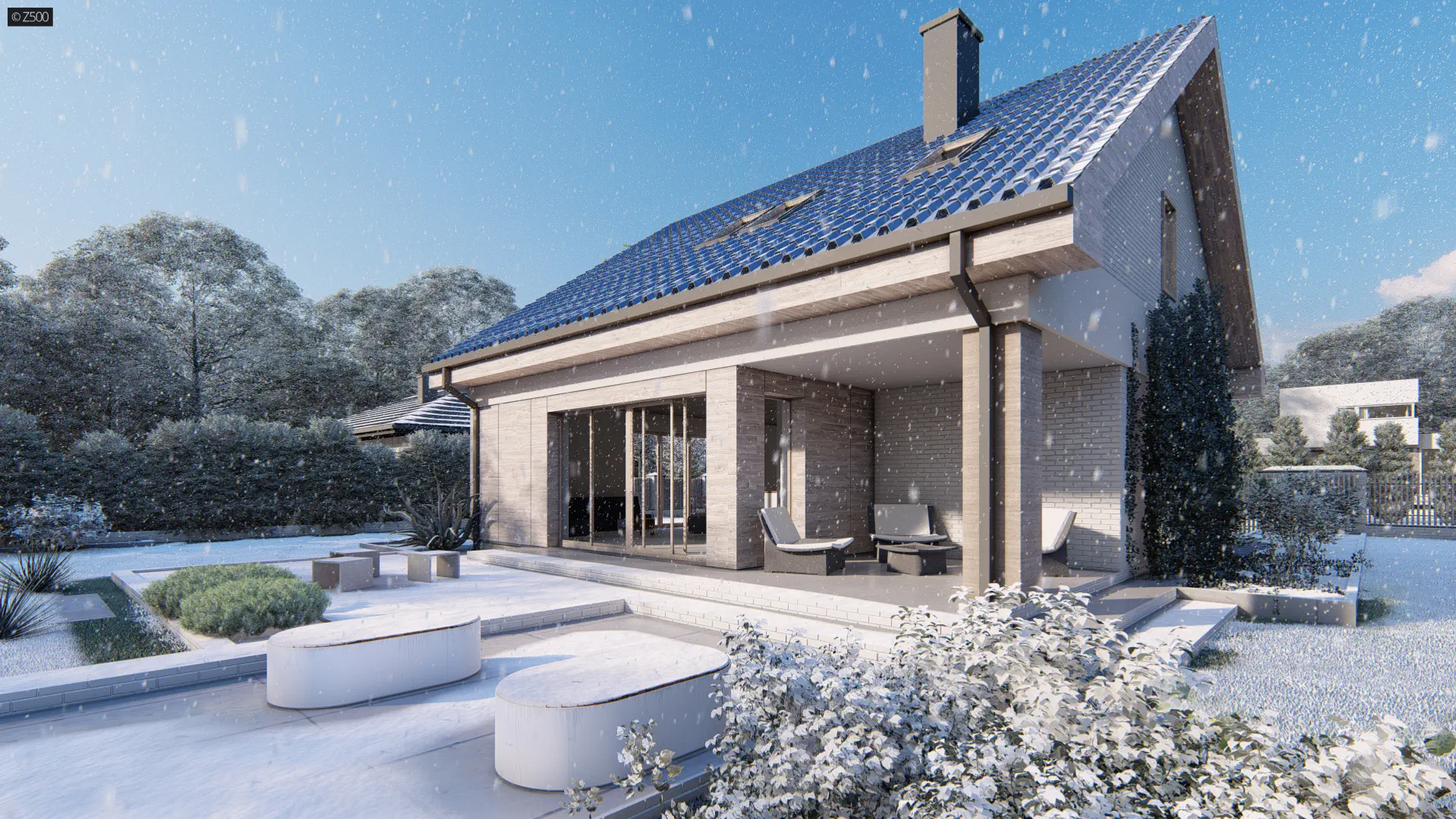 Dom z poddaszem użytkowym, dachem dwuspadowym, garażem oraz zadaszonym tarasem.