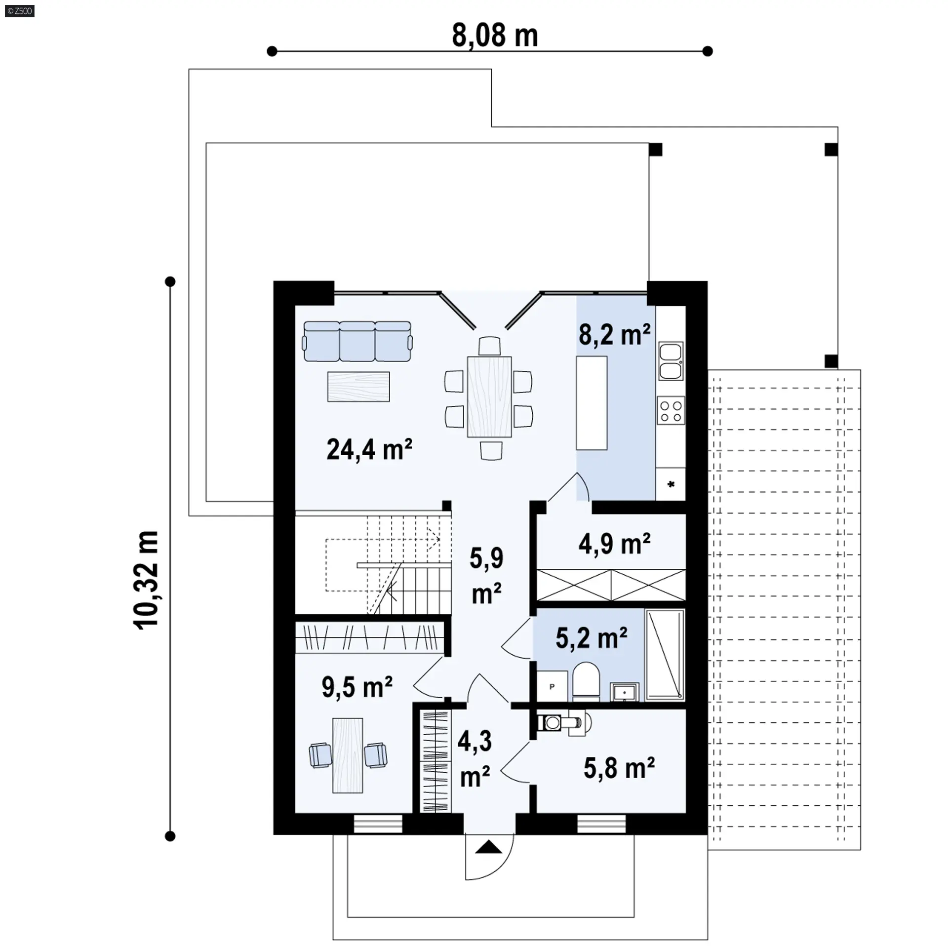 Projekt domu Z440 D to przykład wykorzystania małej przestrzeni w taki sposób, by stworzyć coś unikatowego. Charakterystyczne są tutaj duże przeszklenia od ogrodu oraz pustka nad salonem.