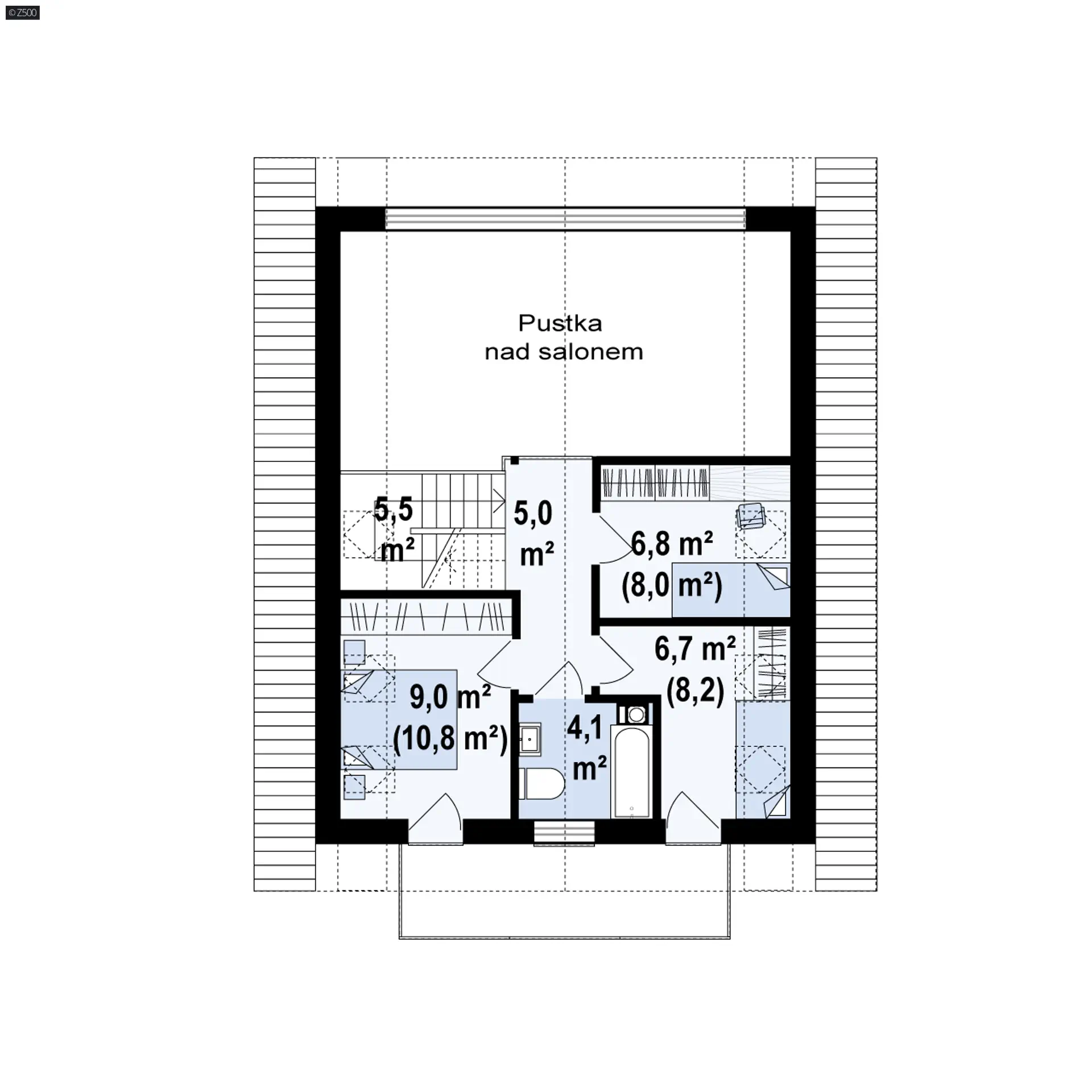 Na poddaszu znajdują się 3 pokoje i łazienka. Atutem tego projektu jest możliwość przearanżowania przestrzeni w taki sposób, aby stworzyć dwa pokoje oddzielone od siebie holem i łazienką (dzięki połączeniu pokoi o metrażach 8,01 m2 i 8,00 m2 mogłaby powstać sypialnia z garderobą).