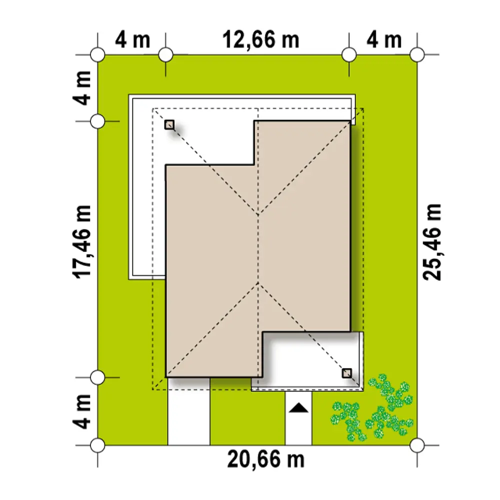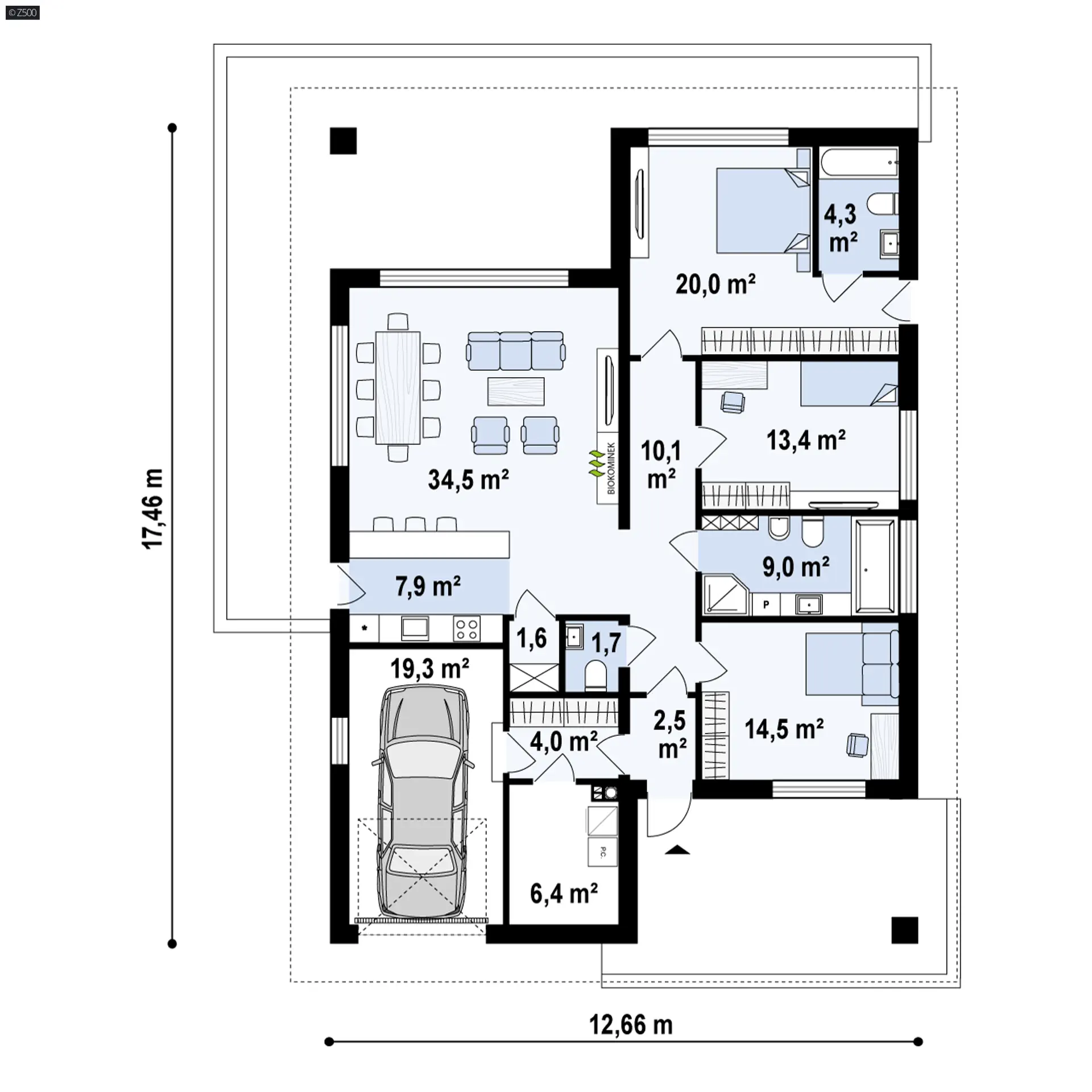 Projekt uzupełnia jednostanowiskowy garaż, wygodna garderoba przy sieni oraz praktyczna, prosta konstrukcja, która wpływa na szybkość i ekonomię budowy.