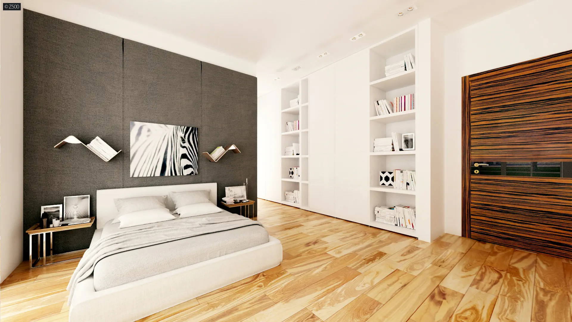 Niewątpliwym atutem tego domu jest prywatna sypialnia, która posiada łazienkę, dużą szafę lub możliwość garderoby oraz wyjście na taras. Niestandardowe w projekcie Z443 jest to, iż domownicy mają wygodny dostęp do głównej garderoby, która znajduje się pomiędzy garażem a sienią.