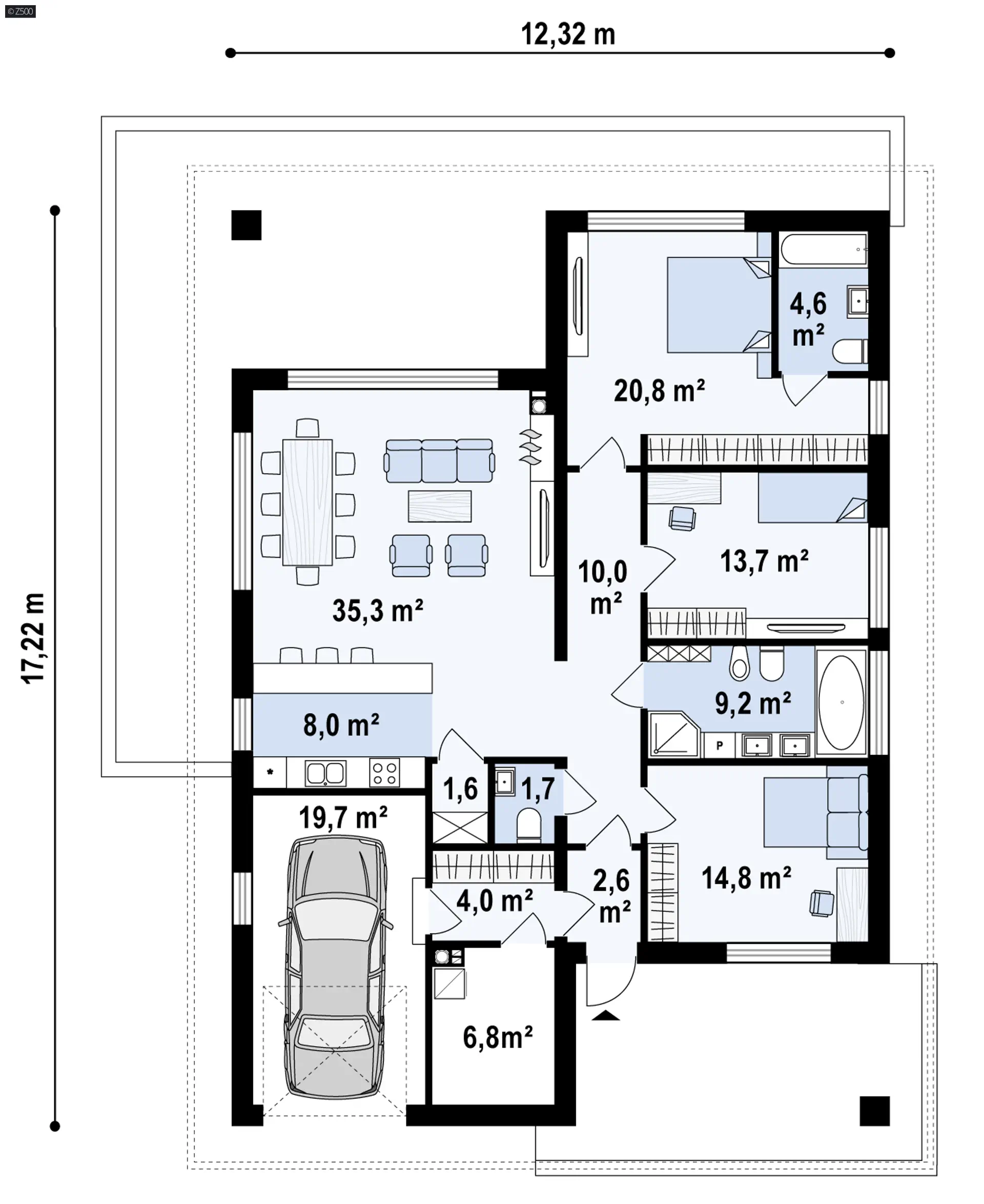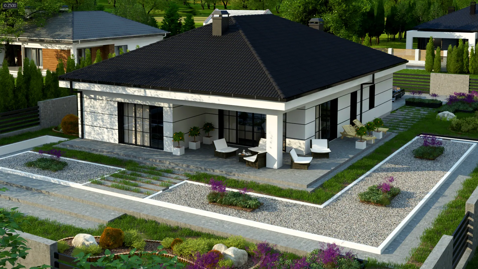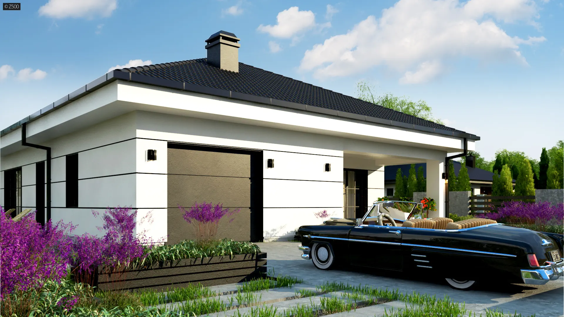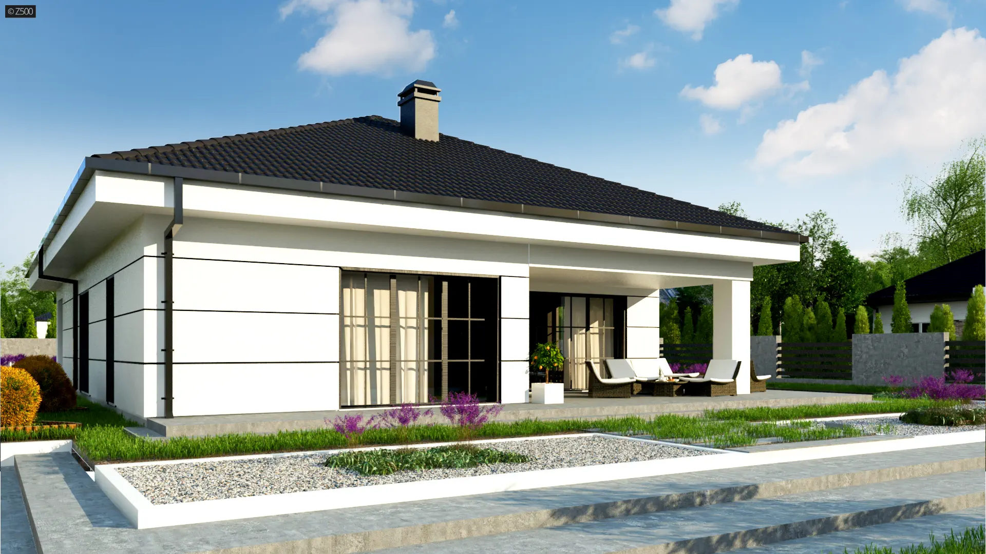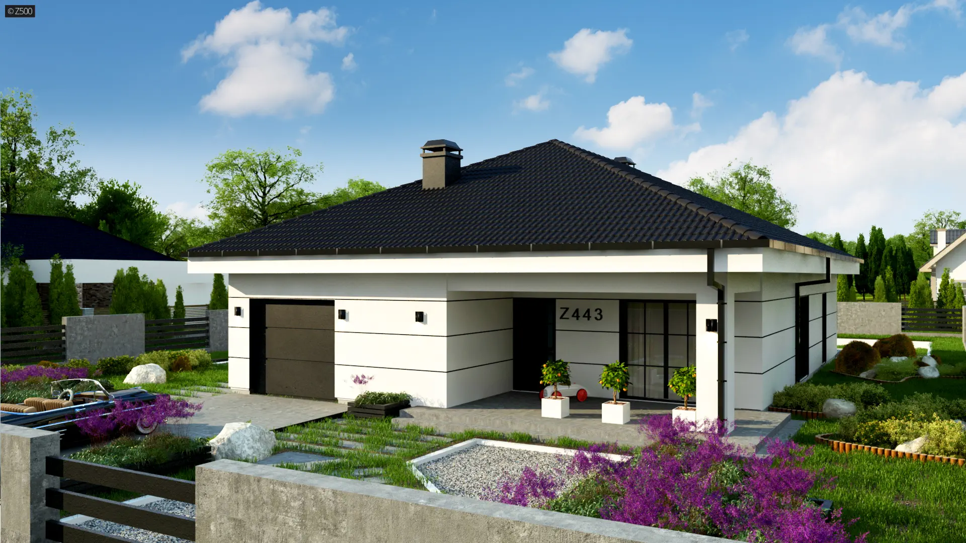 Projekt Z443 D to dom dla osób ceniących sobie nowoczesność w prostym wydaniu. Dzięki charakterystycznemu przesunięciu bryły, został zachowany wyraźny podział na strefę dzienną i nocną. Dodatkowo ten zabieg pozwolił na stworzenie zadaszenia nad wejściem i tarasem. Podcięcia i boniowanie sprawiły, że bryła stała się ciekawa i niestandardowa.