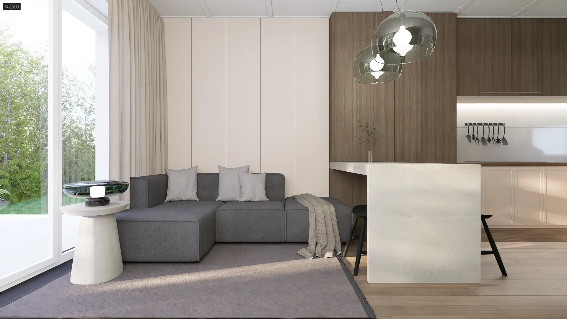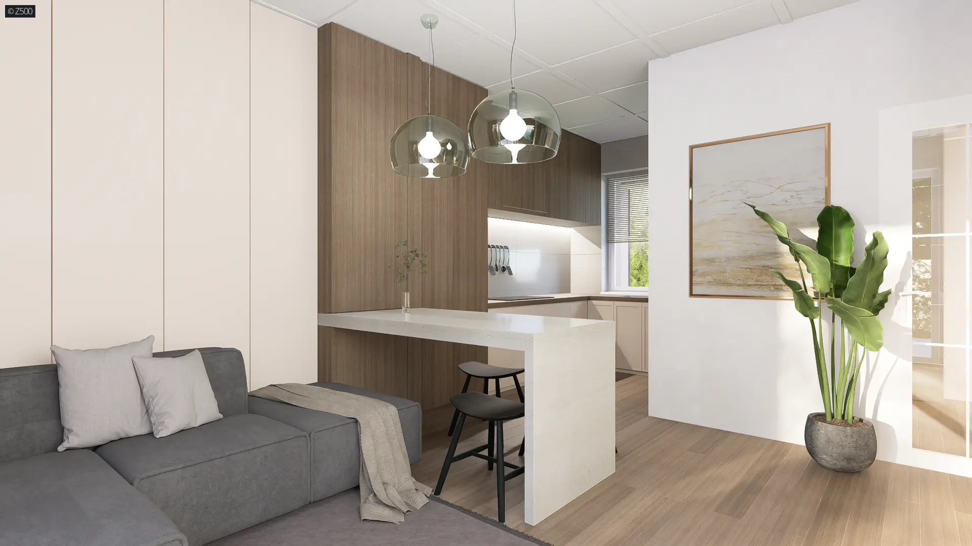 Na powierzchni 52m2 zaprojektowano otwartą część dzienną, sypialnię z wyjściem na taras, niewielką łazienkę oraz gabinet, który może pełnić rolę pokoju gościnnego lub garderoby.