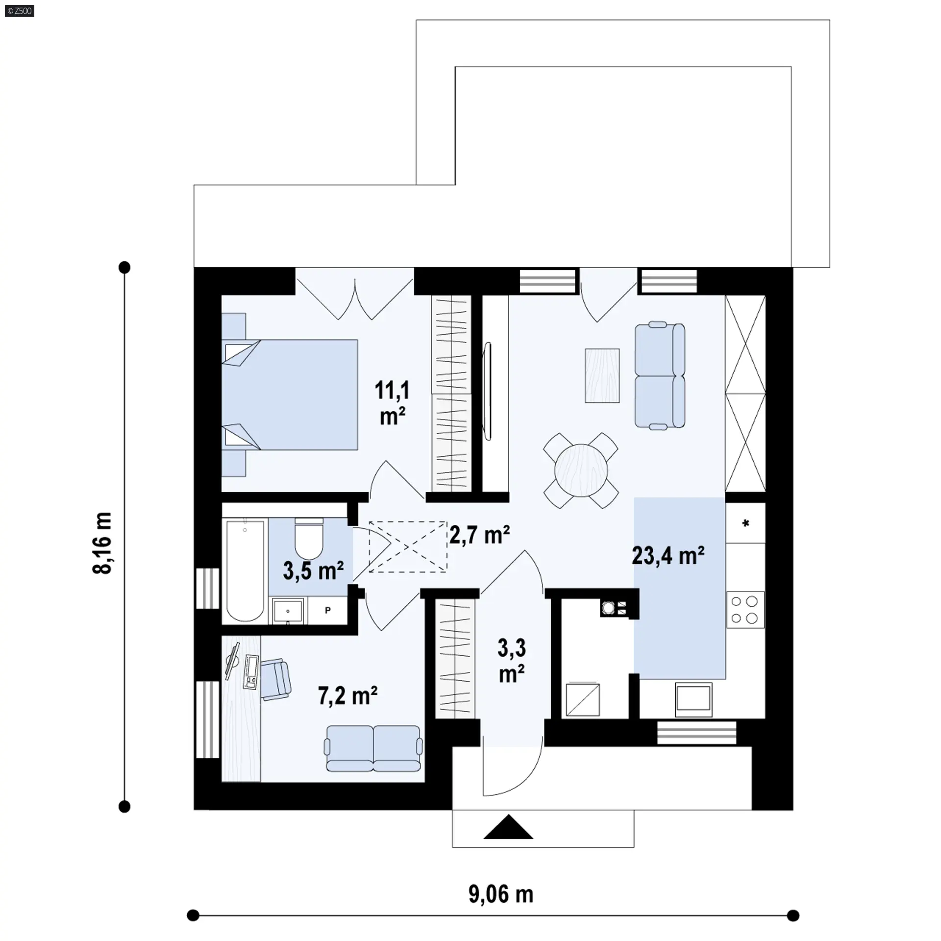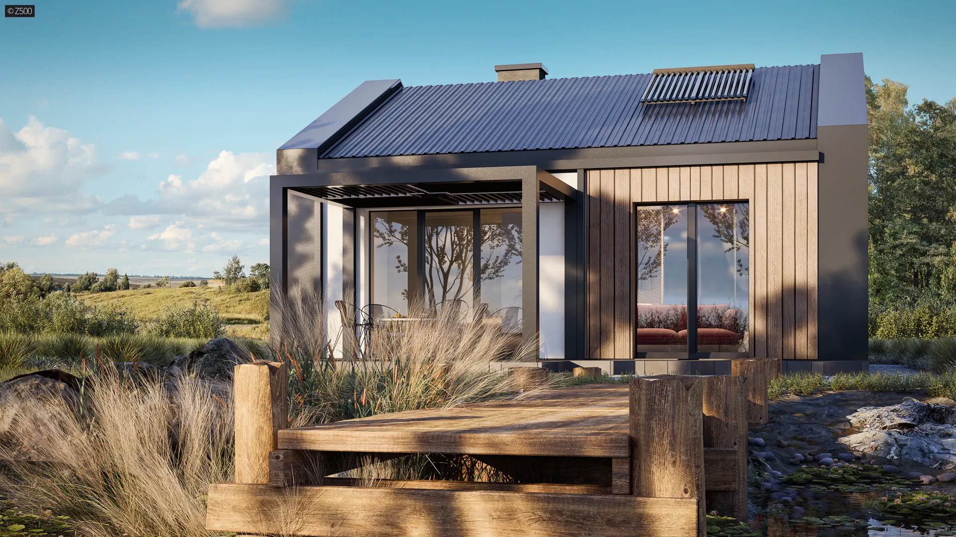 Z451 to propozycje niewielkiego, współczesnego domu z dwuspadowym dachem bez okapów. Elewację wykonano z drewna oraz ciemnego tynku. Wejście umieszczone centralnie od frontu zostało zadaszone poprzez cofnięcie ściany co stanowi atut w deszczowe lub śnieżne dni.