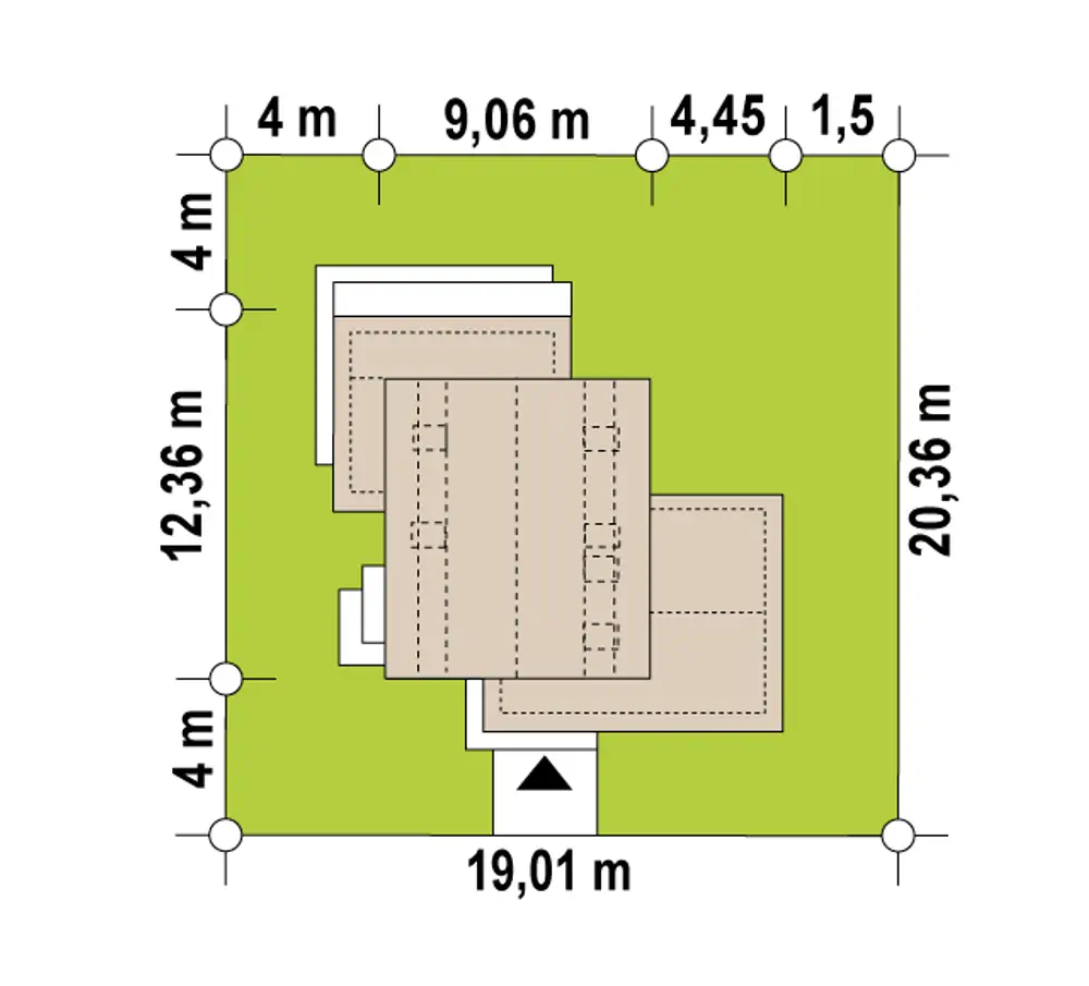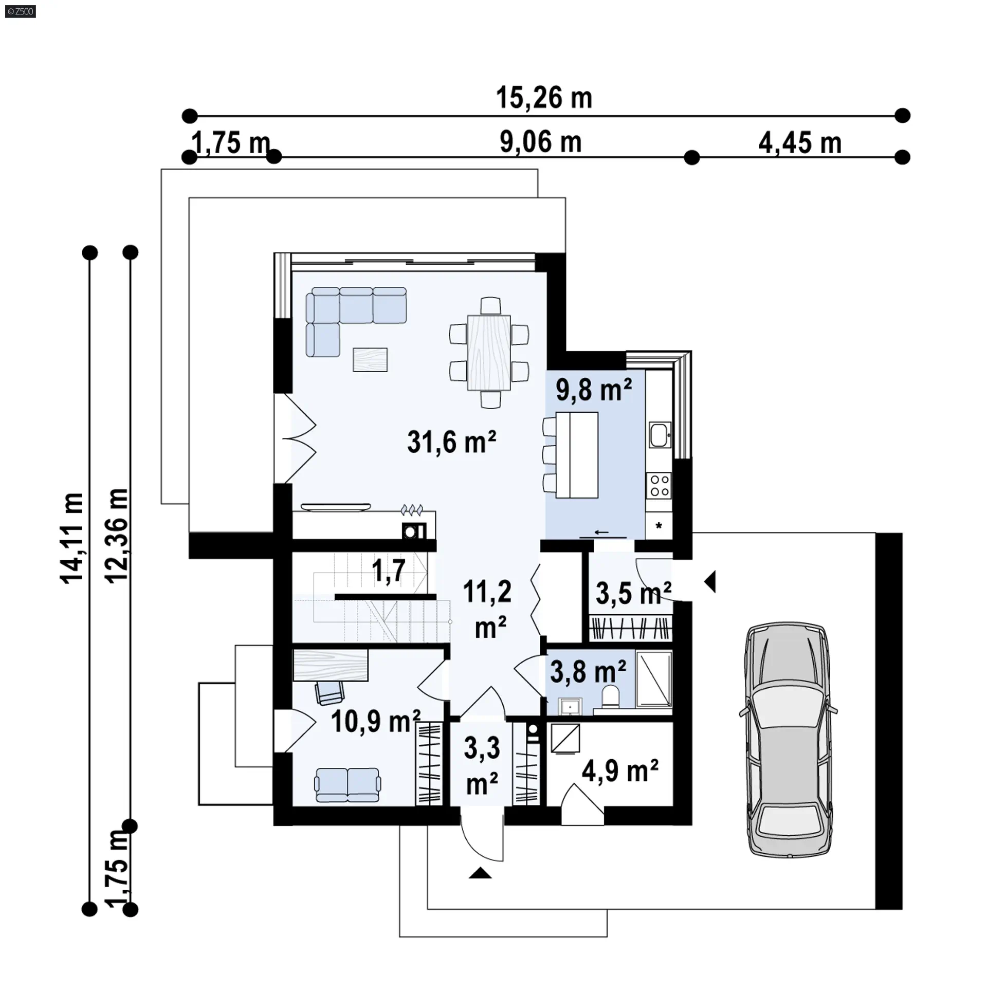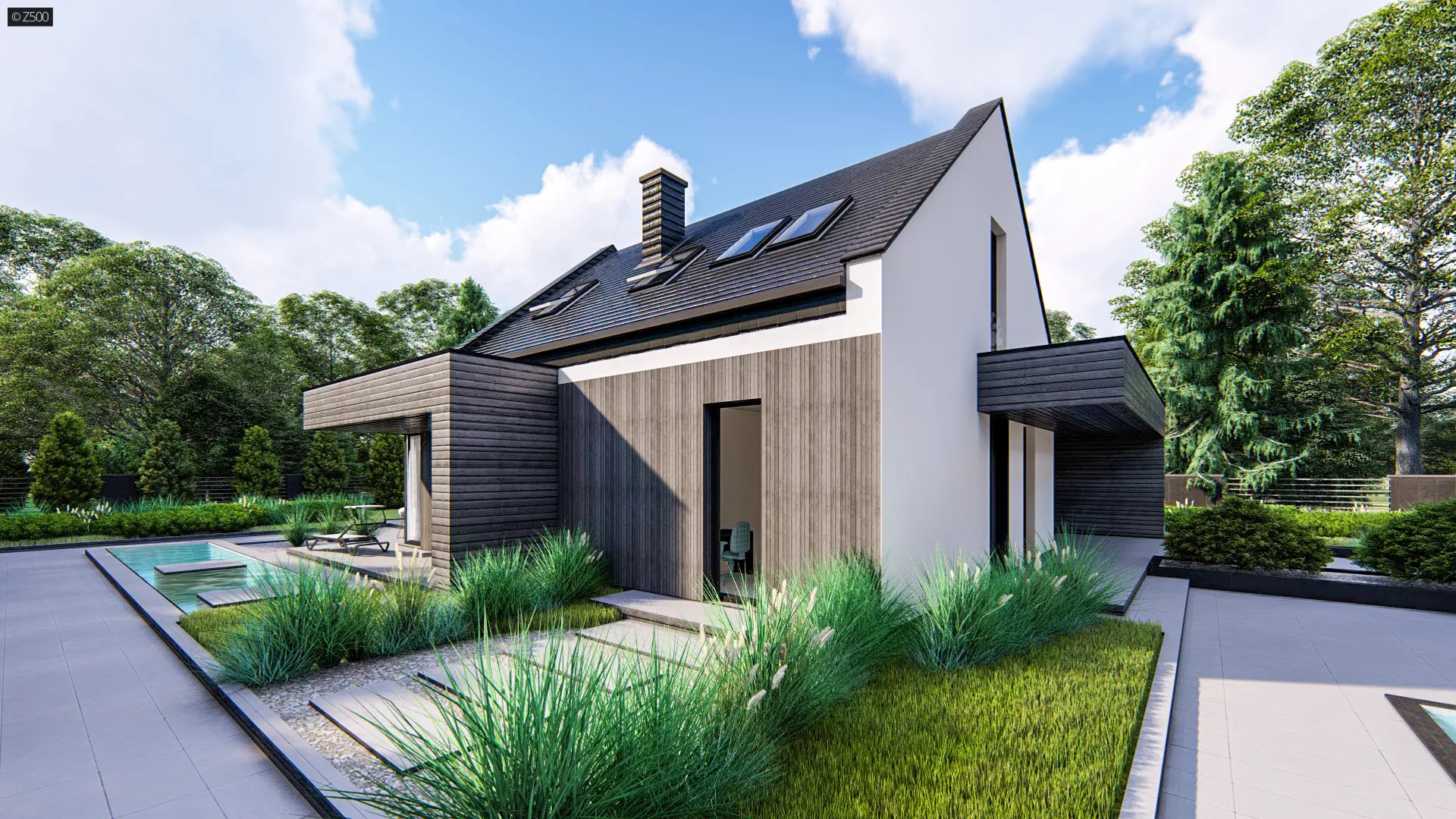 Dom jednorodzinny z dachem 2-spadowym i prostym zadaszeniem na samochód.