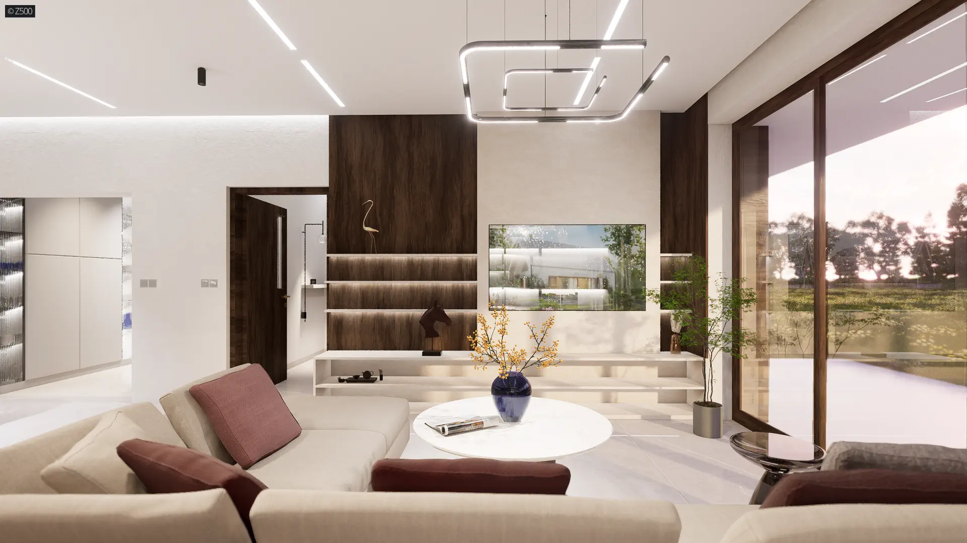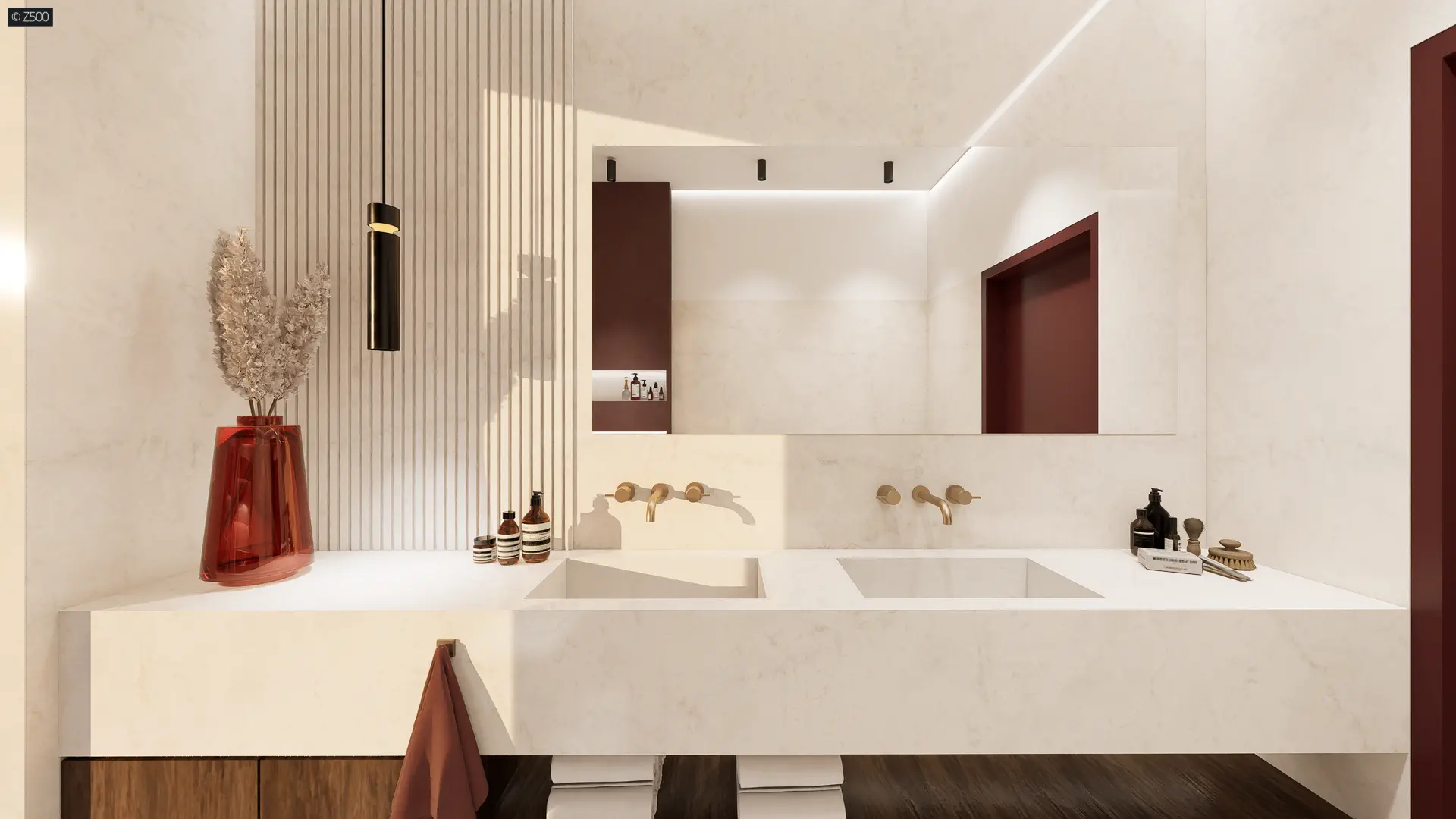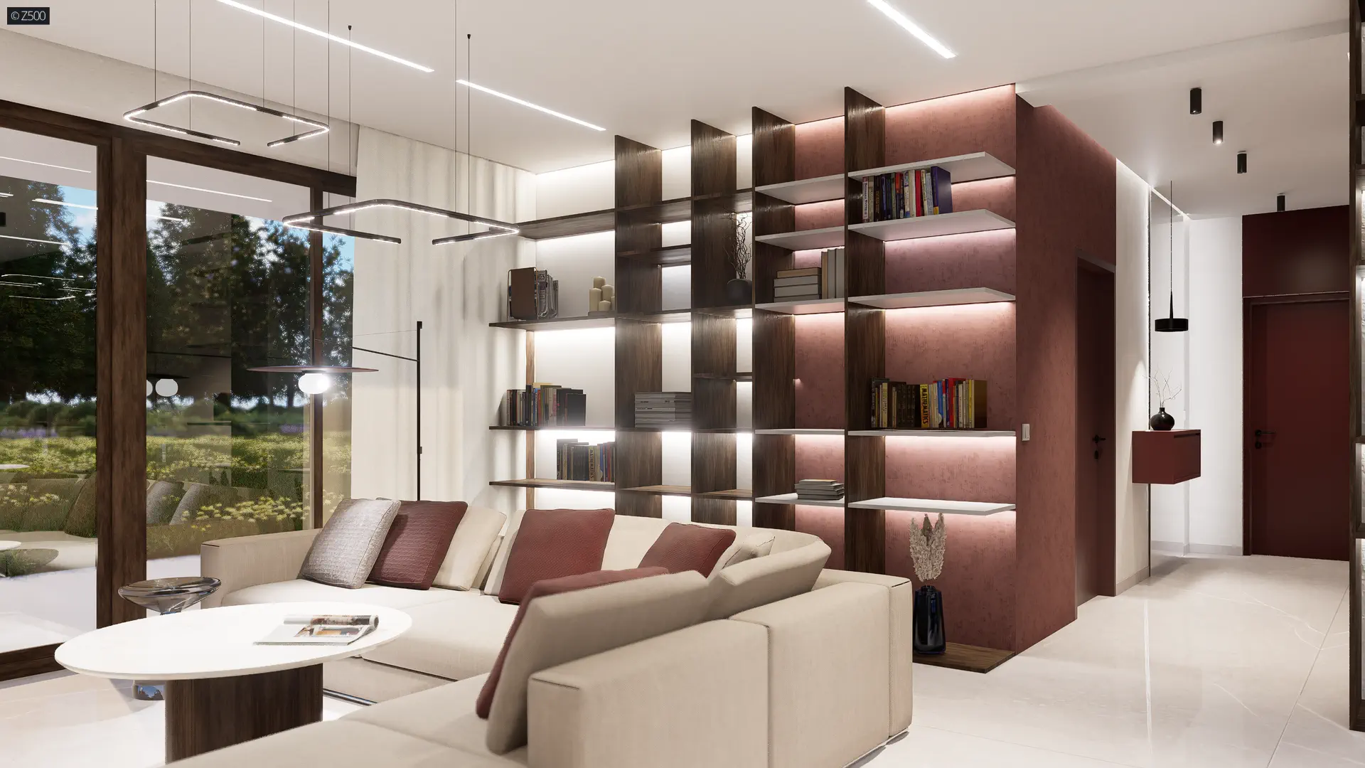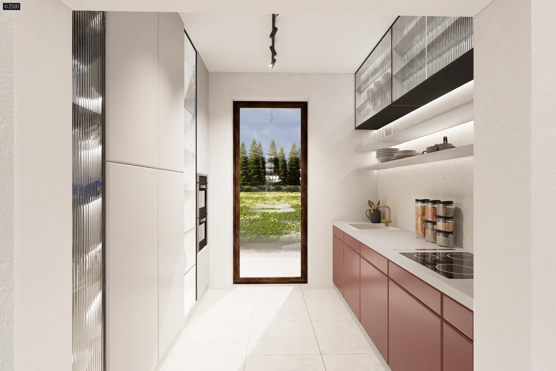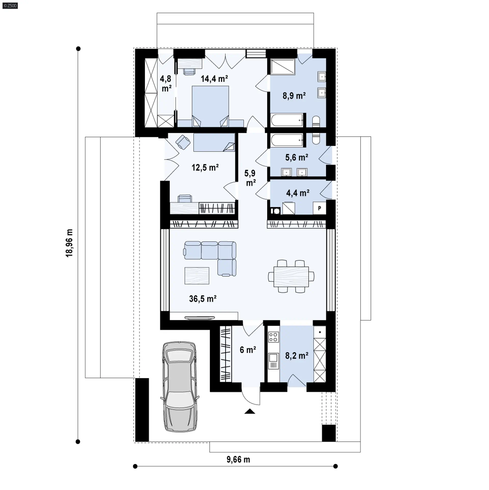 Projekt wyróżnia niewielka szerokość elewacji frontowej. Ciekawy układ funkcjonalny tworzy nietypowa, przejściowa strefa dzienna z obficie doświetlonym salonem, jadalnią i wyspą kuchenną. Pozostała część kuchni jest wyraźnie wydzielona, a jednocześnie otwarta na salon. W dalszej części domu ulokowano ogólnodostępną łazienkę, pomieszczenie gospodarcze oraz 2 sypialnie, w tym jedną typu masterbedroom z własną, dużą, nowoczesną łazienką i dużą garderobą.