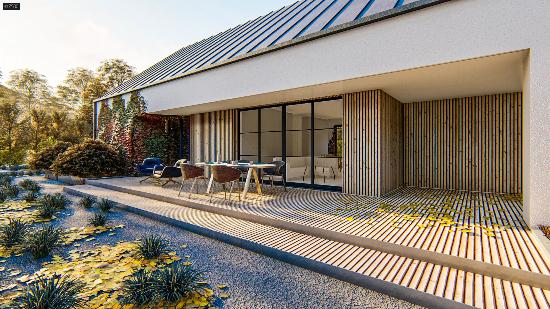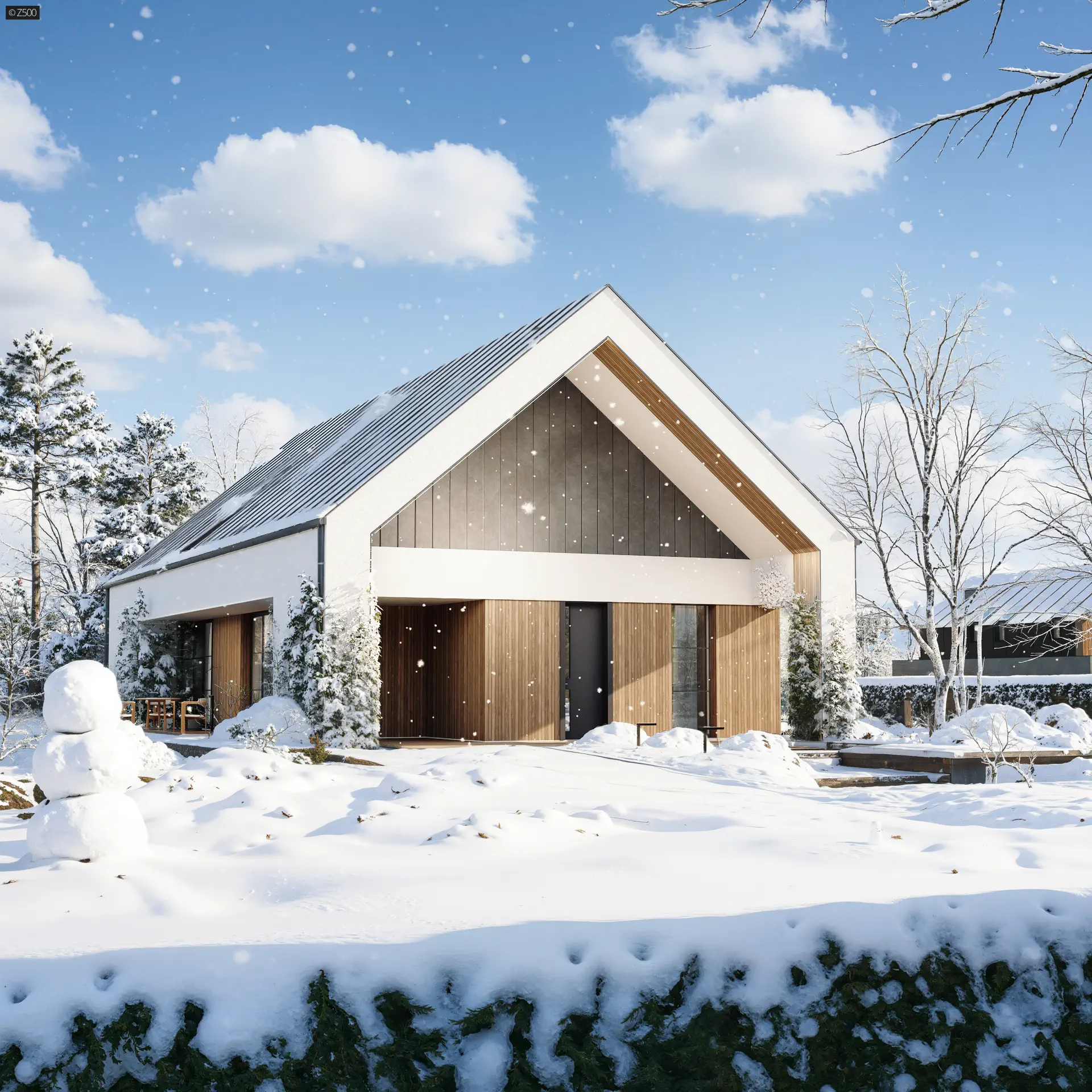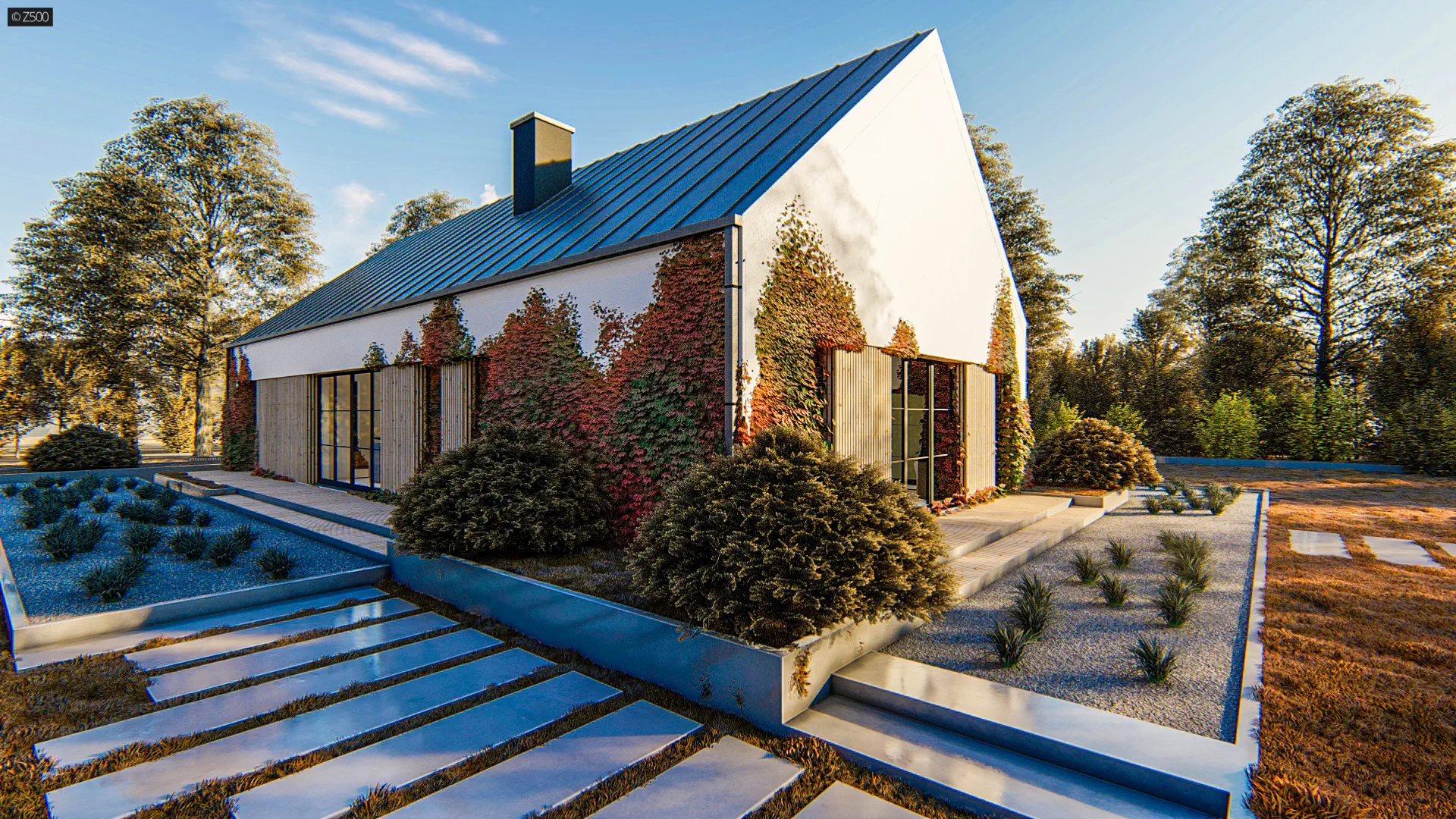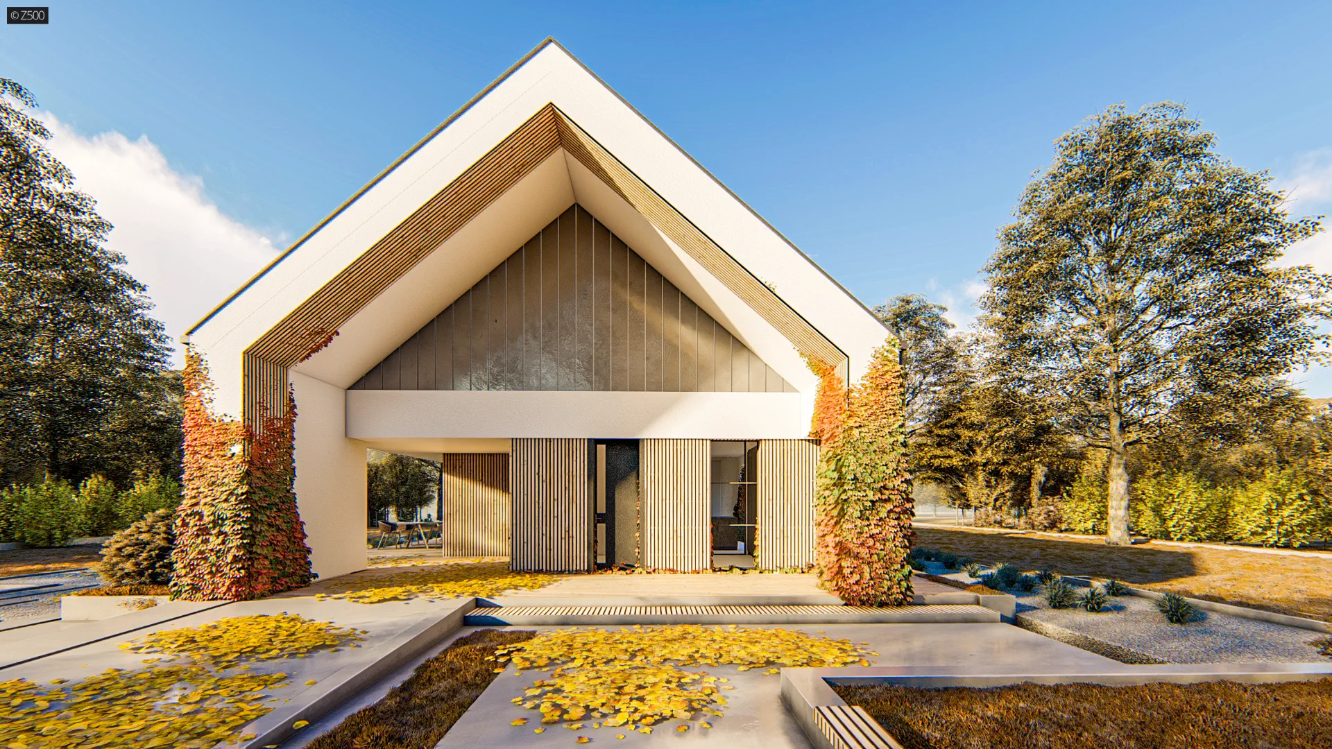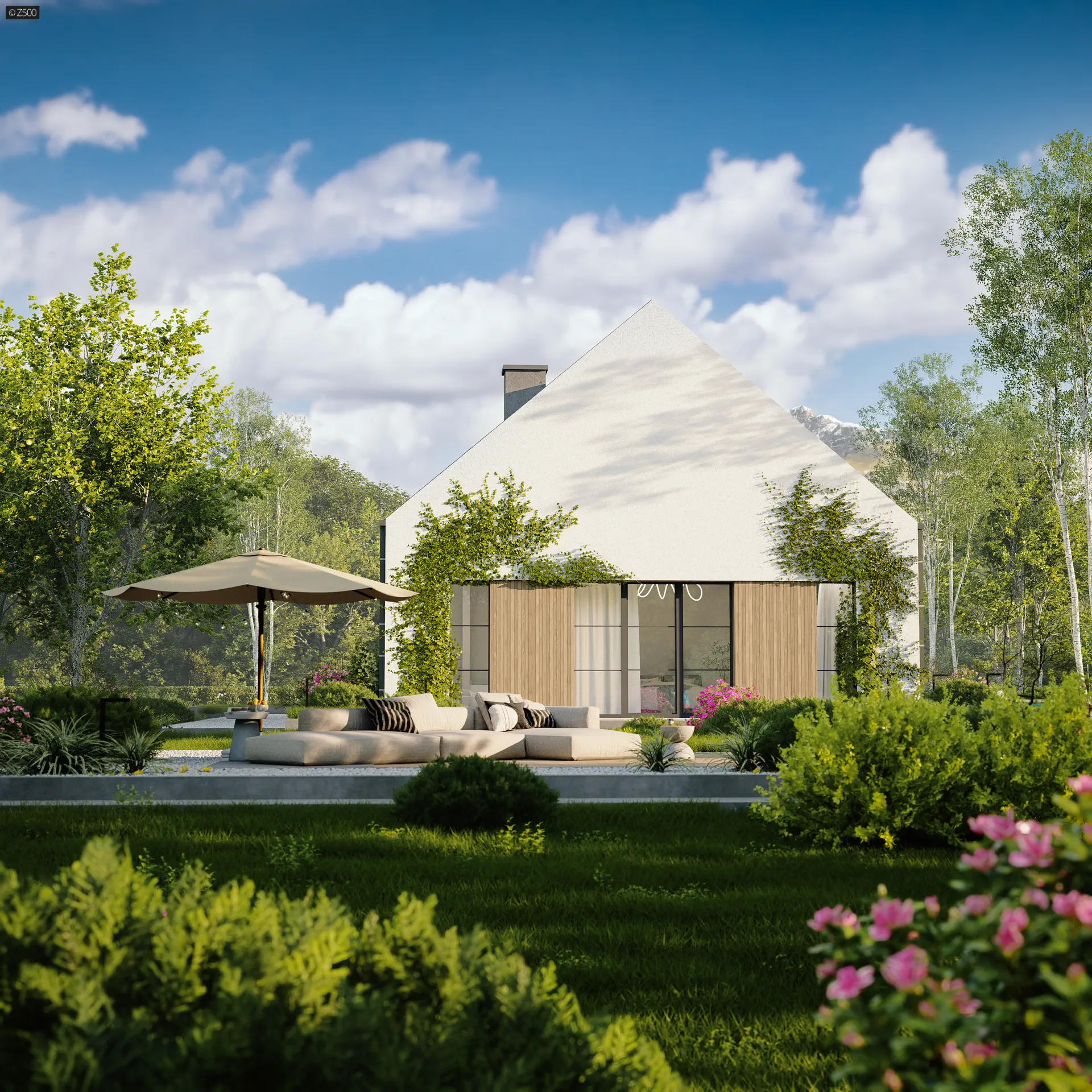 Przedłużenie dachu od frontu tworzy niepozorną wiatę, którą można wykorzystać również jako zadaszony frontowy taras.