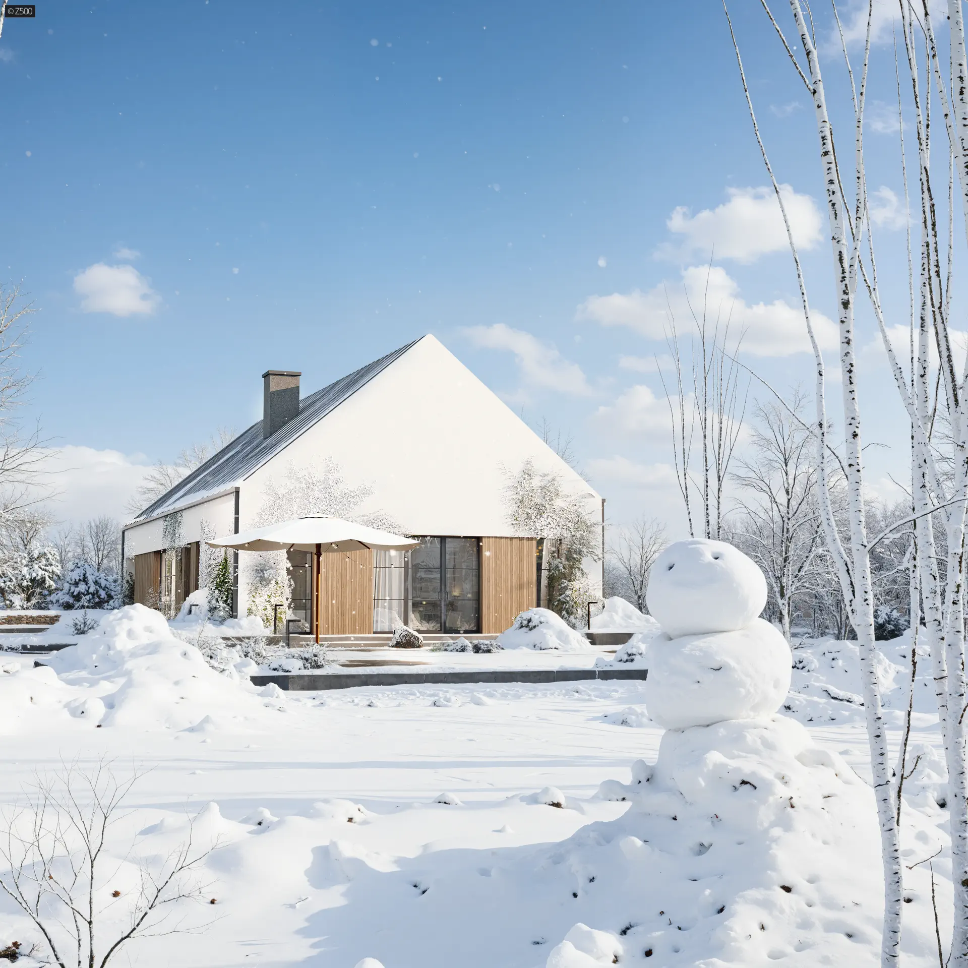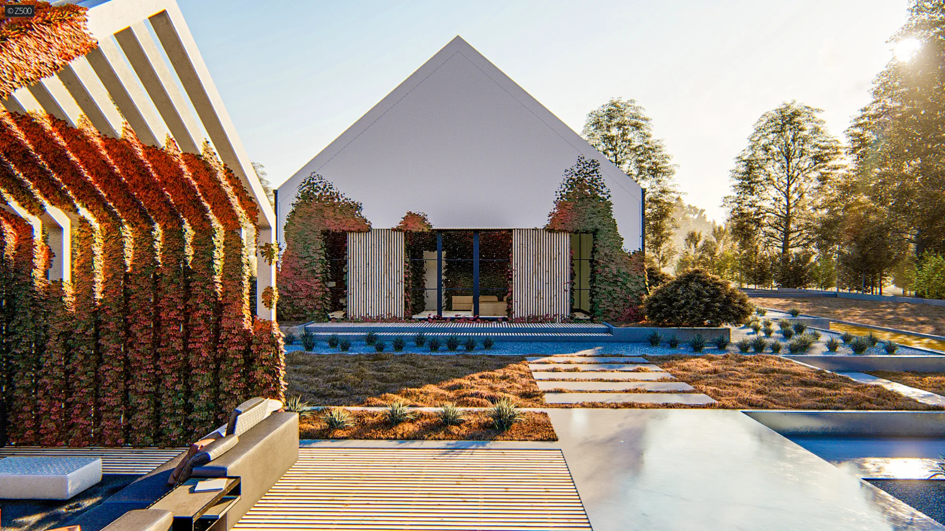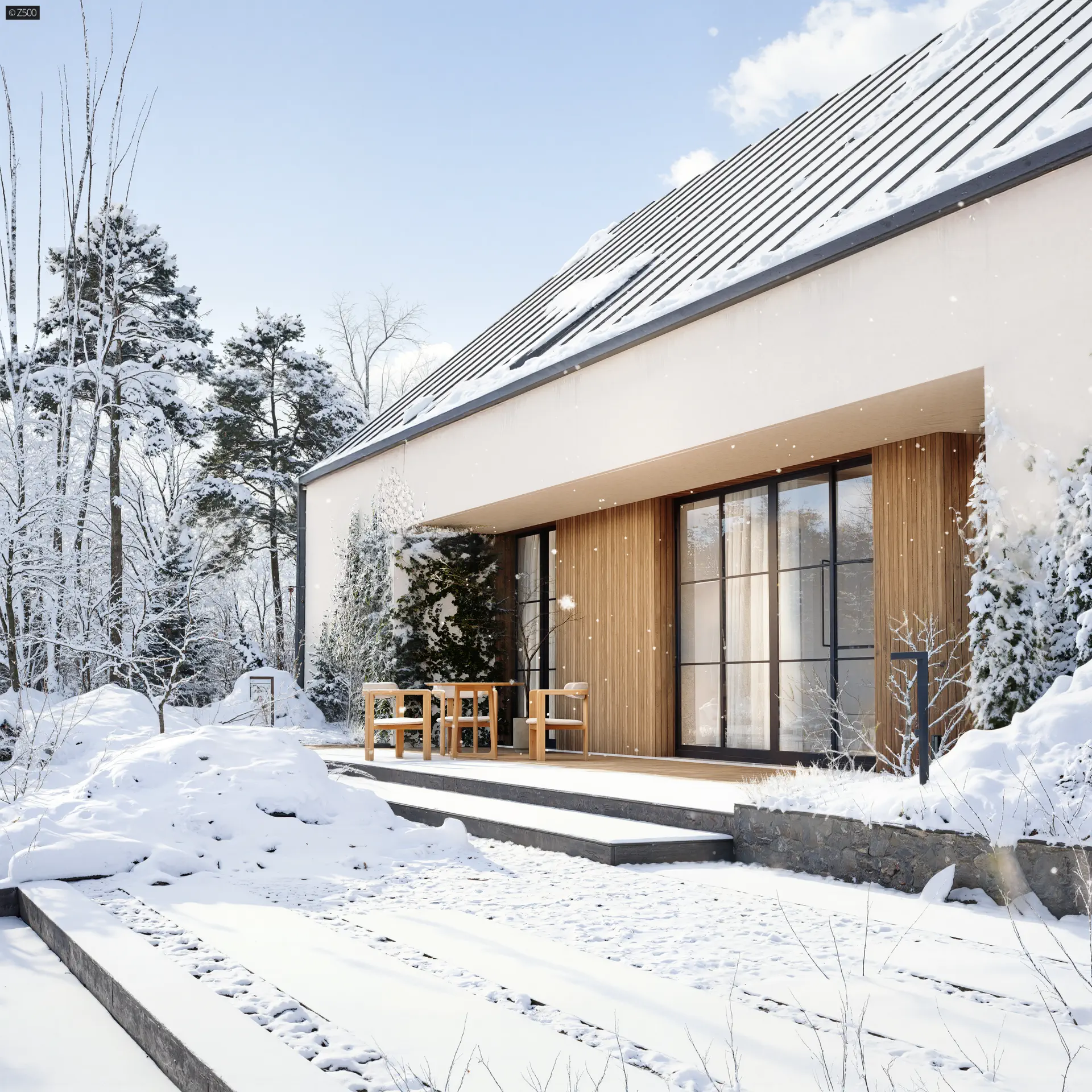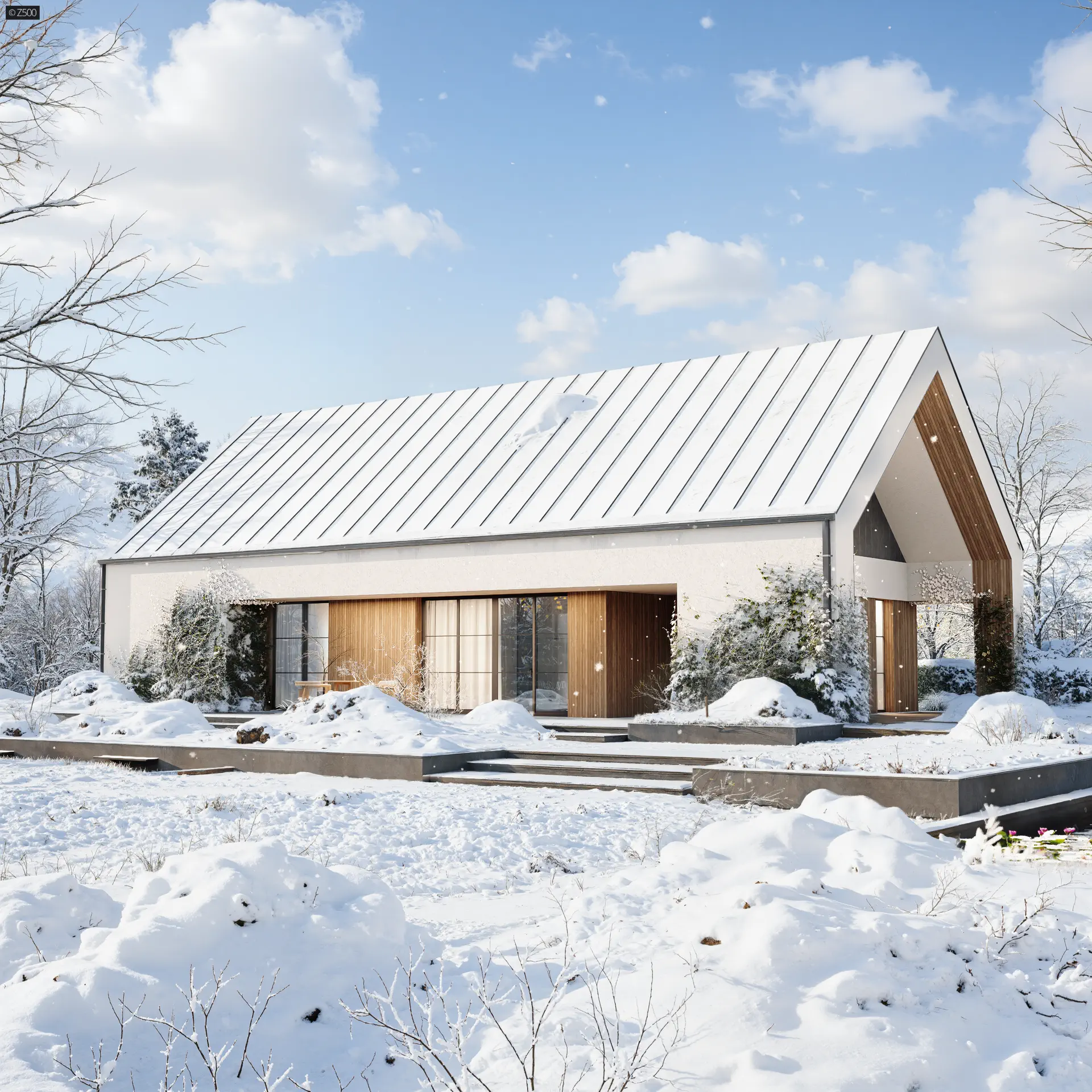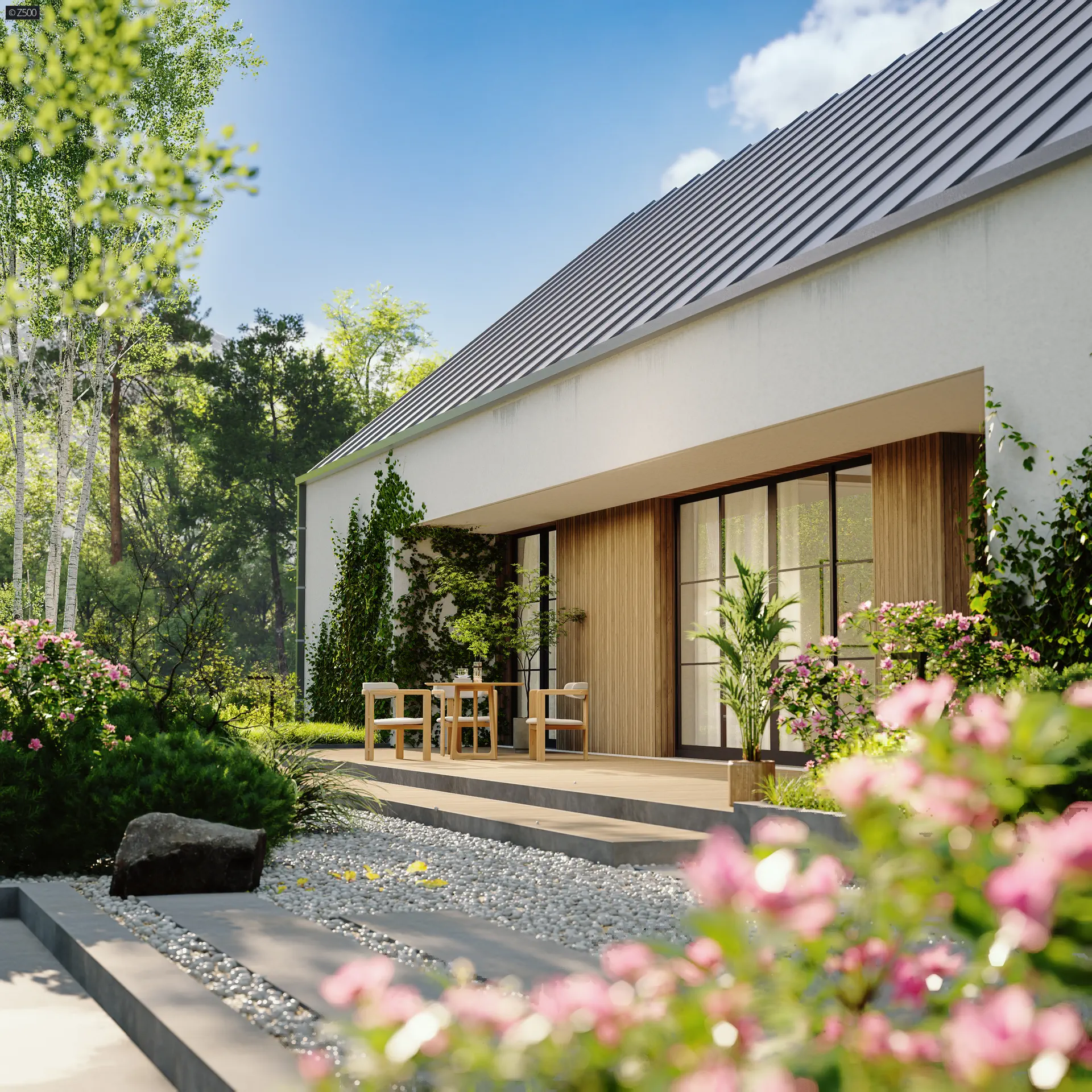 Przedłużenie dachu od frontu tworzy niepozorną wiatę, którą można wykorzystać również jako zadaszony frontowy taras.
