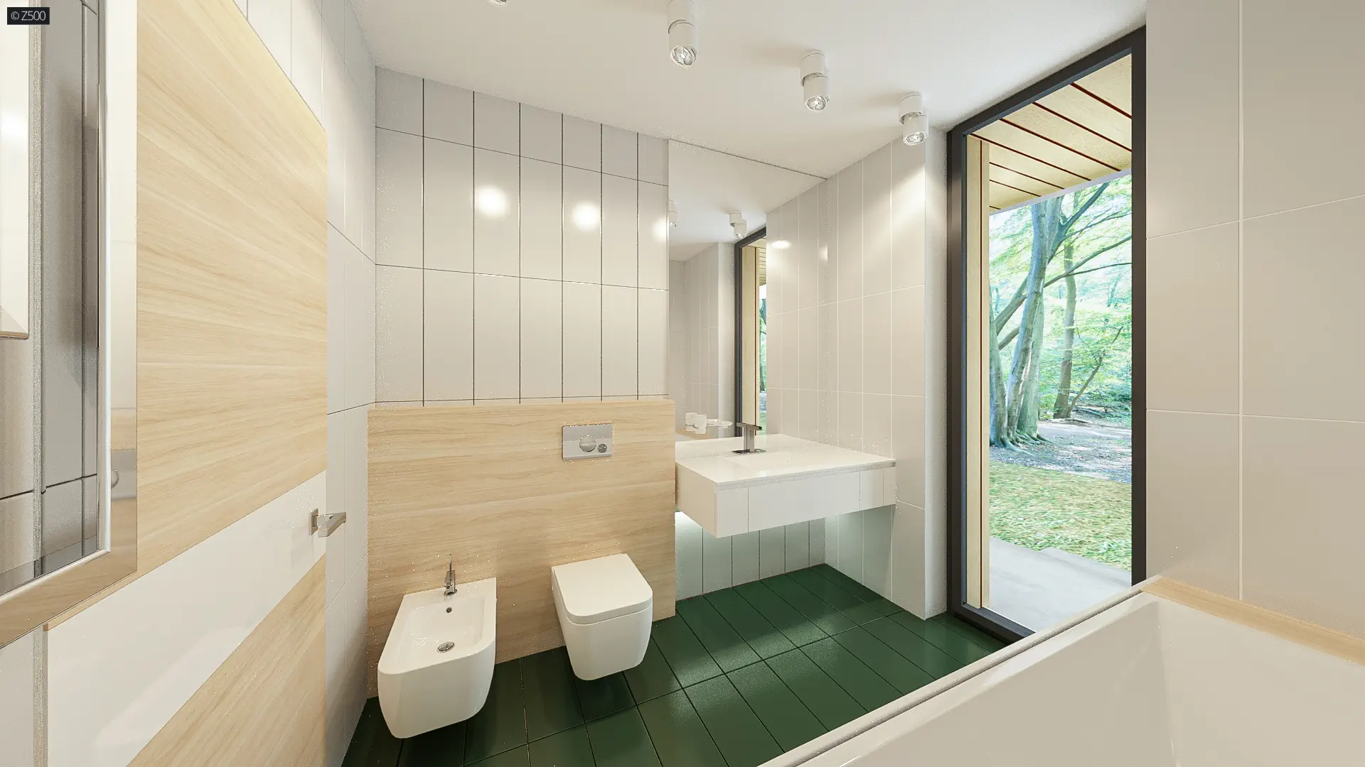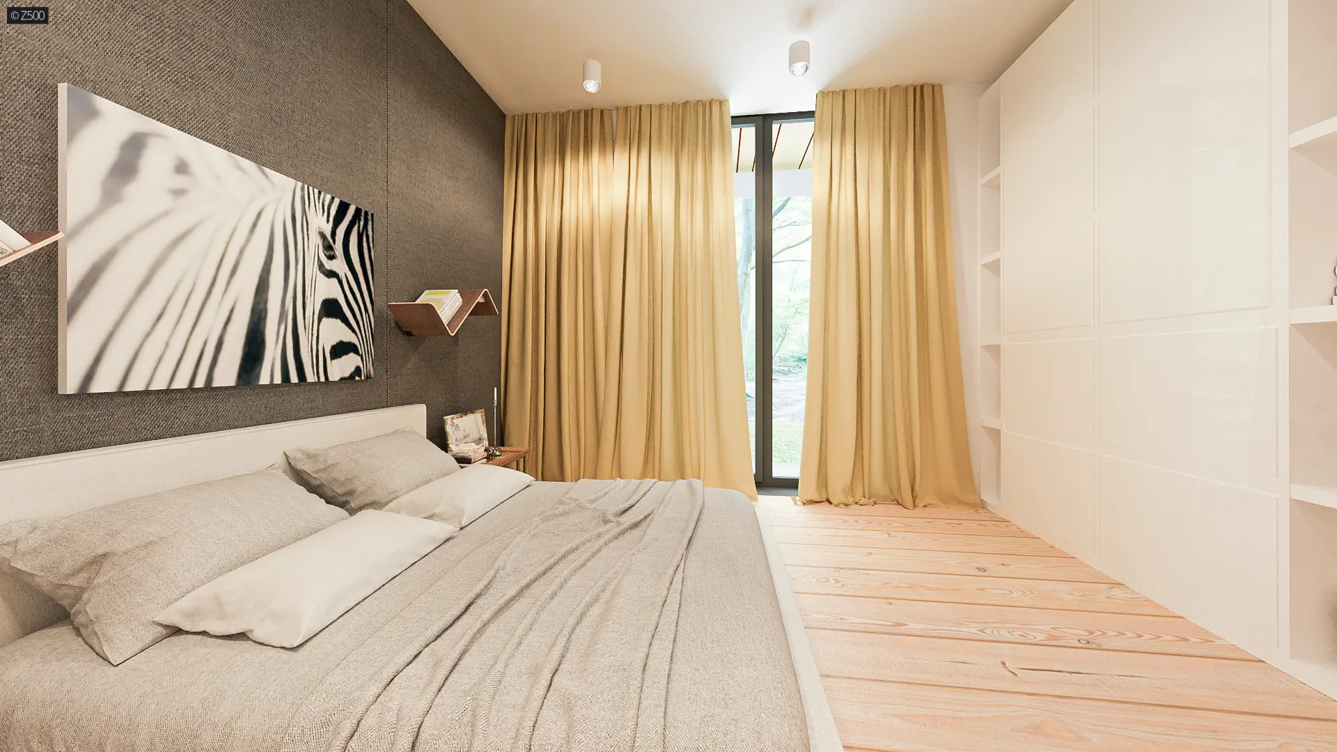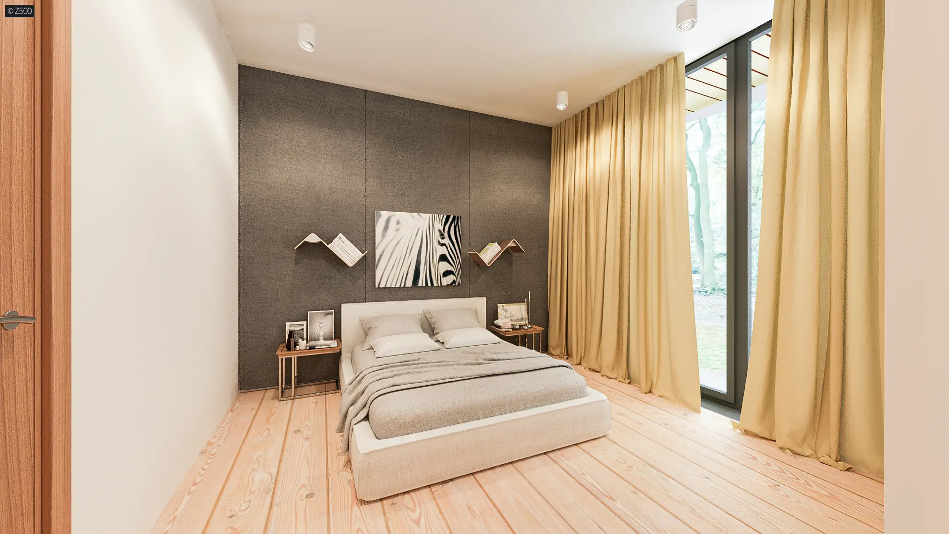 Strefa nocna to 3 sypialnie i przestronna łazienka. Korytarz prowadzi również do garażu i pośrednio do pomieszczenia gospodarczego, mogącego pełnić także rolę schowka na rowery, kosiarkę lub meble ogrodowe.