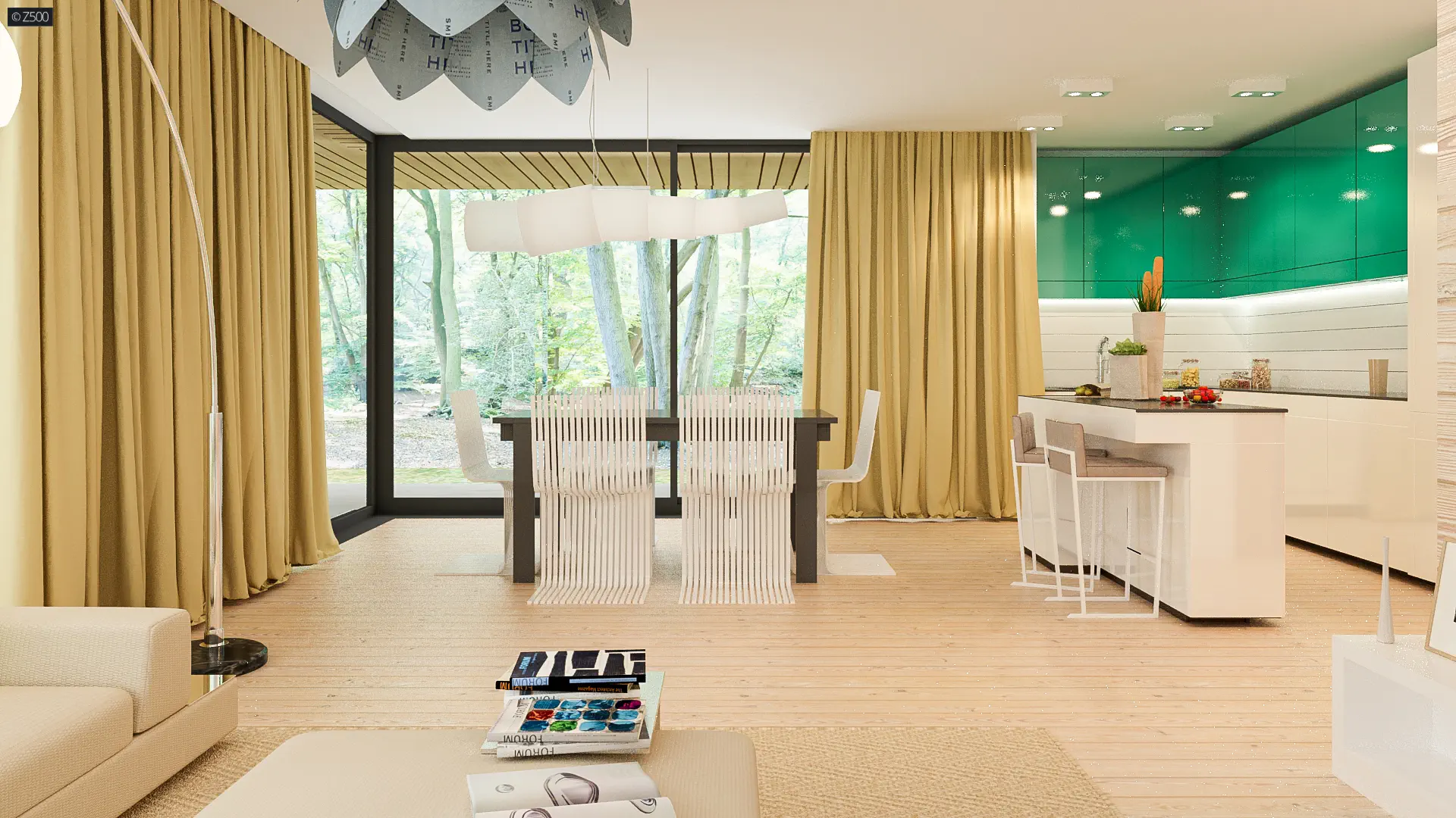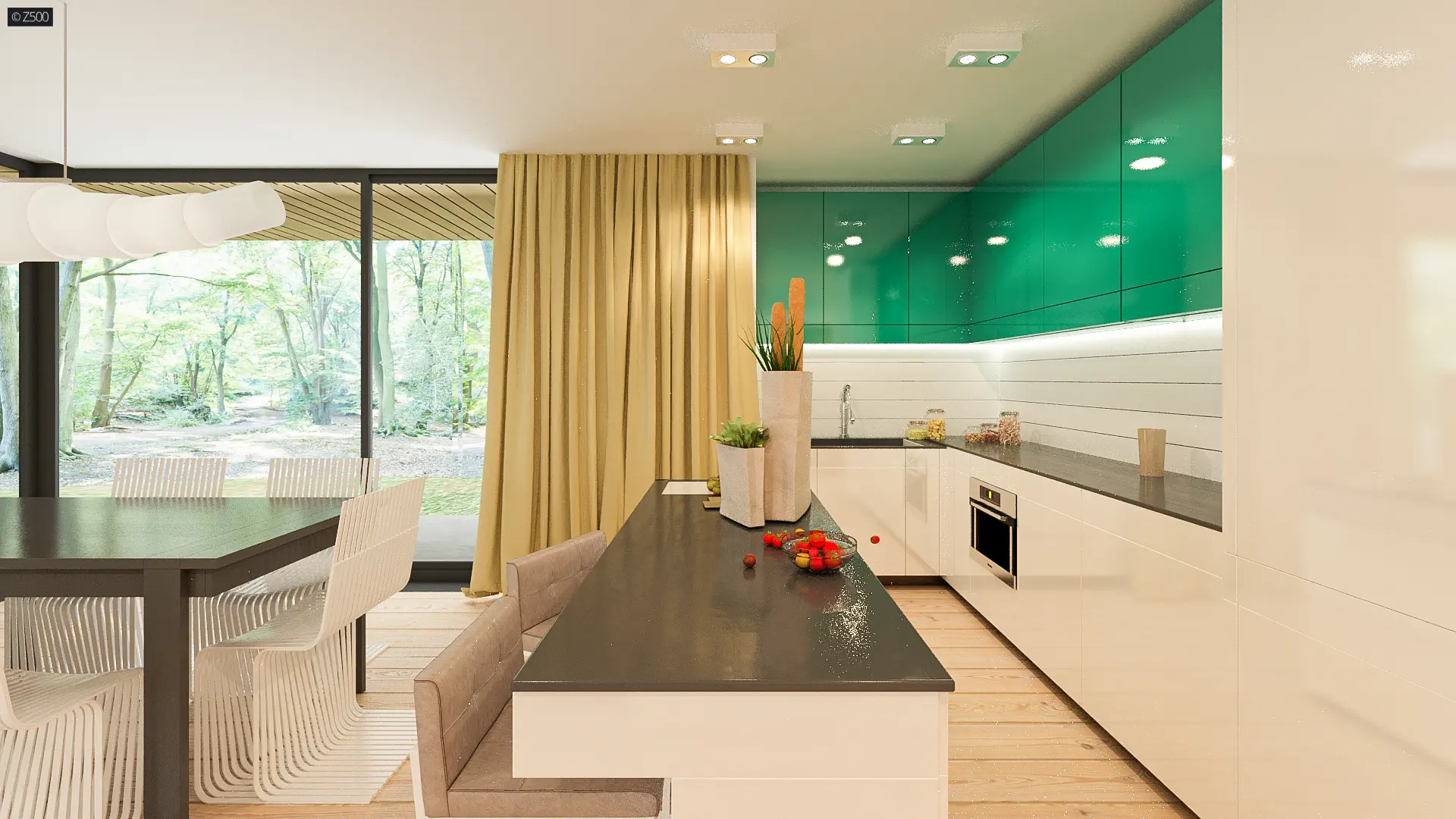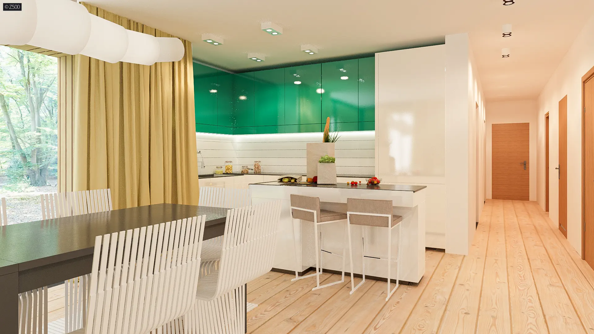 Dom posiada prosty i wygodny układ funkcjonalny. Wyraźnie wyróżnia się przestronna, otwarta strefa dzienna z miejscem na komplet wypoczynkowy, duży stół i kuchnią w nowoczesnym stylu. Wyspa z barkiem subtelnie wydziela granice pomiędzy kuchnią a jadalnią. Obszerny salon, dzięki dużym otworom okiennym może w ciepłe, słoneczne dni zostać dodatkowo powiększony o powierzchnię tarasu.