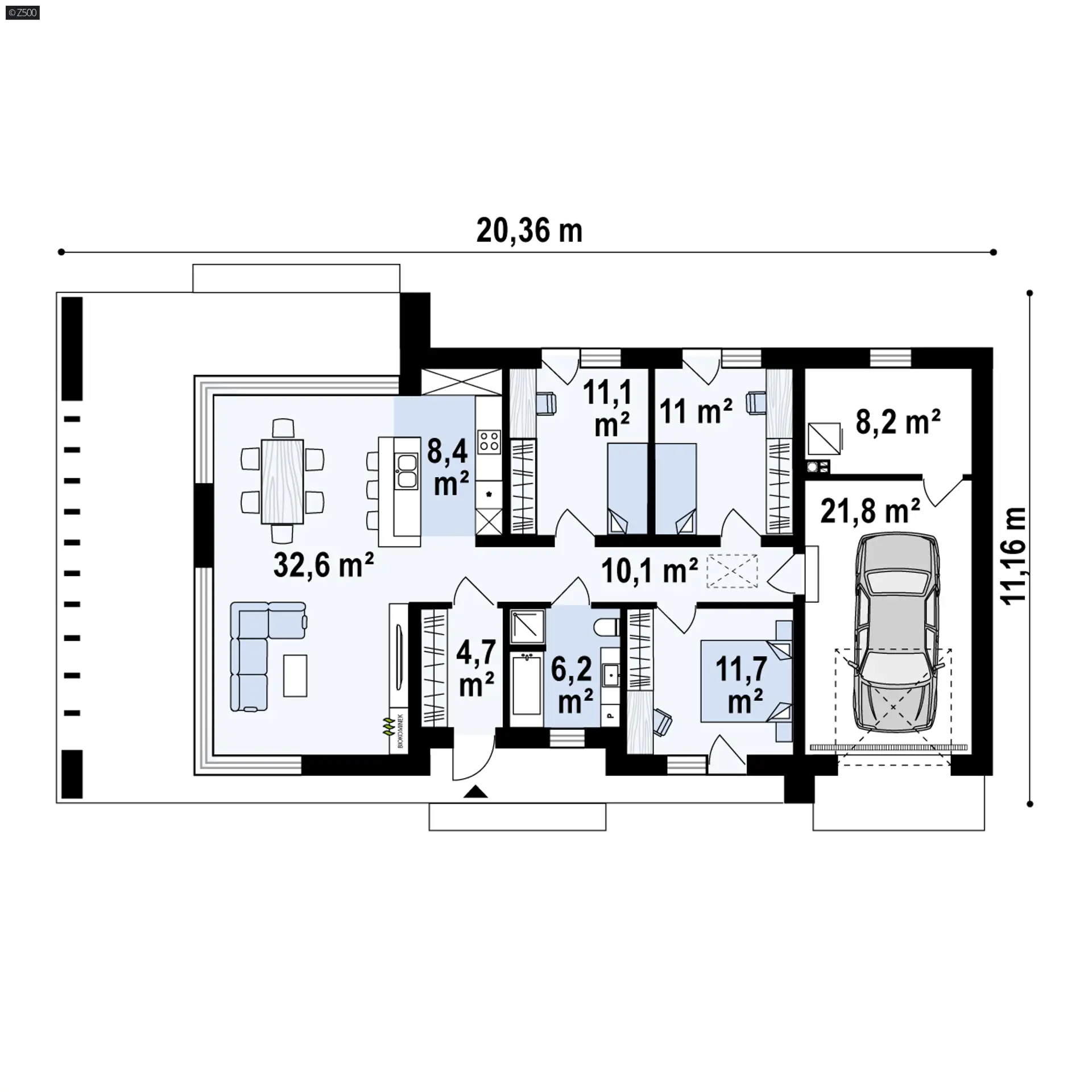 Parterowy dom z dachem 2-spadowym, 3 sypialniami oraz dużym zadaszonym tarasem.