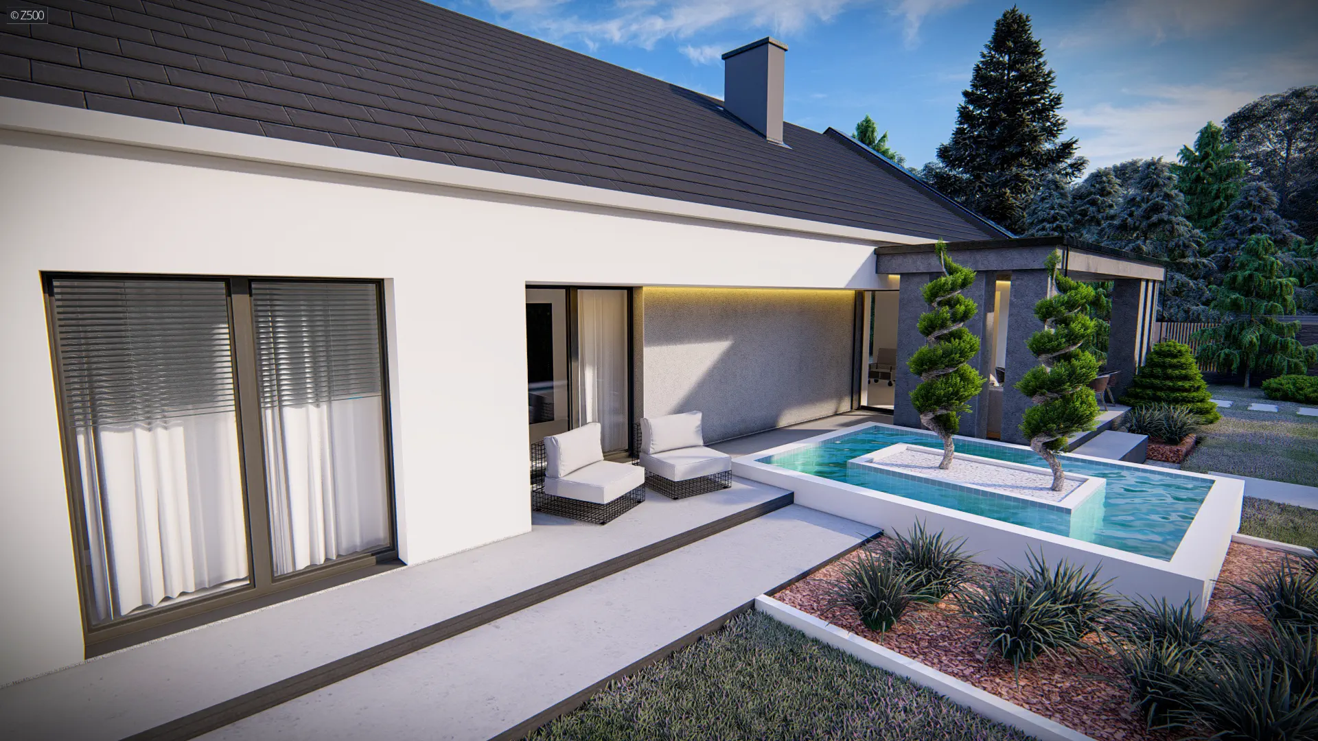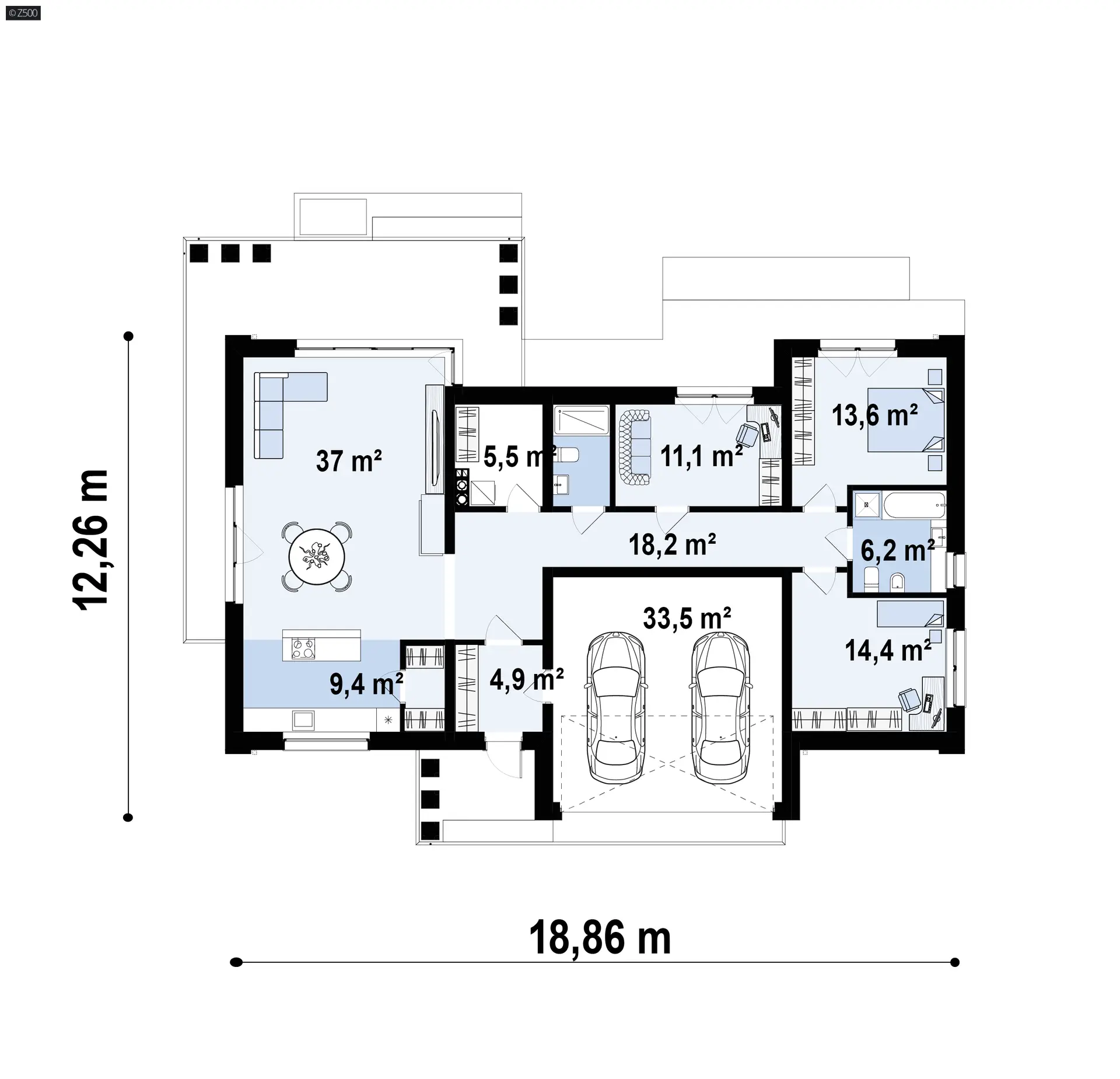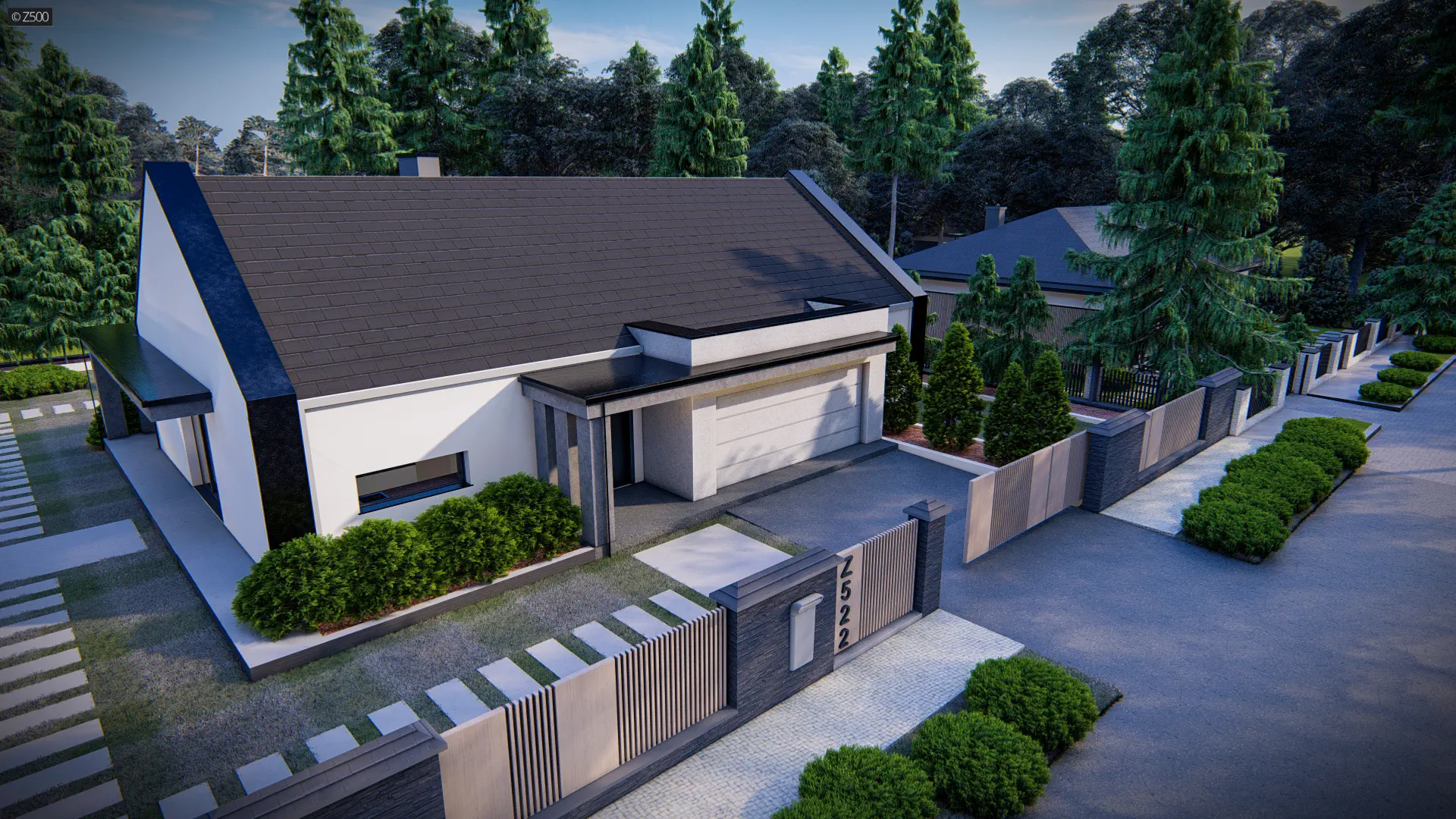 Parterowy dom z garażem 2 stanowiskowym, 3 sypialniami i dachem 2-spadowym.