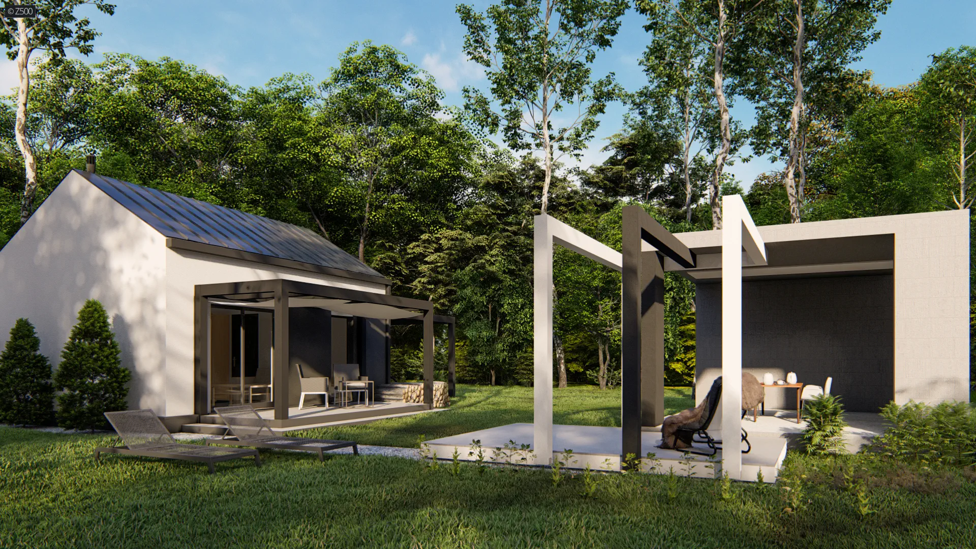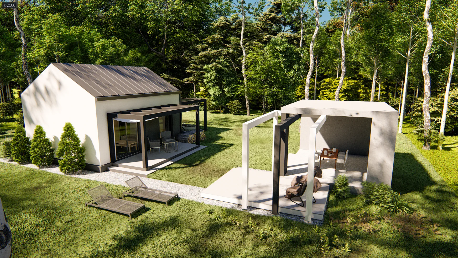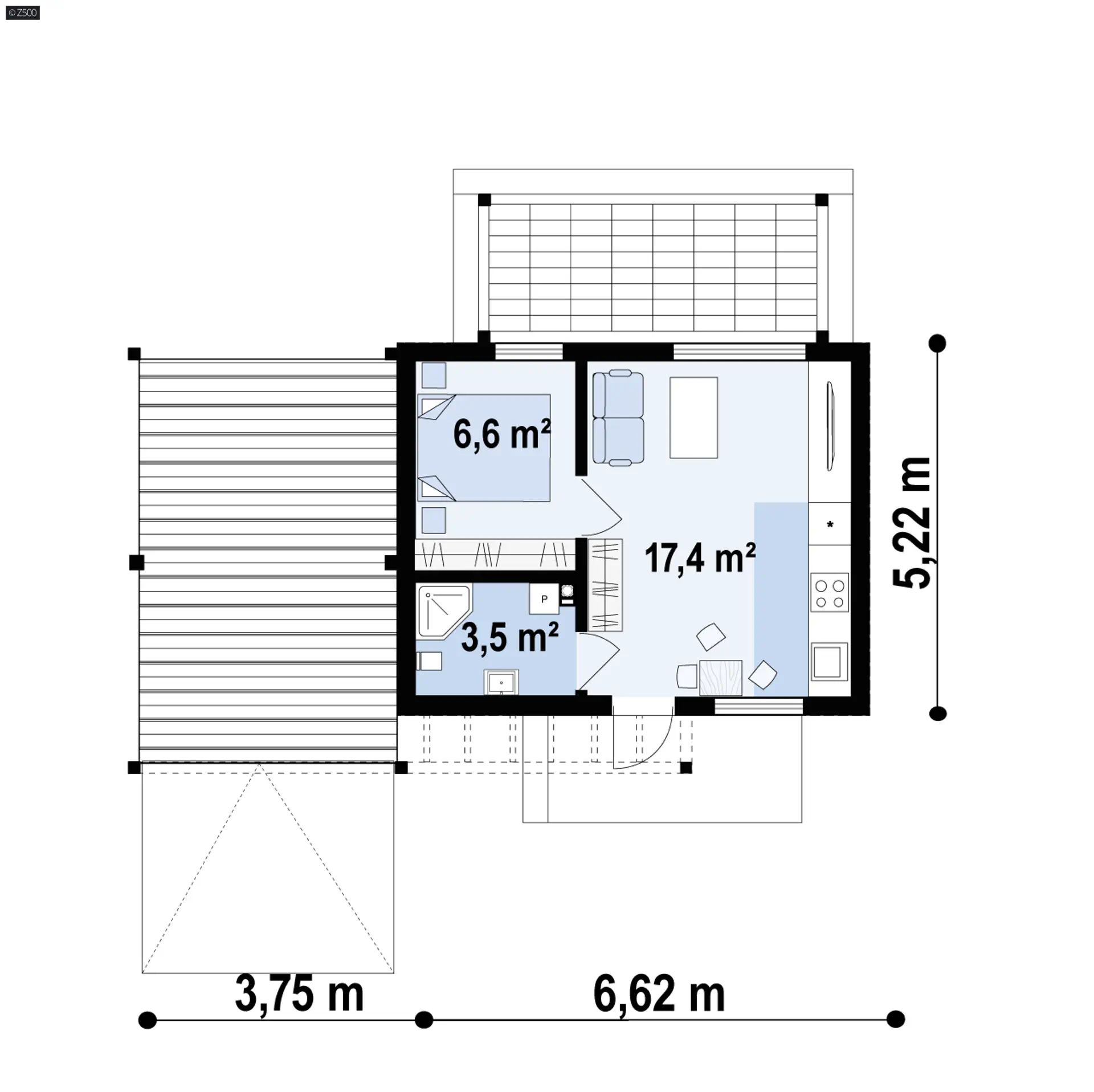 Projekt domu Z544 D to dom jednorodzinny całoroczny o powierzchni zabudowy do 35m2. W układzie przewidziano 1 sypialnia, 1 łazienka, salon 17,39 m², bez garażu. Minimalna działka: 12,62 m × 13,22 m.