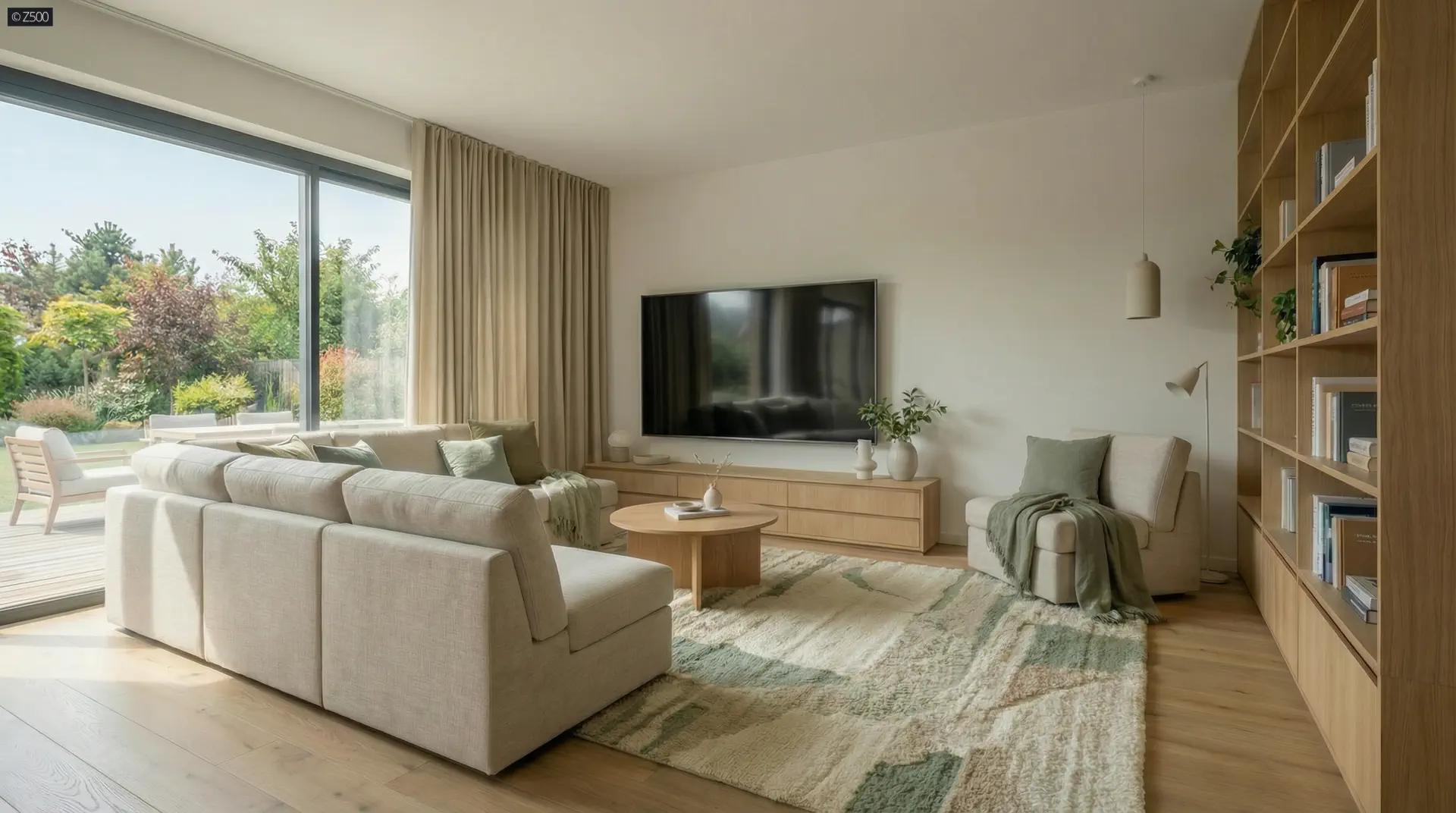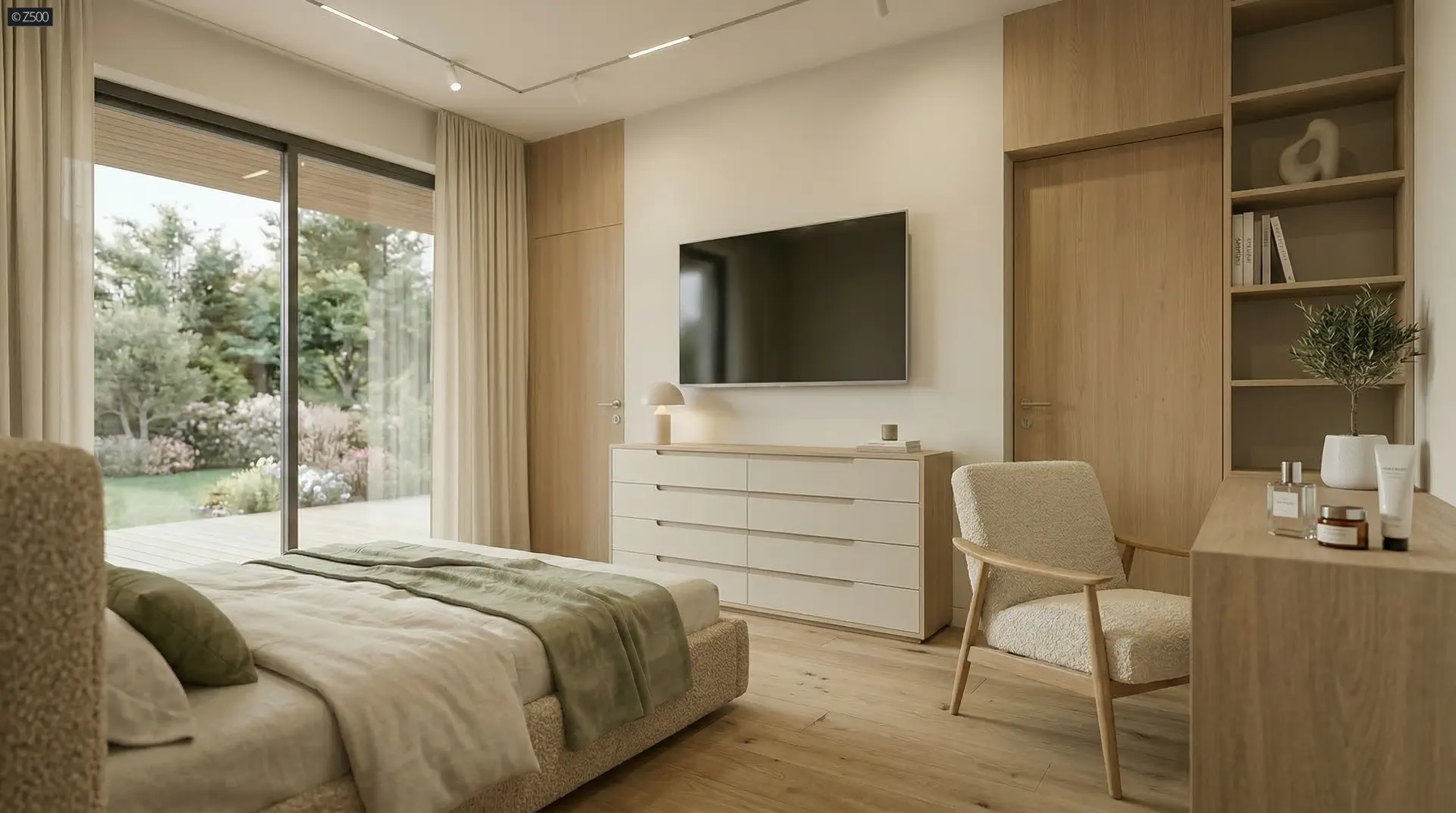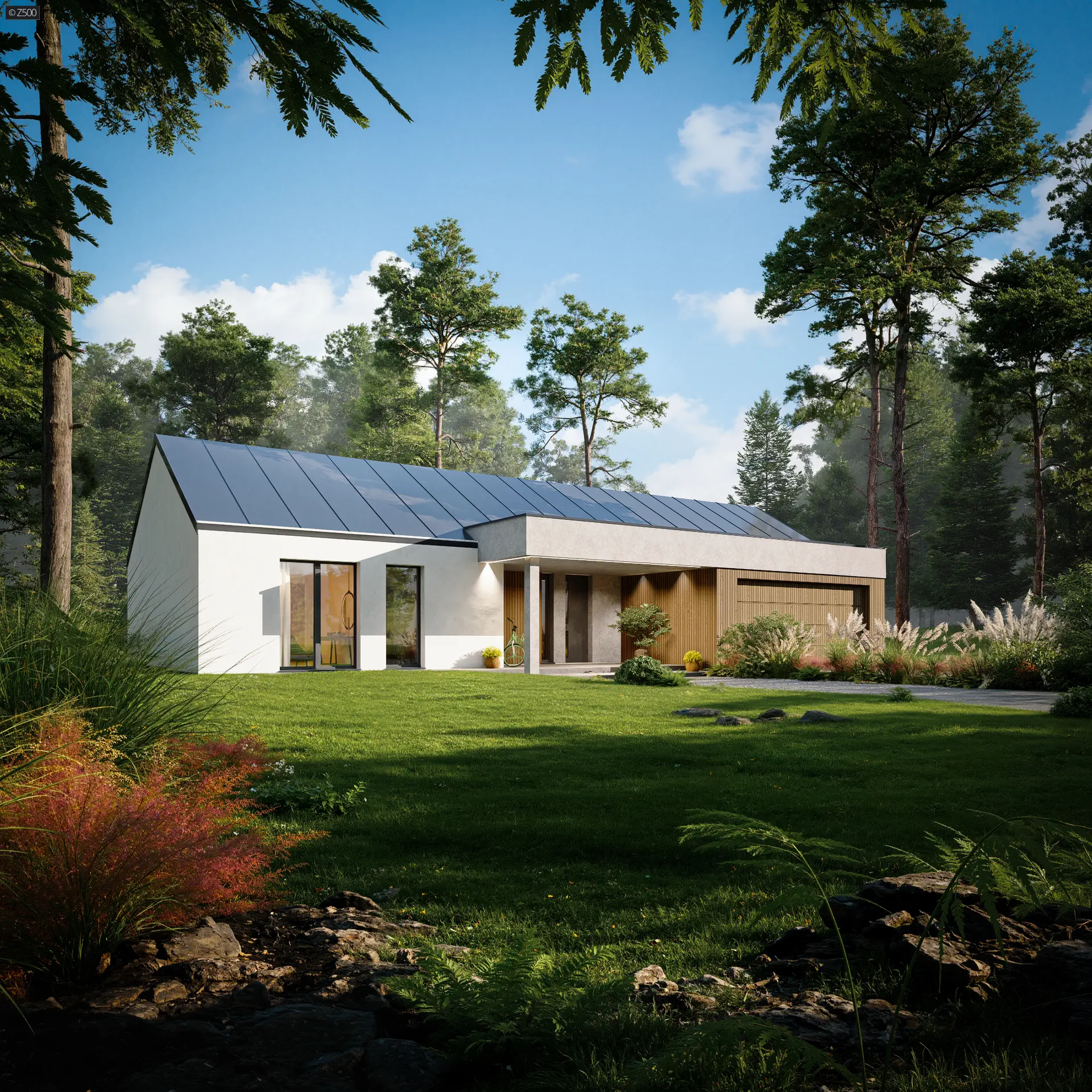 Projekt domu Z565 to dom parterowy z dachem dwuspadowym i 4 pokojami oraz garażem na 2 samochody. W układzie przewidziano 3 sypialnie, 3 łazienki, salon 38,83 m², garaż na 2 auta. Minimalna działka: 26,76 m × 21,56 m.