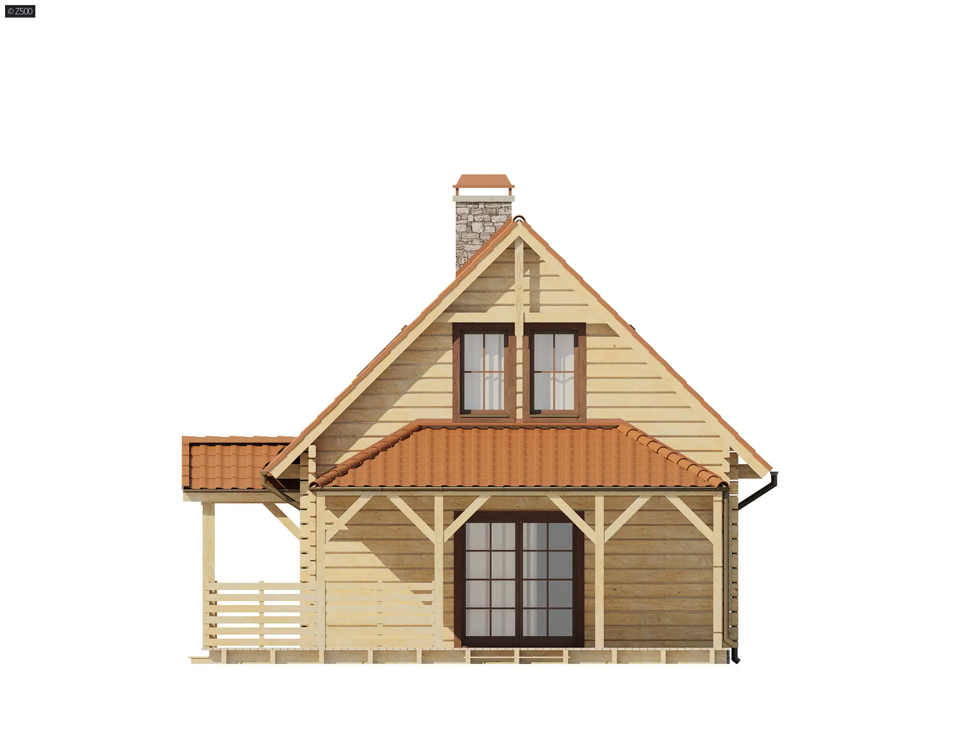 Dom drewniany z poddaszem i zadaszoną werandą na taras, ekonomiczny w budowie
