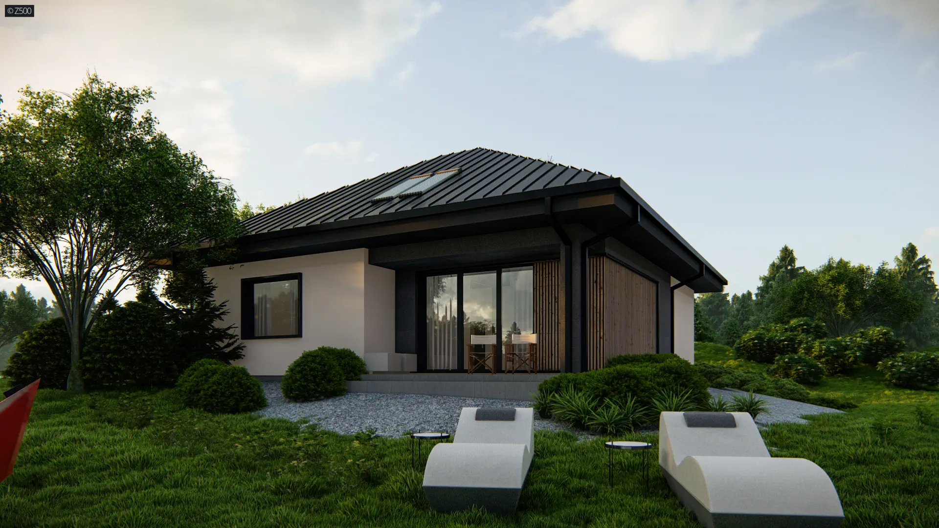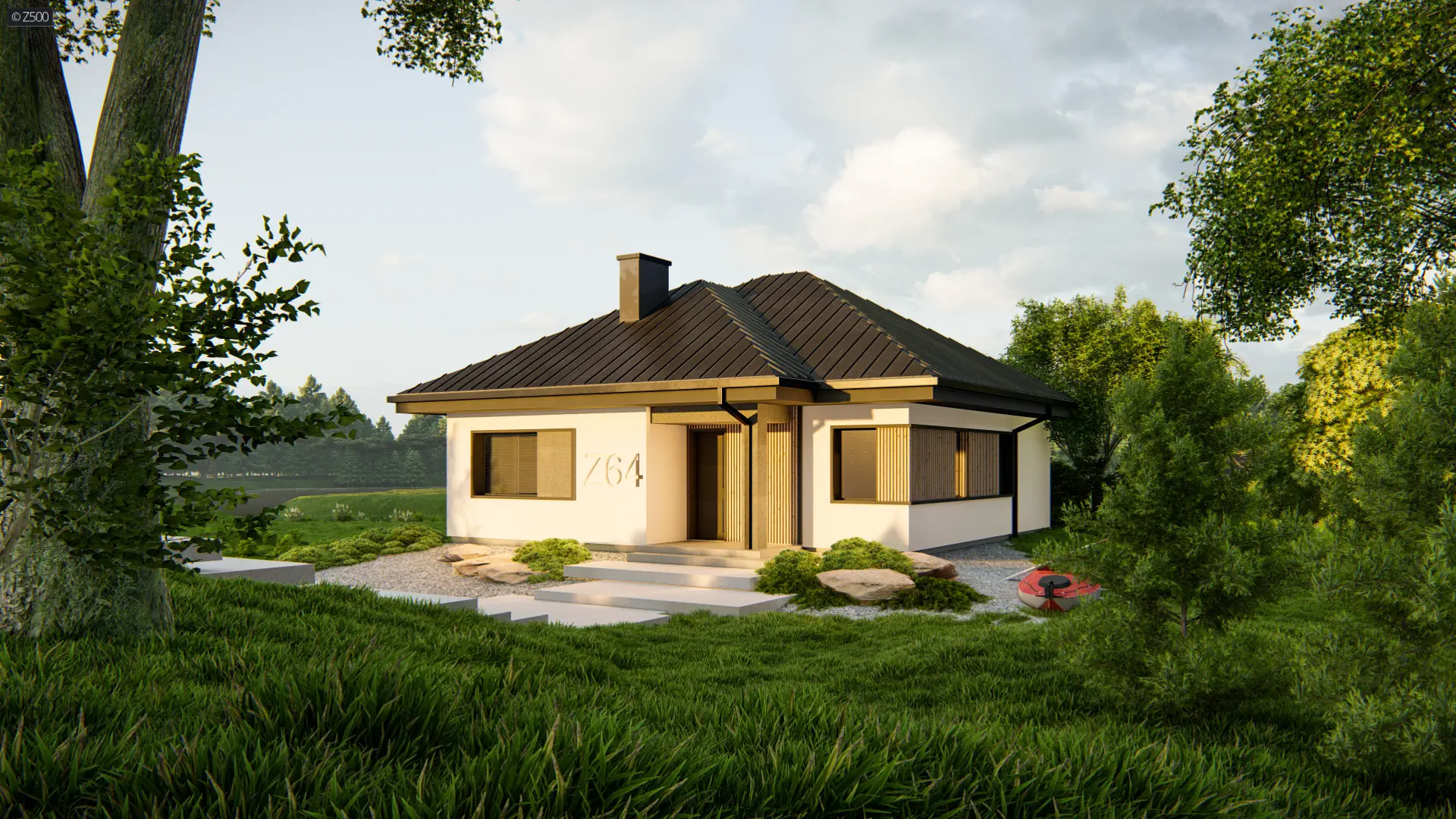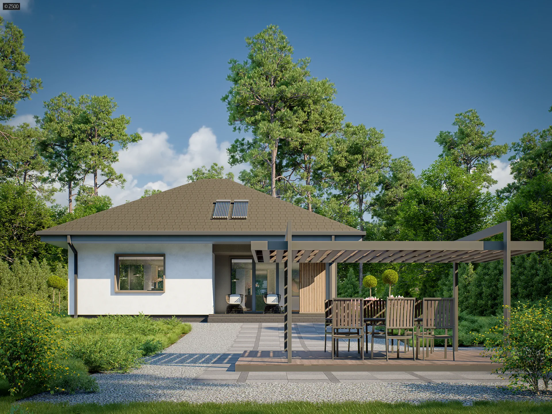 Mały i parterowy dom z funkcjonalnym układem pomieszczeń i zadaszonym tarasem