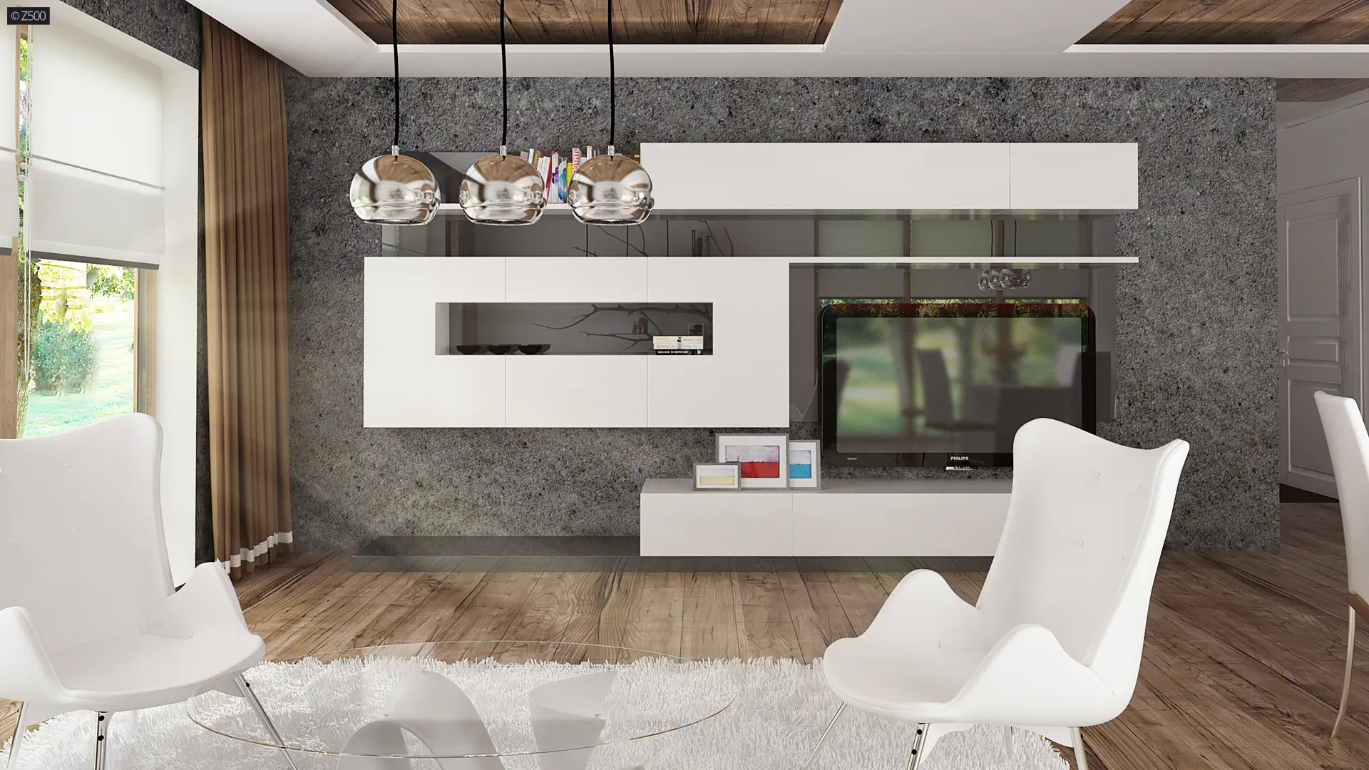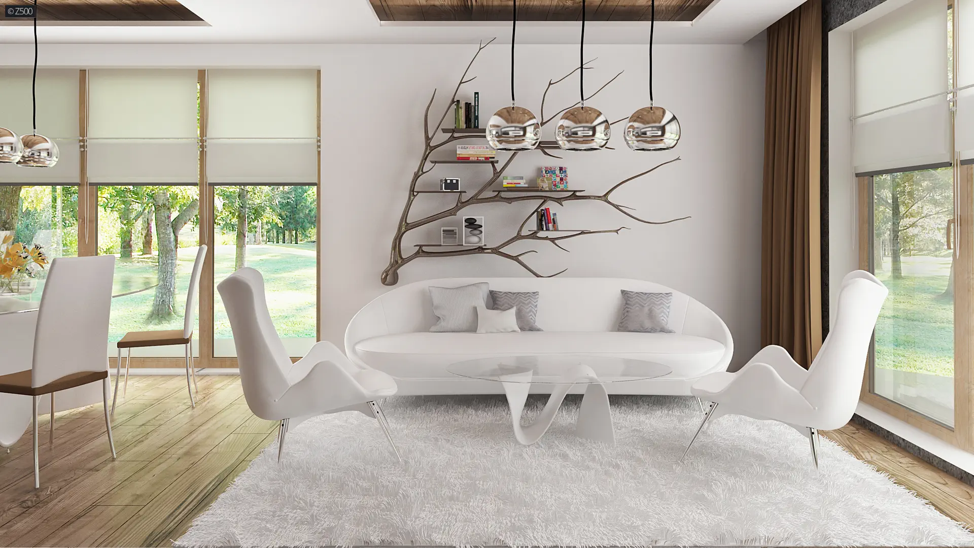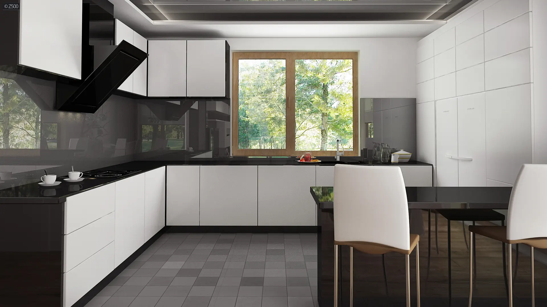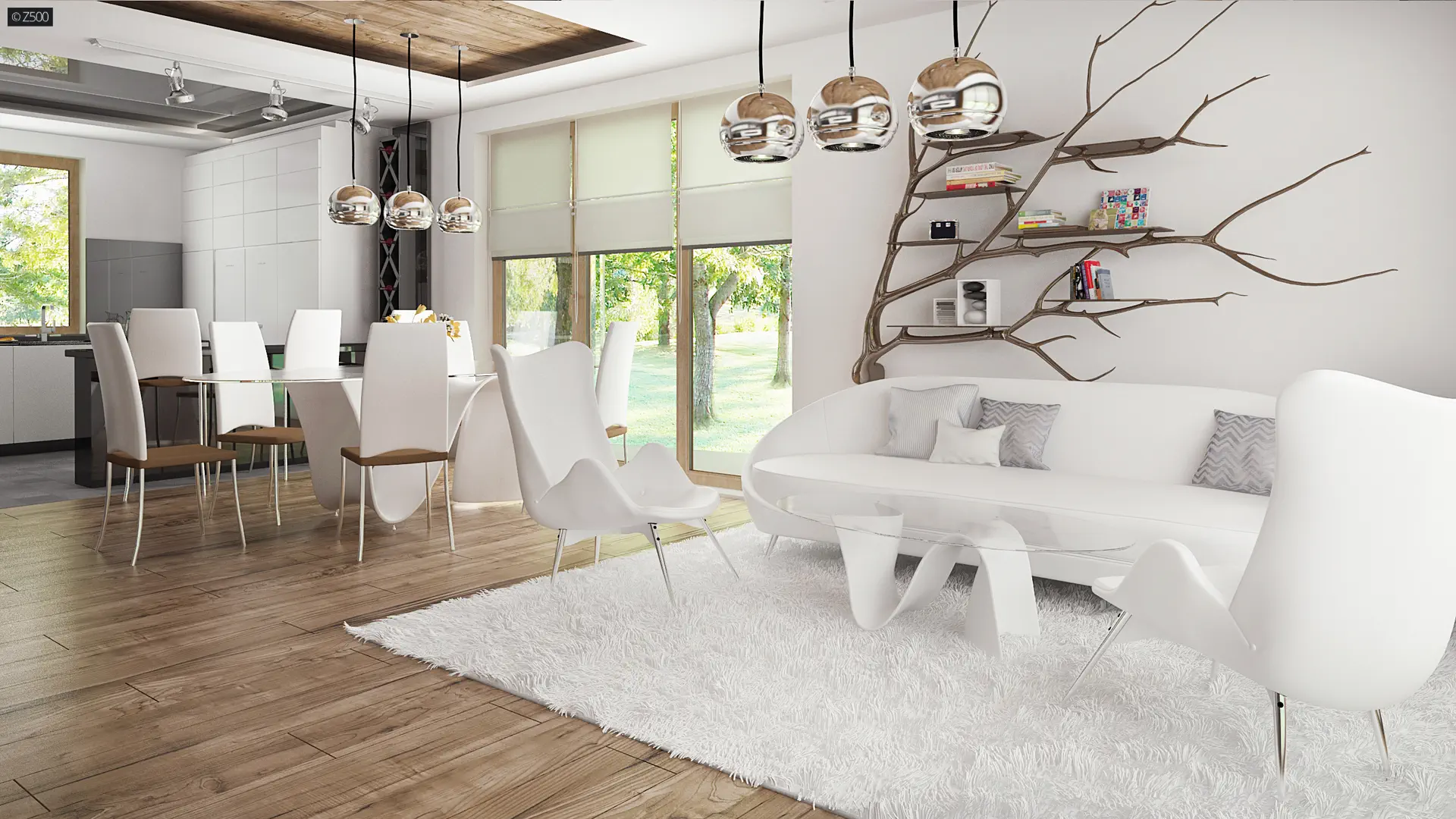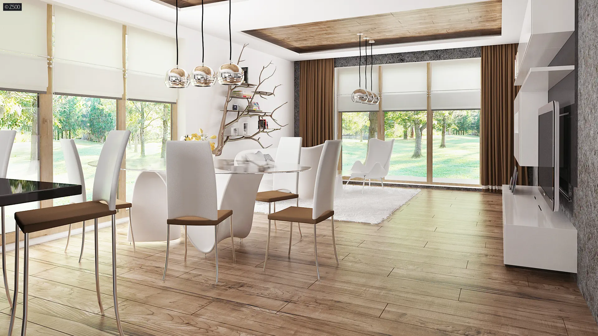 Dom wyróżnia się klarownym układem przestrzennym – dzięki przesunięciu bryły uzyskano wyraźny podział na strefę dzienną i strefę prywatną, co wpływa na wygodę użytkowania oraz większą funkcjonalność wnętrz. Ten architektoniczny zabieg pozwolił również na stworzenie zadaszonego wejścia i przytulnego tarasu od ogrodu, idealnego do relaksu niezależnie od pogody.